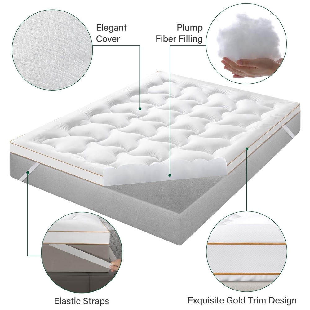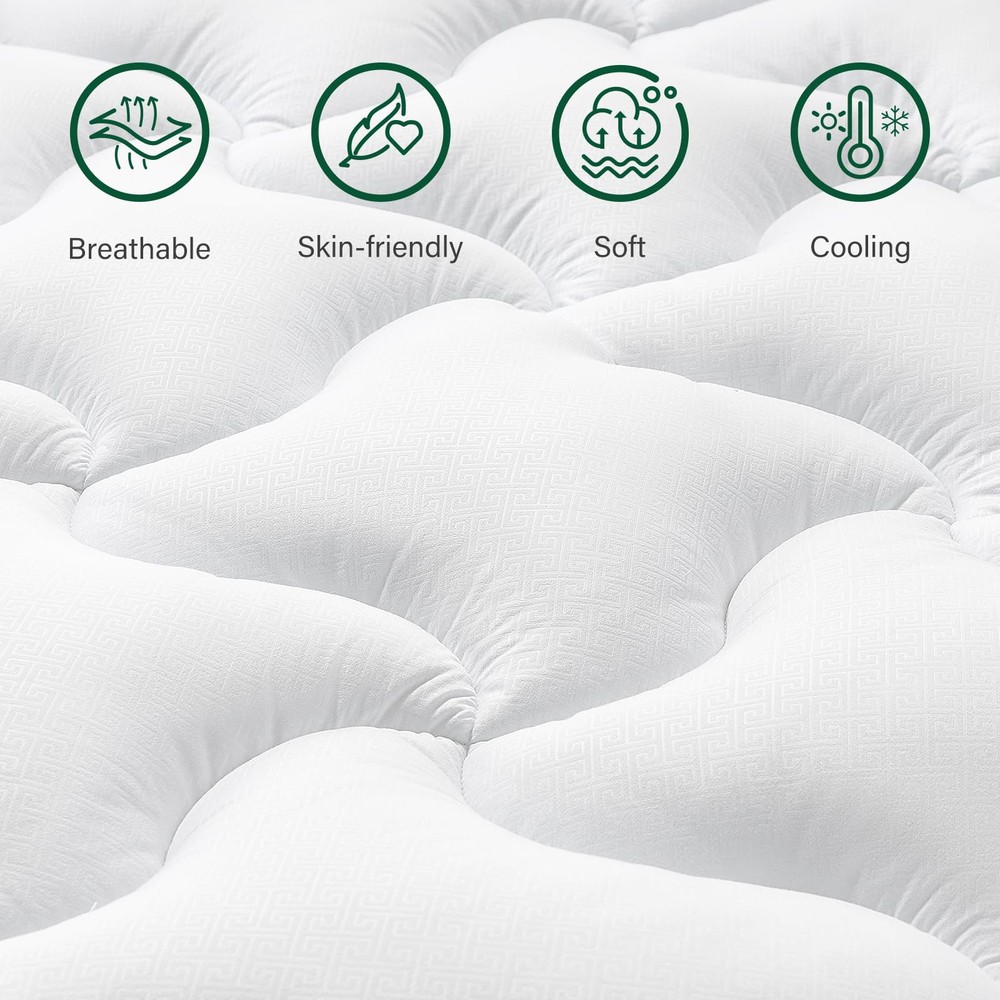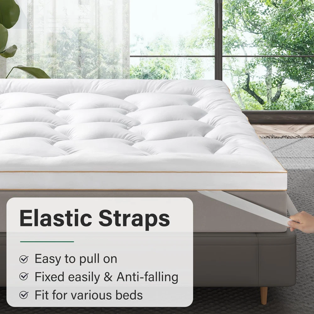 King Size Mattress Pad: 76 x 80 inch, Extra Thick, Soft Feeling New Release! 100% Quality Assured Skin Friendly & Breathable Fabric>: Crafted with comfy fibers, our mattress pad offers a soft and luxurious sleeping surface. We prioritize environmental sustainability by using friendly materials that also promote air circulation. This ensures breathability, effectively wicking away heat to keep you fresh and dry throughout the night Extra Thick & Pillow Top>: Experience unparalleled comfort with our Pillow Top mattress topper. Featuring 1200gsm 3D Snow Down Alternative Filling, it offers a plush yet supportive feel for a restful night's sleep. Designed to cradle your body and promote proper spinal alignment, it caters to all types of sleepers. The unique Cloud-box Quilted design ensures even distribution of fill, preventing clumping and maintaining consistent comfort Soft yet Support & Pressure Relief>: Filled with high-density fiber-filling, our mattress topper provides adequate support for relieving pressure and back pain. Enjoy a comfortable and healthy sleep as the topper conforms to your body, alleviating pressure points in areas such as shoulders, back, and hips. If you're seeking a soft and supportive mattress pad, this is an ideal choice Elastic Straps & Machine Washability>: Crafted from long lasting materials, our pillow top mattress topper withstands daily use and maintains its comfort for the long haul. Its machine washable design offers convenience in cleaning, allowing you to easily keep your bedding fresh and clean. Plus, you needn’t fret about shrinkage or damage from machine washing. With four straps, you can easily put on and fix it without worrying about sliding Revive Mattress & Improve Sleep Quality>: Transform your old mattress with our pillow top mattress topper, a small investment that revitalizes its comfort and support. Whether you're suffering from a hard and uncomfortable mattress or simply seeking to enhance your sleep experience, our topper balances out the wear and tear of an aging mattress, extending its lifespan and significantly improving your sleep quality