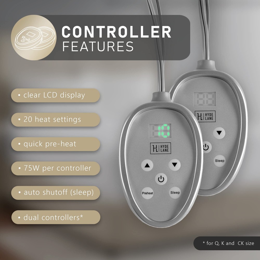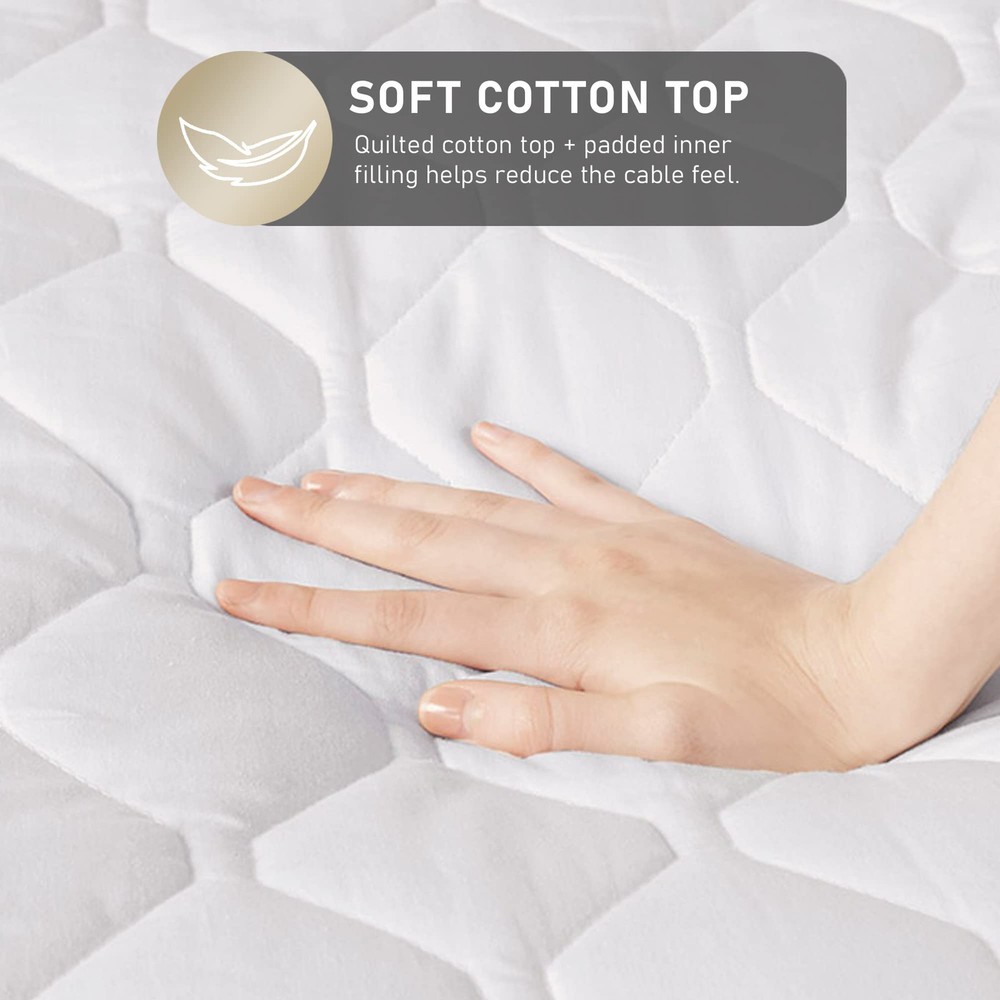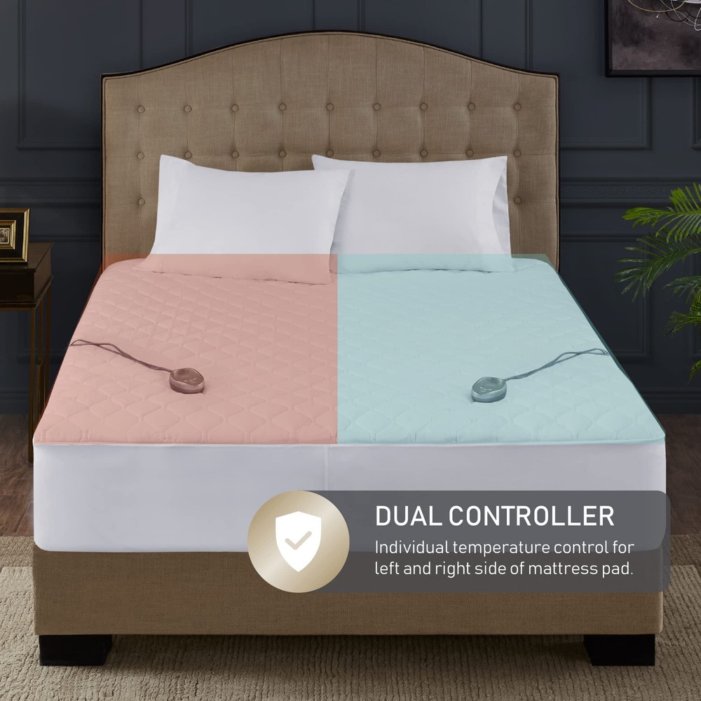Personalized Dual Heating Control: Designed for king-size beds, this heated mattress pad features dual controllers with 20 heat settings, allowing you and your partner to adjust the warmth to your liking. Enjoy cozy, quick preheating for a warm bed in no time. Comfortable & Safe Materials: Made from 100% cotton, this pad provides a soft, breathable surface for ultimate comfort. It’s UL certified for safety and emits no EMF radiation, so you can sleep peacefully. Fast Heating for Immediate Warmth: Advanced heating technology warms up in minutes, eliminating the wait for a cozy bed. The automatic shut-off function ensures safety and conserves energy. Easy Care & Long-Lasting: Machine washable for hassle-free cleaning. The durable construction maintains its softness and quality through multiple washes, ensuring you enjoy it season after season. Relief for Sore Muscles: Ideal for cold nights and muscle relaxation, this mattress pad helps alleviate joint pain and stiffness, enhancing your overall sleep quality and comfort.