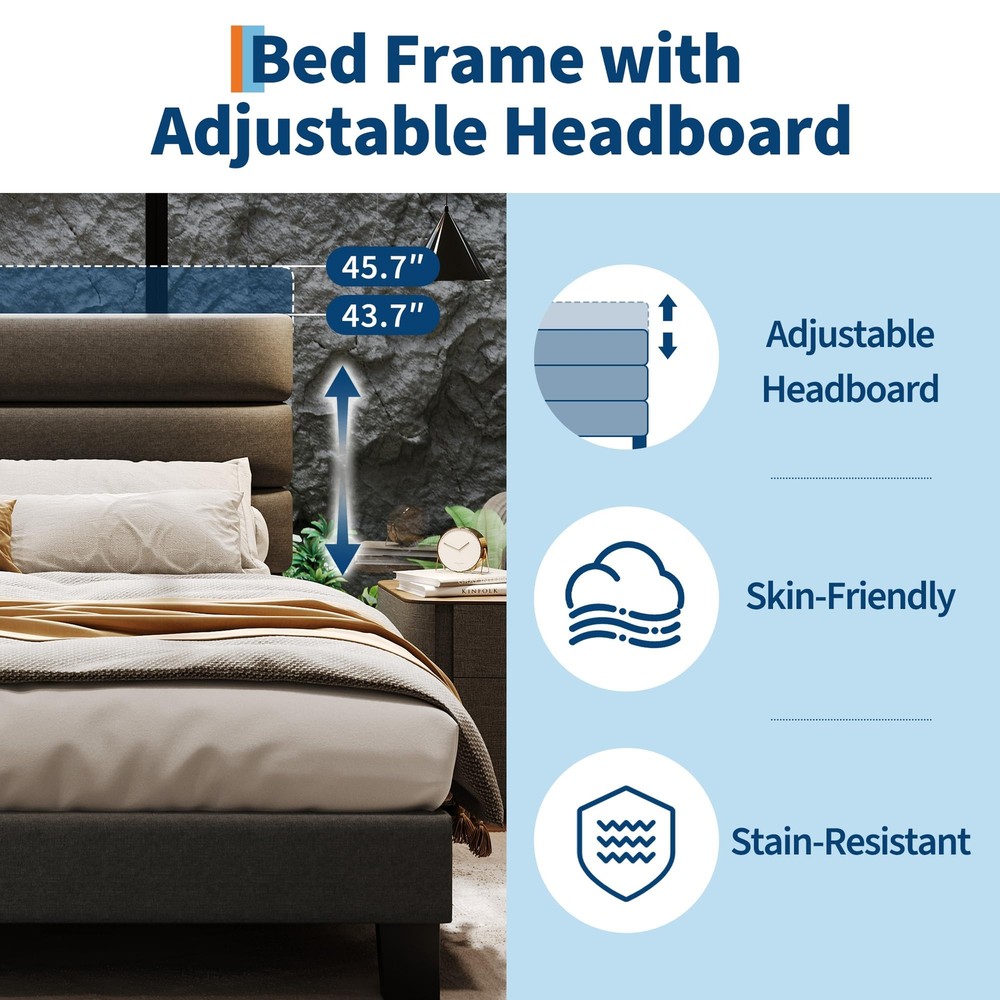 About this item Stylish & Comfortable: King size bed frame features linen upholstered headboard adds elegance and sophistication to your bedroom. High-quality and affordable headboard that looks great and provides excellent support and providing a comfortable backrest for reading or watching TV. Adjustable Headboard: The king bed frame with headboard can be adjusted from 43.7'' to 45.7'' giving you the flexibility to create the perfect sleeping environment for your need. The linen fabric upholstery is designed to be both stain-resistant and wear-resistant. Sturdiness & Noise-Free: Extra-thick heavy-duty feet that provide a stable base and superior stability and support without any wobbling or shaking. Can support up to 1000 pounds of weight. The Eva mute bar prevents noise from friction,ensuring a quiet, shake-free sleep without squeaks or creaks. Wooden Slats & No Box Spring Needed: Design with Veclro wooden slats for fast assembly also the mattress doesn’t slide around on it. Provide the excellent support for your mattress and durability. Memory foam or spring mattress without the need for a box spring. Most important thing to note is support your mattress and prevent it from sagging or shifting. Quick Assembly: The king bed frame with headboard with headboard ships in one box and is easy to follow the simple assembly instruction with no special tools required. The process is straightforward and hassle-free, you can set it up in no time. Product Description Previous page Next page Adjustable Headboard 4.8'' Under Bed Space 4.8'' for Storage Space Previous page Next page Soft Touch Headboard Headboard & Feet Veclo & EVA Bar Special Feature Adjustable Headboard Adjusted From 43.7'' to 45.7'' Veclo Design for Quicken Install Wood Slats The Mattress Doesn’t Slide Around on It Heavy Duty Feet Max. Capacity 1000 Lbs Payment Delivery details Terms of sales About us Contact us Payment We accept payment either via PayPal or any of the following credit cards; Visa, MasterCard, Discover, and American Express. Delivery details 1. We will delivery out at the handing time when we receive the payment. 2. The delivery time is 3-5 business days to US by usually time.The parcel maybe delay 1-2day of the weekend.Due to the bad weather,Holidays,Hot Season ect.the parcel maybe delay,If you have any problems,mssage us,we will try our best to solve it. 3. We ship to your eBay address. Please make sure your eBay address is correct before you pay. 4. If you want to change the shipping address,message us before our send out. Terms of sales If you are not satisfied with the item for any reason, please do not quick to leave negative/neutral feedback even open request and case without any communication with us. We devote ourselves making EVERY CUSTOMER in 100% Satisfactory and resolve any problem. Thank you for your understanding and recognition,we are always leave positive feedback to all our customers. About Reply: All replies will be sent to your email box, if you do not get response within 24 hours (Sat. & Sun. excluded) please check your eBay My Messages in case that our emails will be filtered automatically by your settings. About us automobilee-01 is a brand new store but we are one of North America’s top online suppliers of specialized, high-quality aftermarket online retailers and suppliers, committed to developing new markets. We primarily offers tool sets, auto parts, home goods, etc..With over 20 years of product selection and manufacturing experience, we delivers unparalleled quality, value, service and satisfaction. Our highly-trained, professional staff offer in-depth knowledge and personalized assistance for customers worldwide. Providing our customers with a simple, hassle-free experience with best-in-class customer service is more than a goal. Contact us Any problem please rest assure to contact us by eBay message first. We will reply you as soon as we can. We will deal with it within 24hs on working days. Brand Unbranded Compatible Mattress Size King Frame Material Wood, Metal, Fabric Type Bed Frame Features Adjustable Headboard, Durable Color Gray Mattress Included No Assembly Required Yes Style Contemporary/Modern Shape Rectangular MPN Does not apply Care Instructions Easy Care Room Bedroom Country/Region of Manufacture China Item Length 82.7'' Item Width 80'' Item Height 45.7'' Department Adults Footboard Height 8.6'' Product Dimensions 82.7"L x 80"W x 45.7"H Upholstery Fabric Fabric Manufacturer Warranty 5 Years