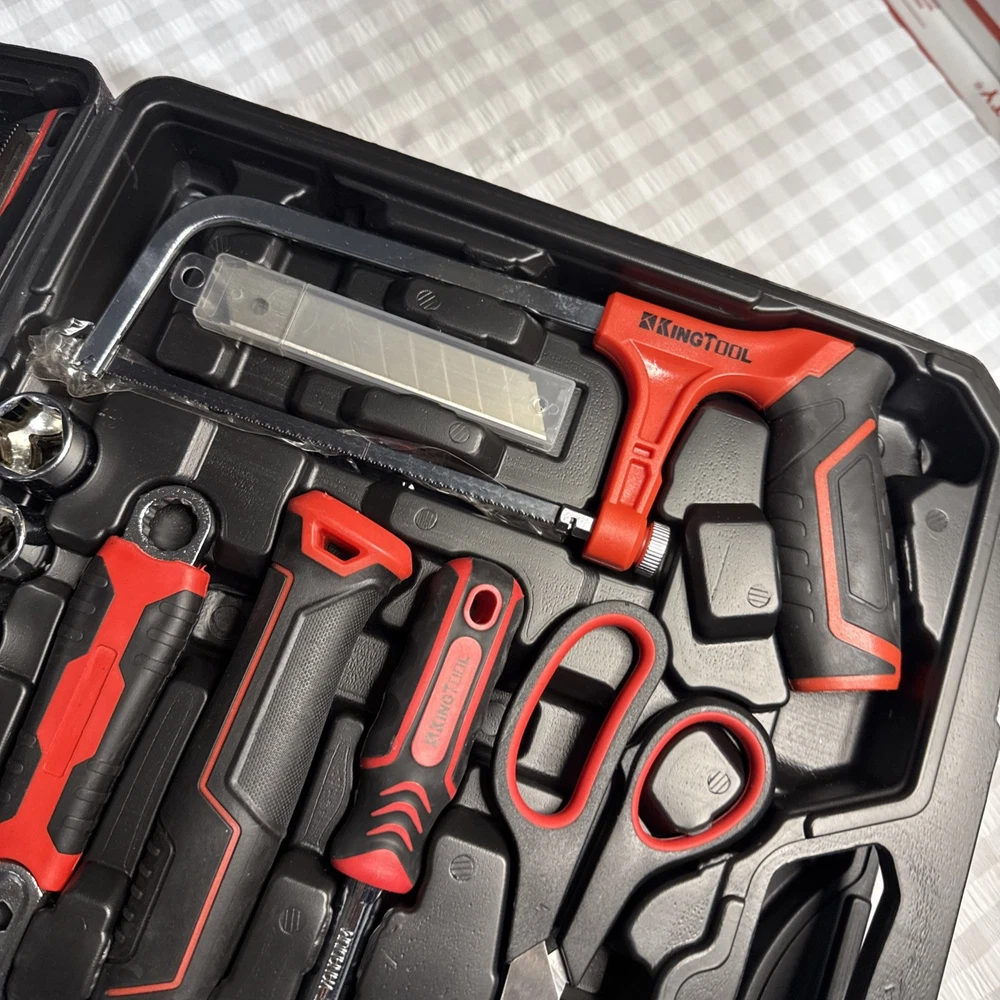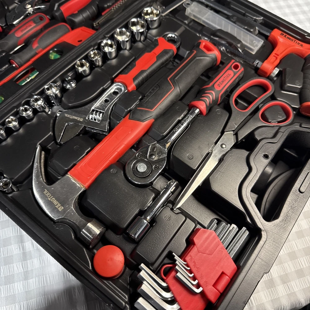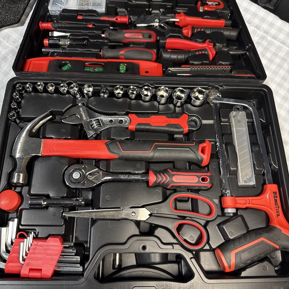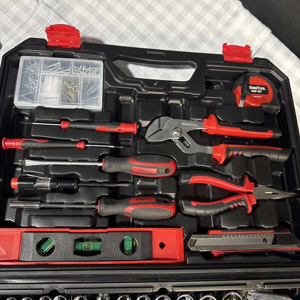 The KingTool 265 Piece Tool Set includes a wide variety of household and DIY tools, such as hammers, screwdrivers, wrenches, power drills, and pliers. The tools are organized in a hard case for easy storage and transport, and all pieces are included in the set. With a metric system of measurement and a mix of both metric and imperial units, this set is suitable for a range of projects around the home or in the workshop. The black and red case adds a stylish touch to this comprehensive tool collection.