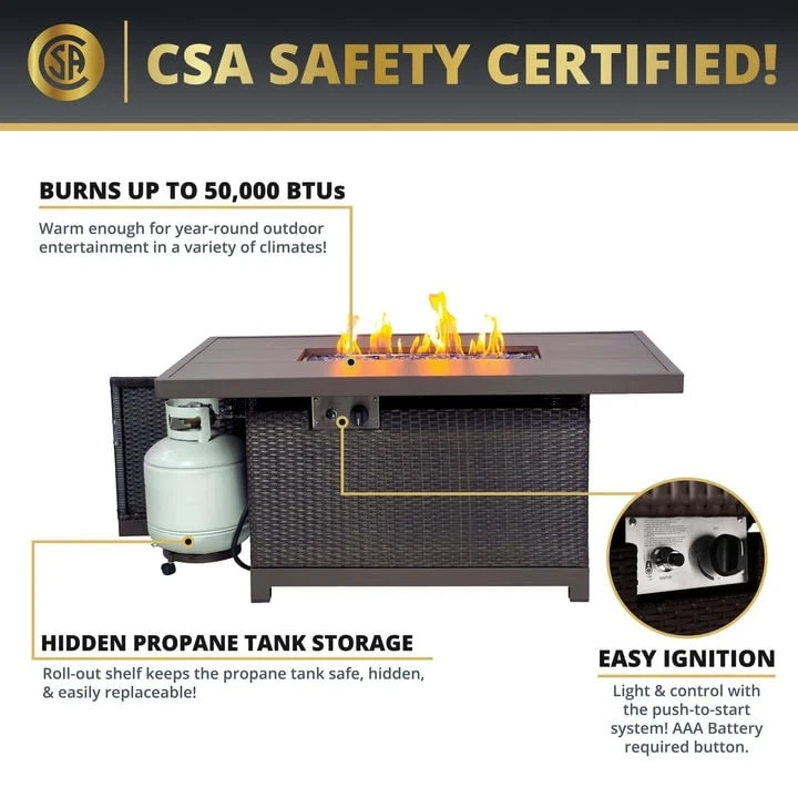 Upgrade your outdoor space with the Novi 52" Rattan Wicker Fire Pit Table by Kinger Home. This stunning centerpiece is the perfect balance of modern design and durable materials. Made with handwoven synthetic rattan wicker and powder-coated aluminum, this lightweight fire pit table is perfect for all weather conditions. The 26-inch fire pit in the center boasts a stainless-steel burner that provides 50,000 BTUs of heat, ensuring a cozy fire on chilly nights. When not in use, the fire pit can be easily converted into a dining or coffee table using the included burner lid. With the push-button spark ignition system and propane hose and regulator, the Novi Fire Pit Table is incredibly user-friendly, while the included accessories like crushed glass fire rocks and a glass wind guard add a Free Shipping Over $49.99* Details Kinger Home Novi Rattan Propane Gas Fire Pit Table Aluminum Frame - 52-Inch Product Description: Upgrade your outdoor space with the Novi 52" Rattan Wicker Fire Pit Table by Kinger Home. This stunning centerpiece is the perfect balance of modern design and durable materials. Made with handwoven synthetic rattan wicker and powder-coated aluminum, this lightweight fire pit table is perfect for all weather conditions. The 26-inch fire pit in the center boasts a stainless-steel burner that provides 50,000 BTUs of heat, ensuring a cozy fire on chilly nights. When not in use, the fire pit can be easily converted into a dining or coffee table using the included burner lid. With the push-button spark ignition system and propane hose and regulator, the Novi Fire Pit Table is incredibly user-friendly, while the included accessories like crushed glass fire rocks and a glass wind guard add a touch of elegance. A PVC weather cover is also included to protect it from the elements. Features: All-in-one complete set with fire ring, fire pit lid, fire pit cover, fire pit wind guard, and 10 pounds of crushed fire pit glass Elegant wicker fire pit details handwoven from synthetic resin for weather-resistant use Aluminum tabletop powder coated to prevent rusting or fading CSA-certified for residential and commercial use with 50,000 BTUs for comfortable use during cold months Glass wind guard and 10 pounds of crushed fire glass for decorative finish and improved circulation Convenient hideaway tank holder compatible with standard 20 pound propane tank Dimensions52" L x 32" W x 24.6" H, 75LB Additional Details: User-friendly push-button spark ignition system with simple and convenient knob control during use Includes 10-foot propane gas hose, PVC firepit cover, and user manual.