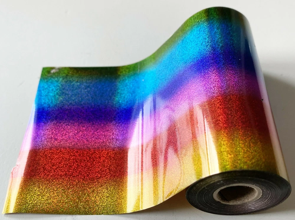 Add Multi-Color Holographics to Your Hot Stamping! This foil is cut and rolled from large master rolls, to 3 inches wide x 95 feet in length, on 1/2" cores, so they will work in a canister (not included) with the Kingsley auto foil feeder. Remember that most rolls from Kingsley, Howard, Jason, etc. are less than half as long at 40 feet; ours are 95 feet long. Also, foil rolls that are 200 feet long, or longer, will not fit the canisters with the auto feeder. If you plan to use the Kingsley foil-feeder assembly and don't have a canister tube to hold the foil, you may order this pack with a canister at eBay item # 254746012984 . OR, if you need just a canister, order eBay item number 251440623971 . For more information about the canister, see "Canister Replacement Tube" below.* Mosaics, Rainbows, and Holographics (virtually all foils with designs) are considerably pricier than single colors foils, but you'll find that these prices are still very low. *************************************************************************************************************************************************************************** For this offer choose any three (3) rolls of these Multi-color Holographic foils, 3 inches wide, 95 foot long; you may choose any assortment of 3 from the 6 styles. If you want all 6, just order two assortments. P lease indicate your preferences in a note to me in eBay messaging immediately after ordering, or in Buyer's Note during checkout . I f I don't hear from you the day of your order, I will ship one each of: Spectrum Shattered Glass Holographic (9525), Spectrum Micro Glitter Holographic (CO-02) and Diagonal Stripe Holographic (SL-X2). ABOUT THESE ROLLS 1) Spectrum Micro Glitter Holographic (CO-02) - all the rainbow colors in spectrum order with a micro glitter hologram. The spectrum repeats every 3 inches. 2) Diagonal Stripe Holographic (SL-X2) - all the rainbow colors in spectrum order, arranged diagonally. The pattern repeats every 4 inches). 3) Spectrum Shattered Glass Holographic (9525) - a brand new gorgeous foil, combining the seven spectrum colors with a hologram. The spectrum repeats every 1¼ inches. 4) Spectrum Rainbow Stripe with Seamless Hologram (SL-Z3). The pattern repeats every 4 inches and the seamless hologram is perpendicular to the stripes. 5) Spectrum Shattered Glass Holographic (CO-01) - combines the seven spectrum colors with a hologram. The spectrum repeats every 3 inches. 6) Spectrum Shattered Glass Holographic (SL-Z4) - combines the seven spectrum colors with a hologram. The spectrum repeats every 4 inches. • All foil has been re-rolled from large master rolls onto 1/2 inch cores (unless otherwise requested - see Ordering the Right Foil for your Foil Feeding System below) to work on Kingsley, Howard, Jason and most any hot stamping machine. • Beware of purchasing foil on 1 inch core (frequently offered on eBay); foil on 1 inch core cannot be used in the foil feeders of most Kingsley M-50s, M-60s and M-75s. Foil on 1 inch core is generally designed for use on the M101. • All rolls are 3 inches wide and 95 feet long, more than twice as long as the old standard 40 foot long Kingsley foil rolls, but for about the same price. SPECS • For hot stamping at about 250° on most surfaces • All rolls fit our canister replacement tube (not included) • Brand new, recently produced, fresh foil • Package of 3 rolls, your choice of any assortment of 6 styles • 3 inches wide x 95 feet long foil on 1/2" (or 5/8" or 1") core • $7.99 per roll • Compare at $19.00 per roll * CANISTER REPLACEMENT TUBE These are brand new rolls of brilliant gold foil, ideal for hot stamping leather and plastic. Plus, it is a 100 foot roll on a 1/2 inch core and will fit most of the canister replacement tubes that have been produced recently. Kingsley produced 40 foot foil rolls in canisters to function with the automatic foil feeding system included in virtually every Kingsley M-50 machine and many M-60 units. Since these canisters are no longer in production, several specially designed tubes have appeared to replace the canisters and allow the automatic foil feeder to work with any foil rolls, including ours. These 95 foot rolls of foil are on 1/2 cores, and the maximum inside diameter of these new tubes is 1 3/8," so they will fit inside the tubes and work with the auto foil feed system. If you need one of these canister replacement tubes for Kingsley's auto foil feeder, you should order this package with the canister tube (eBay item number 254746012984 ). ORDERING THE RIGHT FOIL This foil will work on virtually any hot stamping machine at about 250°, but if you want to use it in an auto feed foil system, you will need to do a little research into your machine and order foil accordingly. If you have a Kingsley machine, you can take advantage of my research, explained here. Kingsley developed 3 distinct foil feeding systems through its production history, detailed below. 1. IF you have a Kingsley M-50 you are likely using the canister system. For many years Kingsley rolled its foil on a 1/2" core and enclosed it in a cardboard canister. The canister was highly protective and most of it is still good even though it may be 50 years old. This listing is for NEW foil for this canister system, but foil in canisters is a thing of the past. So there must be another way to hold the foil; hence the canister replacement tube. If you don't have one and you want to use Kingsley's auto foil feeder, you should order this foil package with a canister tube (item number 254746012984 . The canister system is explained more fully above. 2. IF you have a Kingsley M-60 or M-75 with the EZ FOIL ADAPTER, using the white "dog ears" (that's what Kingsley called them) to hold the foil. Just request your foil to be rolled onto a 5/8" core; there's no extra charge for this service and a re-usable set "dog ears" will be supplied with your order. By the way, "dog ears" are no longer in produc