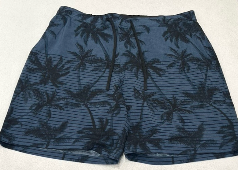 Kirkland Signature Men's Stretch Swim Shorts Size: Medium Color: Blue Content: Shell: 87 % Recycled Polyester / 13% Elastane Liner: 90 % Recycled Polyester / 10% Elastane Pocket Liner: 100% Polyester