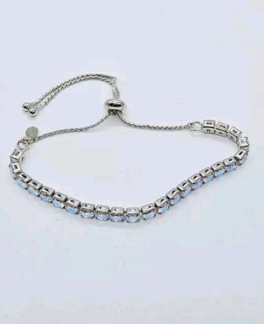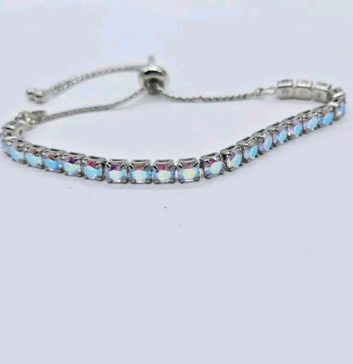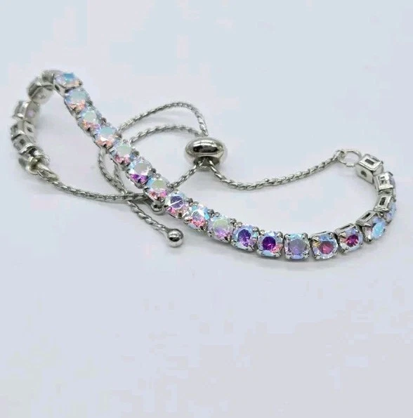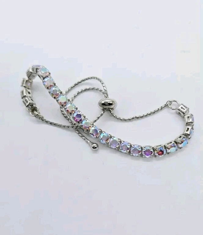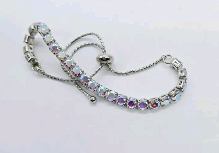 Made up of faceted aurora borealis stones that reflect flashes of rainbow colors, this bold and beautiful Bracelet can be worn casually by day or in a formal setting at night. From Kirks Folly. Plated Silver tone Aurora borealis faceted, polished finish Pull Closure or Expansion Measures approximately - One size should fit most Imported