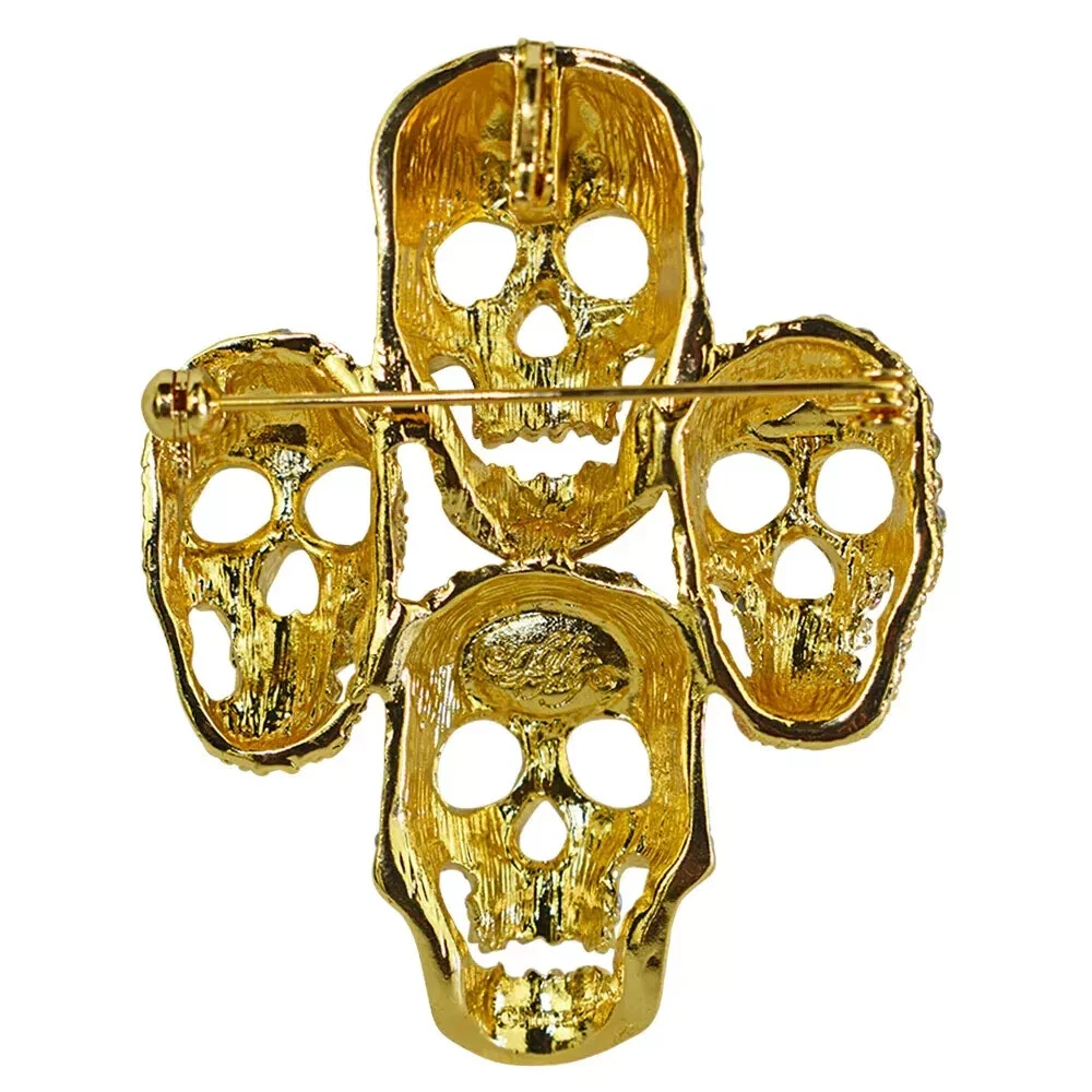 Wear the sparkling crystal aurora borealis encrusted skull pin as a powerful symbol of strength, wisdom, and mortality. The fashion statement made by the four skull pin is powerful and undeniable. Plated Goldtone. Measures approximately 2" wide x 2 1/2" long.