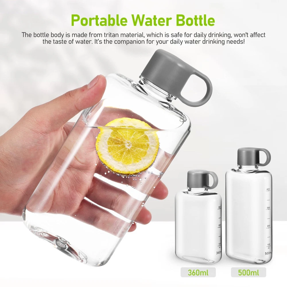Portable Flat Water Bottle:Comes with 1pc water bottle(360 ml) and 1pc water bottle(500 ml). The body of this water bottle is totally clear for easy checking the amount of water and added fashion elements Plastic Travel Water Bottle:The bottle body is made from tritan material, which is safe for daily drinking, wont affect the taste of water. Each water bottle is carefully made with attention to detail, comfortable to the touch Flat Water Bottles For Travel:With the tightly sealed lid, the water bottle wont leak even if its upside down, keeping your bags dry. These water bottles are fit for backpacks, purse, handbags and even your pockets, easy to carry around Fitness Bottle: bottle can be carried with you, only takes up a small space, and has a cover, so you dont need to worry about spillage or leakage. Travel bottle very suitable for your schoolbag, backpacks, briefcase, handbag etc Portable Water Bottle:Reusable water bottle is for todays busy but healthy lifestyle. Also an excellent present for your family, friends, lover, etc. Drink with style and enjoy a healthy life