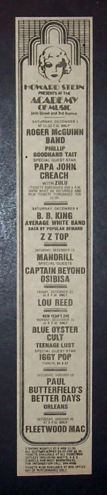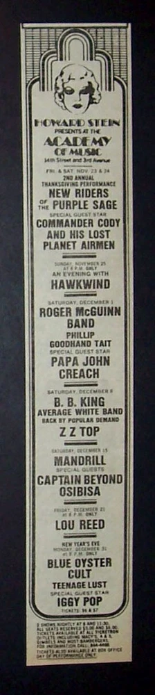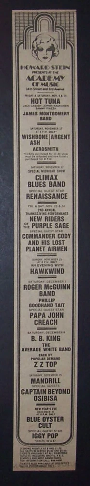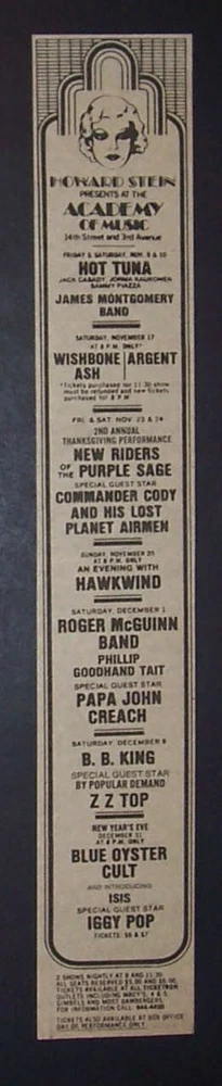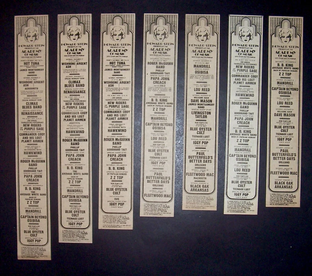 WELCOME! I have thousands of vintage ads as well as other rare rock memorabilia. I sell only original ads from original magazines and newspapers - not copies, reprints or reproductions. All released at the time of the tour, album, movie or event. 100% ORIGINAL GUARANTEED. This item is NOT a Flyer - Poster - Handbill - CD - DVD - LP - VIDEO. This auction is for a meticulously clipped ad from a newspaper or magazine. The pictured ad is on one side and miscellaneous publication content is on the reverse. See details below for year published, size and condition. BUY MULTIPLE ADVERTISEMENTS AND PAY JUST ONE SHIPPING FEE! Kiss Iggy Pop Blue Oyster Cult NY Eve Academy Of Music 1973 Concert Ad Lot (7) Killer New Years Eve concert at the Academy of Music with Kiss opening the show. SEVEN ADS that ran through the month leading up to the show. Though not listed in the ads, this show was Kiss' professional industry debut (for which they earned $250) and marked the first occasion they performed with their iconic 4' x 10' lighted "KISS" logo The main acts played two shows, one at 8PM the second at 11:30. KISS was only invited to perform at the first. Gene set his hair on fire while breathing fire. Iggy Pop and the Stooges played songs from Raw Power with Blue Oyster Cult headlining. Rolling Stone magazine would go on to write a review of the show in their magazine later in 1974. Date: 1973 Category: Original Newsprint Ad Ad Size: Roughly Varies 2" x 11" to 2" x 14" Condition Grade: Excellent Condition Description: Typical age related wear ~ Some ads may appear warped or slanted. This is due to the photography. All ads are cut sharp & neat ~ With the cost of vintage rock posters an flyers skyrocketing many collectors are priced out of the market. Vintage advertisements (ads/adverts) offer an affordable alternative. These original ads look great framed and often have significant rock n' roll history. These advertisements ran in newspapers, magazines and various publications on various paper stocks from glossy magazine paper to newsprint. These RARE ads were often created for a limited time, sometimes running only for a single issue. THESE LIMITED PRINT RUN ADVERTISEMENTS ARE BECOMING HARDER AND HARDER TO FIND! I SELL ONLY ORIGINAL ADS FROM THE ORIGINAL MAGAZINES AND NEWSPAPERS, NOT COPIES, REPRINTS OR REPRODUCTIONS. ALL RELEASED AT THE TIME OF THE TOUR, ALBUM, MOVIE OR EVENT. 100% ORIGINAL GUARANTEED. ------ Powered by SixBit's eCommerce Solution