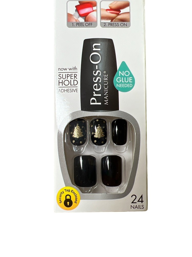 Kiss Press On Nails Shiny Black with Gold Glitter Christmas Tree Accents Short.