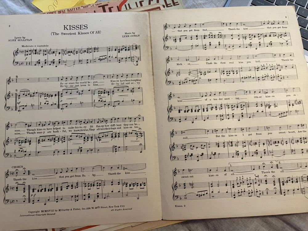 THIS LOOKS BRAND SPANKING NEW ACCEPT FOR PAPER AGING. PERFECTLY MINT. The product is a vintage sheet music titled "The Sweetest Kisses of All" by Cowan and Sullivan, published in 1918 by McCarthy and Fisher. It is designed for an orchestra ensemble with piano accompaniment, catering to intermediate-level musicians. The sheet music originates from the United States and falls under the genre of Musicals, providing a nostalgic and charming piece for musicians and collectors alike.