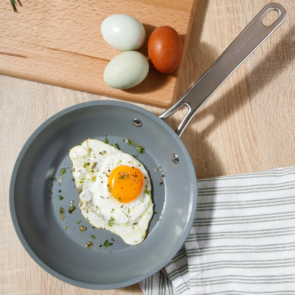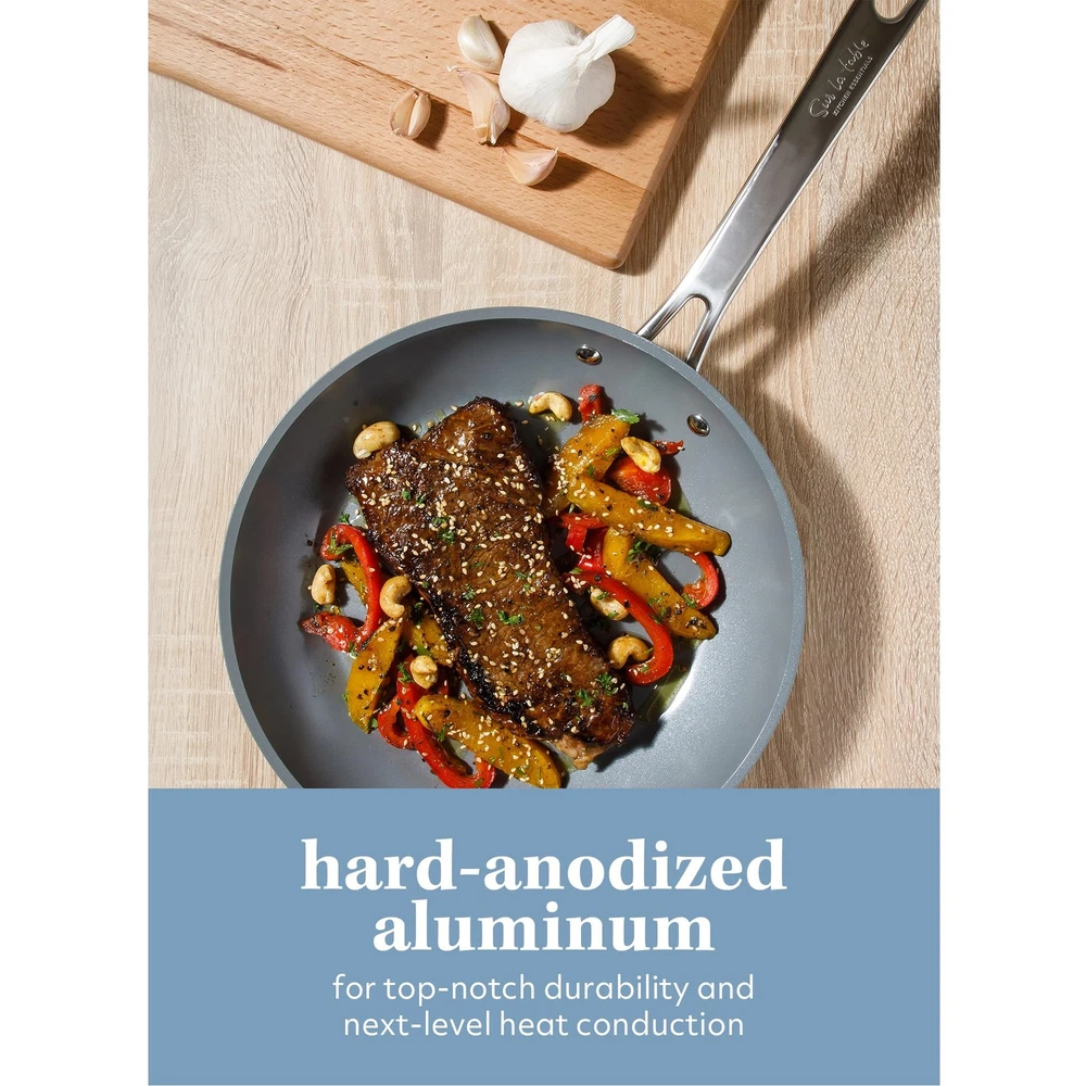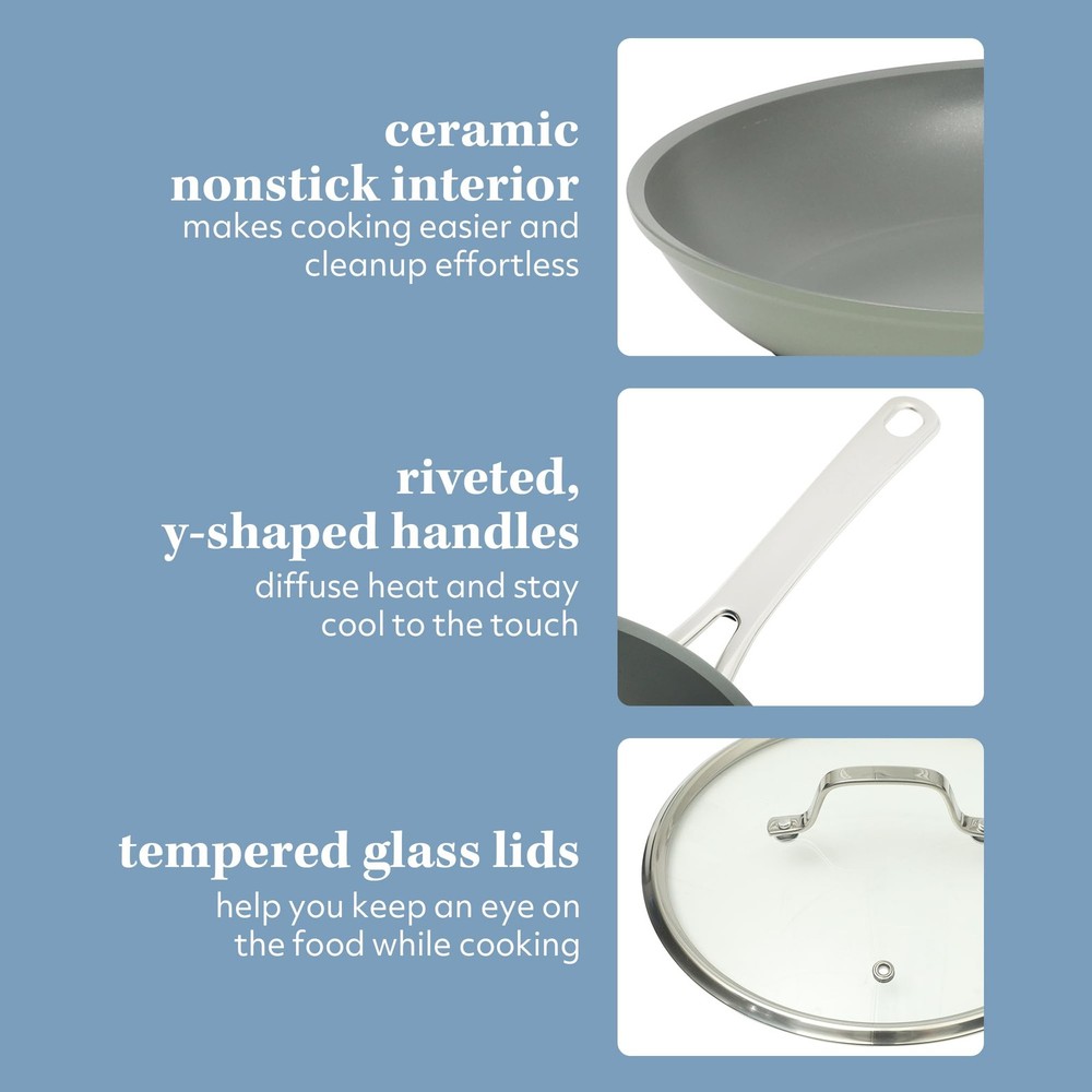 WHAT'S IN THE BOX: two frying pans (8 inches and 10 inches), two saucepans with lids (1.4 quarts and 2 quarts), one 3.3-quart sauté pan with lid and one 4.85-quart dutch oven with lid HAPPINESS IS HOMEMADE: Kitchen Essentials is all about making and sharing good food at home together. from preparing the freshest ingredients to the beautiful mess of cooking a family recipe, we encourage you to roll up your sleeves, mix up a happy kitchen, and set the table for free-flowing conversations over an easy, generous, and crowd-pleasing meal. CERAMIC NONSTICK COOKWARE: easy-release interior makes more room for healthier cooking options and less time for cleanup. HARD-ANODIZED ALUMINUM COOKWARE: tougher than traditional aluminum cookware, these pots and pans provide top-notch durability to get through the busiest times in the kitchen. whether you are cooking up a storm or casually making a one-pot dish, this cookware set delivers next-level heat distribution to ensure that any meal comes out evenly cooked and worthy to eat seconds on. INDUCTION-FRIENDLY: works on induction, gas, electric, halogen, ceramic, and glass stoves