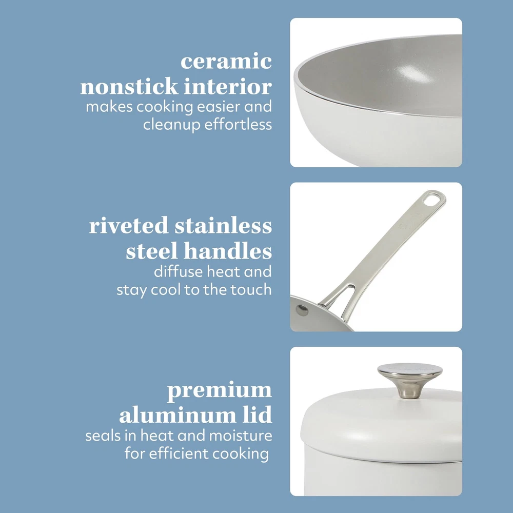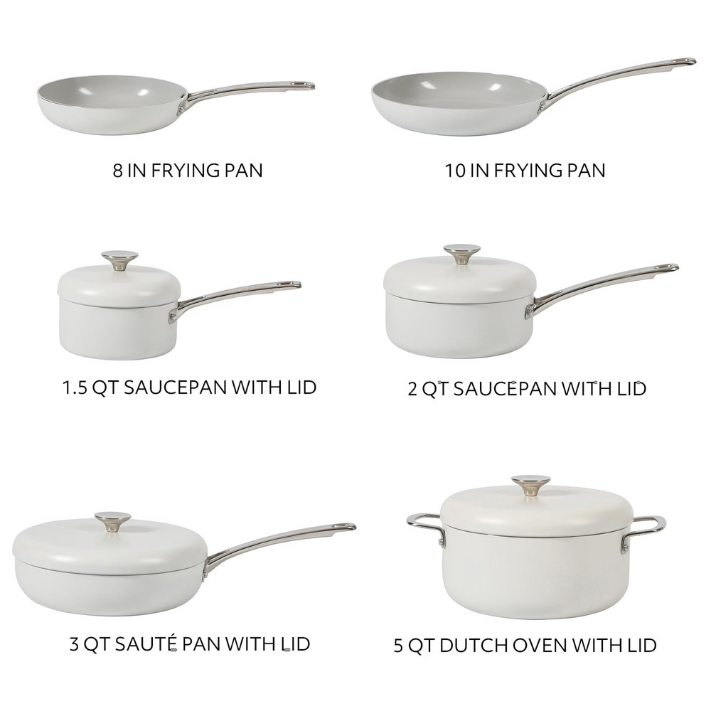 WHAT'S IN THE BOX: two frying pans (8 inches and 10 inches), two saucepans with lids (1.5 quarts and 2 quarts), one 3-quart sauté pan with lid and one 5-quart Dutch oven with lid HAPPINESS IS HOMEMADE: Kitchen Essentials is all about making and sharing good food at home together. from preparing the freshest ingredients to the beautiful mess of cooking a family recipe, we encourage you to roll up your sleeves, mix up a happy kitchen, and set the table for free-flowing conversations over an easy, generous, and crowd-pleasing meal. CERAMIC NONSTICK COOKWARE: easy-release interior makes more room for healthier cooking options and less time for cleanup. HEAVY-GAUGE ALUMINUM COOKWARE: durable aluminum pots and pans cook evenly to serve happy and homemade meals every day. they feature a rounder and wider shape, similar to a traditional caldero, to faciliate smooth and easy stirring. INDUCTION-FRIENDLY: works on induction, gas, electric, halogen, ceramic and glass stoves