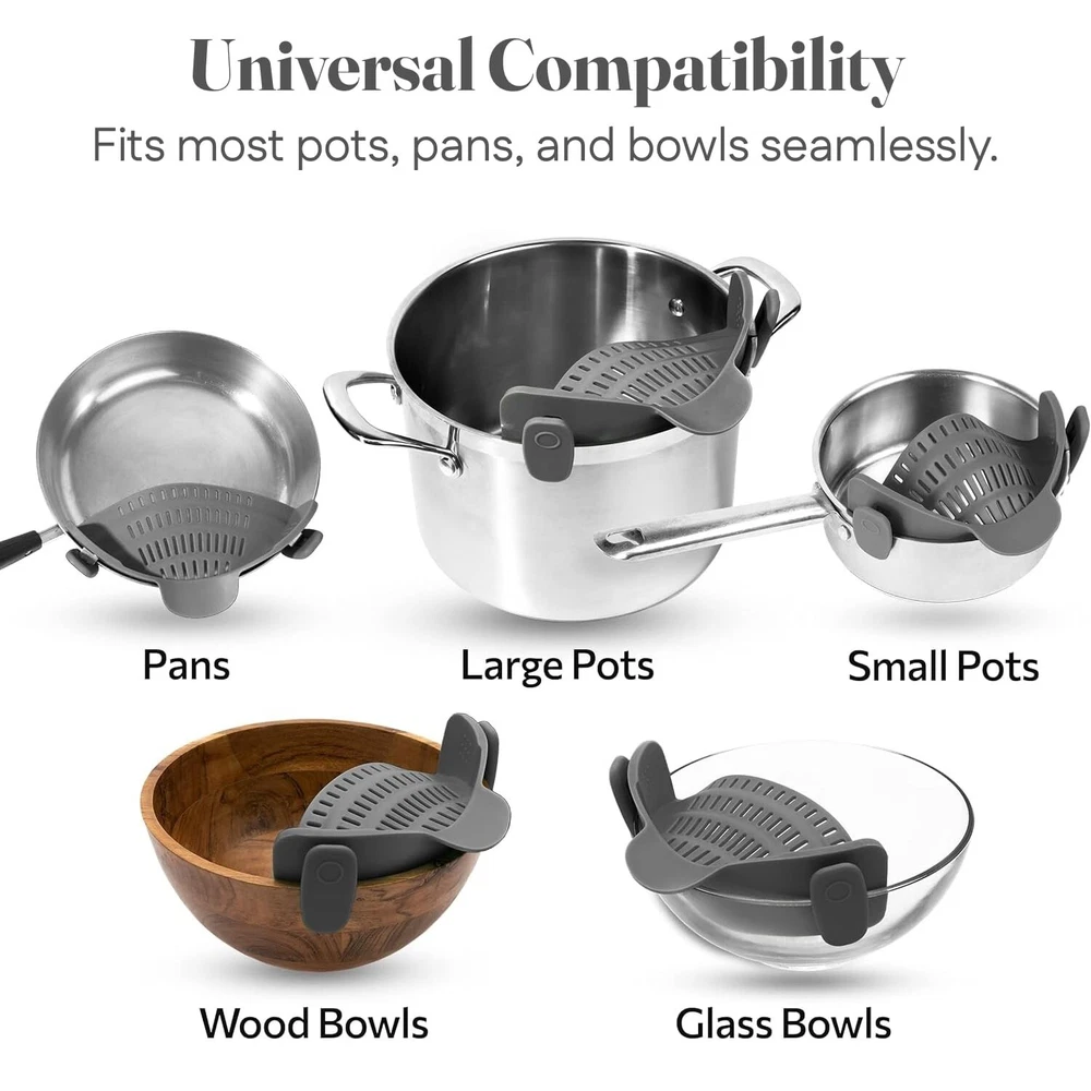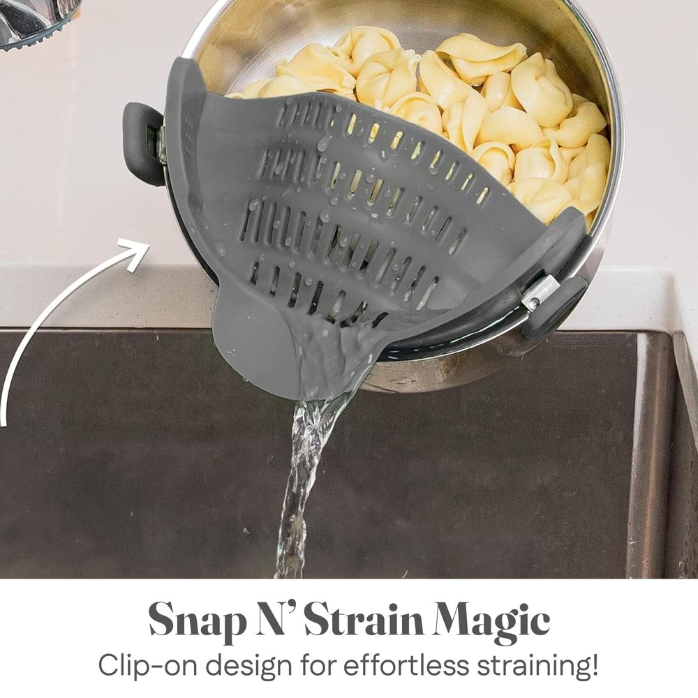 About this item Plastic Hands-Free Straining: Clip on strainer easily snaps onto pots, pans, and bowls; keeping your hands free; great addition to your strainers and colanders collection; simple for draining pasta or veggies Compact and Space-Saving: Unlike traditional strainers, this collapsible strainer clips on and takes up minimal space. It’s the go-to solution for limited kitchen storage or camping trips Heat Resistant: Made from heat-resistant silicone; it can handle temperatures up to 400°F/230°C. This pot strainer stays strong, giving you a sturdy grip while draining hot foods without bending Compatible with Most Cookware: Specially designed to attach to most pots, pans, and bowls; this clip-on strainer for pots is versatile. Its universal design suits any kitchen task, big or small Durable and Dishwasher Safe: This pasta strainer is crafted from silicone; this kitchen tool is sturdy yet flexible, making draining easy. Simply rinse or pop it in the dishwasher for easy cleaning Style Snap On Product Dimensions 10"L x 5"W x 2.5"H Material Type Silicone Is the item dishwasher safe? Yes We offer FAST AND FREE SHIPPING on all USA orders We usually handle the order within 4 days (often 2-3 days), and it usually takes 3 days for delivery. It means you will receive your order no later than 7 days after payment. We use FedEx, USPS or UPS ground Please note that slight color differences may be due to differences in lighting and computer screen resolution. Local pick up is not available at the moment We DO NOT offer shipping option to PO BOX address, warehouse address, freight company address. If you have any queries, Please give us the opportunity to resolve the issue before leaving any negative feedback :(. We usually respond within 24 hours. Thanks for shopping with us. We appreciate your business! Have a nice day.