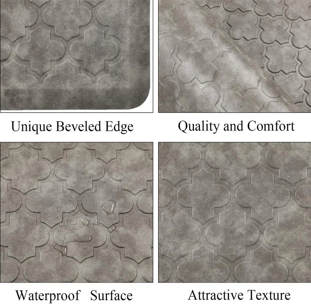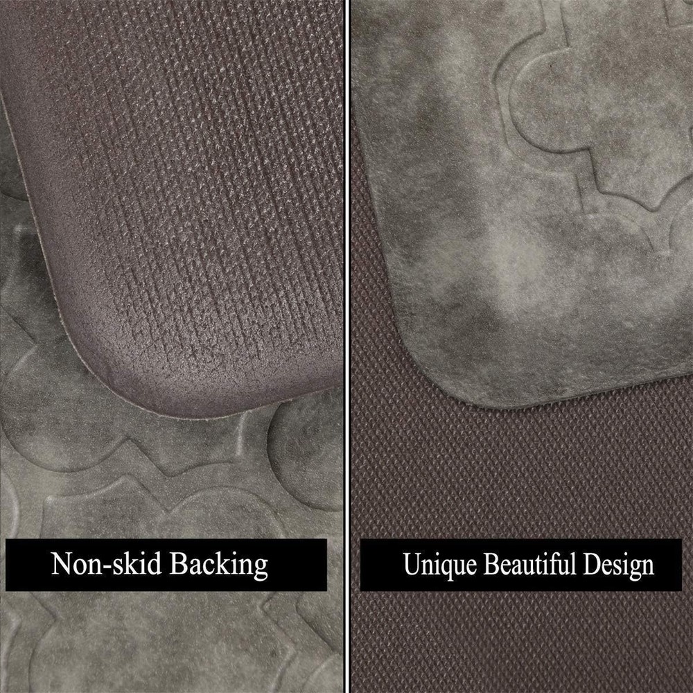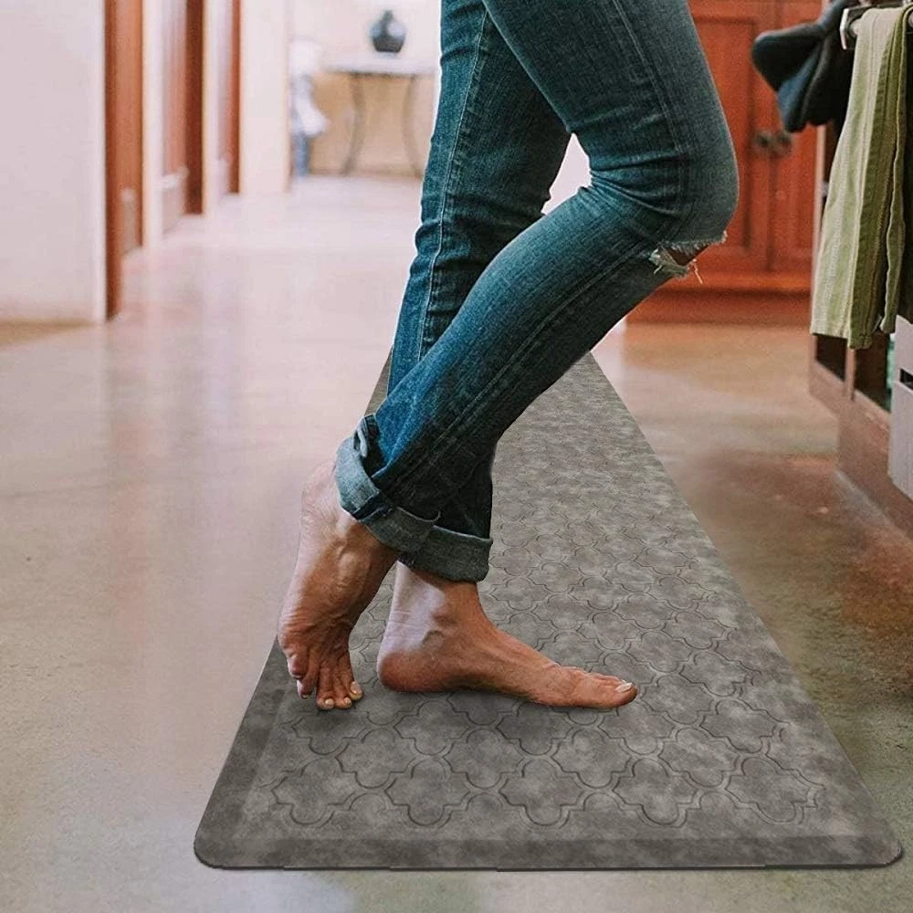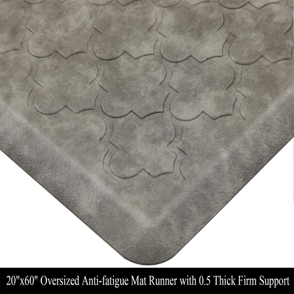 About this item 1/2in Thick Cushioned Antifatigue Floor Mat: HEBE anti-fatigue kitchen floor mat provides thick, cushioned support to help improve circulation and posture alleviates stress, to ensure that you are able to stand comfortably while working in the kitchen or at any work station. Perfect for hair stylists,cooks and anyone who stands for long periods of time; Comfort Standing Mat: The large anti fatigue laundry room rug runner measures 20x60inch (51x152cm). HEBE ergonomically engineered antifatigue kitchen rug runner is made of premium PVC and thick gel foam.The mat is constructed with premium strength material to ensure that it will keep shape with extended and heavy use. Non Slip Kitchen Mat Runner: HEBE cushioned anti-fatigue comfort mat is designed with a unique beveled edge. The water-resistant top area has an attractive texture and the underside is super non-slip bottom, helpful to prevent tripping & slipping. Easy Clean Office Standing Mat: This padded gel foam kitchen floor mat is waterproof ,oil/stain resistant, do not collect dirt or pet hair, easy to clean, can be vacuumed or wiped with a damp cloth or sponge.The waterproof kitchen mats and rugs ensures long-term durability and superior comfort. Versatile Anti Fatigue Comfort Mat: This anti fatigue floor mat provides a large activity area in laundry room, kitchen, office or any other high-traffic place, can be used for multiple surfaces(wood, ceramic, marble, etc). The neutral color matches any decor and it is a great gift for your family if you take good care of your health and well-being. The Kitchen Mat Cushioned Anti Fatigue Comfort Floor Mat is a contemporary-designed, rectangular mat measuring 20"x60". Made of durable PVC material, this non-slip mat features a grey color with a machine-woven construction. Ideal for use in the kitchen, bathroom, laundry room, or conference room, this mat provides comfort and support with its cushioned design. Easy to clean and suitable for both indoor and outdoor use, this mat adds style and functionality to any space.