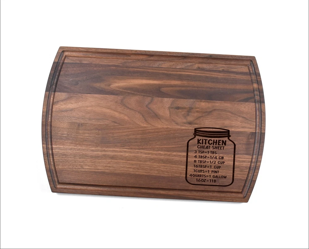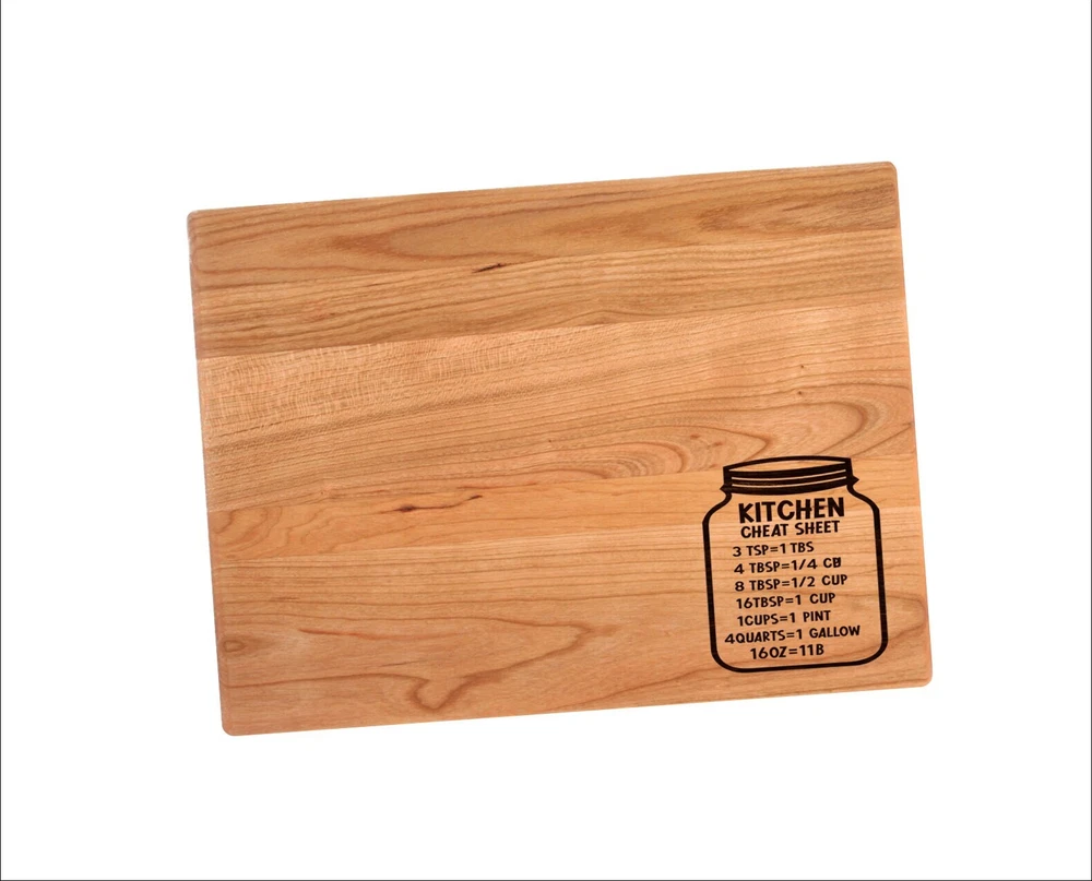Design: Personalized Kitchen Measurements Cheat Sheet Mason Jar Cutting Board or Charcuterie Serving Tray All items ship via USPS - please make sure your address is correct :-) Whether used as a charcuterie serving tray for snacks or cutting board, our bamboo, walnut and cherry custom boards are the perfect addition for the home and make the perfect gift for your loved one celebrating a birthday, anniversary, new home, wedding, etc! *** FEATURES *** • SIZES: We have multiple styles and sizes available. To see our current sizes available, click the drop-down menu. The photo slide contains a photo showing each side by side. Please note, the board with the juice groove only has the groove on the front side of the board. • THICKNESS: Bamboo Boards - Approximately 1/2" Thick; Walnut & Cherry Boards - Approximately 3/4” Thick • UNIQUE: Every board is unique with the grain and coloring varying throughout - no board is the same! • CARE INSTRUCTIONS: Hand wash only with warm water. Do not soak. Please apply mineral oil throughout the board’s life. • PERSONALIZATION/CUSTIMIZATION: Do you want the text placed differently on the board? Please don’t hesitate to contact us. All personalization notes can be entered in the personalization box when checking out. • SHIPPING: All cutting boards ship within 2 to 5 business days. • WHOLESALE ORDERS: Please don’t hesitate to contact us for information about wholesale orders. Processing times for larger orders may change. • NOTE: Colors can vary a bit on different monitors and screens. Any props included in photos are not included. Please be sure to double-check your address to make sure it is accurate for USPS delivery. If a package is returned to us due to an invalid address, the buyer is responsible for all additional shipping charges. We appreciate you supporting small business – best wishes! For items ordered with simple edits, we do not send proofs since the layout doesn't change from the example(s). However, in the event there are requests that change the layout from the example(s), we do send proofs for approval before making the product. If you'd like a proof before we make the product, please note so in the personalization box.
