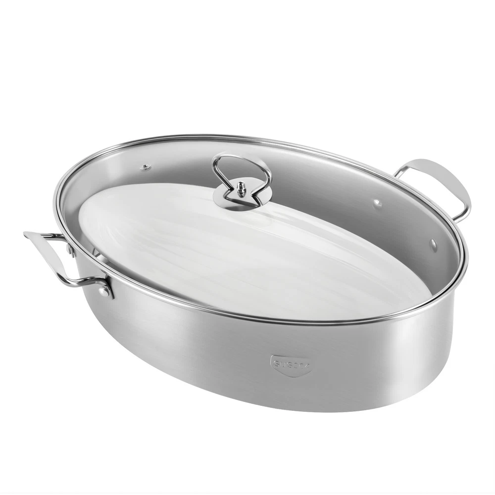 Description If you are tired of your old steamer that keeps ruining your hard work and looking for a solid steamer set that has good performance, our stainless steel fish steamer would be your ideal choice. With the elliptical steamer pot and all equipped accessories, you can professionally steam all the food you want, especially your favorite fish. Package Included 1* Steamer 1* Vented Glass Lid 1* Ceramic Plate 1* Steaming Rack 1* Chuck Application It is ideal for steaming fish, seafood, cornbread, potato, coarse grains, cereals, vegetables, and eggs. It can also roast, boil soup and noodles, etc. Kitchen Oval Roasting Pan 15 Inch Steel Baking Tray Lid & Rack Portable Roaster Description If you are tired of your old steamer that keeps ruining your hard work and looking for a solid steamer set that has good performance, our stainless steel fish steamer would be your ideal choice. With the elliptical steamer pot and all equipped accessories, you can professionally steam all the food you want, especially your favorite fish. Package Included 1* Steamer 1* Vented Glass Lid 1* Ceramic Plate 1* Steaming Rack 1* Chuck Key Features ??Premium Material: This fish steamer is made of food-grade 304 stainless steel, making it durable, high-hardness, resistant to rust, stain, and corrosion, and sturdy enough for long-term use. ??Good Conduction: Its flat pot bottom with stainless steel material allows for fast heat and even conduction, helping food to be thoroughly steamed. ??Large Capacity: The steam pot is 14.96*9.84*3.94 inches in size, which is large enough for holding a whole fish. ??Great Compatibility: This stainless steel fish steamer is compatible with various cooktops, such as gas stoves, induction cookers, electric stoves, and halogen stoves. ?? Delicious Cuisine: The non-reactive stainless steel interior preserves the taste and nutritional qualities of foods, and the even heat ensures thorough cook. Both help you make delicious and healthy cuisine. ??Multiple Usage: The ceramic plate, and the steaming rack make it be used to cook, reheat, and warm various food such as steamed buns and dumplings, and the chuck can be used to clip the plate to prevent burns. ?? Easy to Clean: The stainless steel fish steamer with an integrated process has a strong antifouling ability. You can clean its stains and water stains by using a wet cloth with a little detergent or putting it in the dishwasher. ?? Easy to Carry: There is a comfortable handle on the glass lid and two well-curved handles on the steam pot, together with its 6.15 lbs lightweight, allowing for effortless carry. ?? Protective Package: To prevent the product from being damaged and bumped during transportation, we packed it with protective foam to protect your products to the maximum extent possible. Specifications Material: 304 Stainless Steel Surface Treatment: One-piece Stretching Pot, Riveted Handles Color: Silver Style: Multi-use Shape: Oval Number of Tiers: 1 Applicable Stove: Universal Applicable Firepower: Medium and Low Fire Recommended Pot Bottom Type: Single Bottom Glass Lid Size: 37.8*24cm/14.88*9.44inch Ceramic Plate Size: 36.4*16cm/14.33*6.3inch Steaming Rack Size: 33*21.8cm/12.99*8.58inch Chuck Size: 8.5*4.3*17.5cm/3.3*1.69*6.89inch Steam Pot Size: 38*25*10cm/14.96*9.84*3.94inch Package Size: 41.5*28*15cm/16.3*11.02*5.9inch Net Weight: 2.79kg/6.15lbs Gross Weight: 3.5kg/7.7lbs Details Steaming Rack: This fish steamer is equipped with a steaming rack that has round corners, which is convenient for steaming without damage to the pot bottom. Anti-scald Handle: The steam pot has two well-curved anti-scald handles, allowing for a comfortable grip and protecting you from scalding. Visible Glass Lid: The glass lid has a vent hole for helping steam escape, adjusting the pressure in the pot, and preventing it from boiling over. Moreover, you can keep an eye on it when in use for better and safe cooking. Ceramic Plate: There is a white ceramic plate used to steam fish easier, making the cooking more professional. Stainless Steel Chuck: You can use the stainless steel chuck with a plastic cover to quickly and easily clip the plate from the pot. Application It is ideal for steaming fish, seafood, cornbread, potato, coarse grains, cereals, vegetables, and eggs. It can also roast, boil soup and noodles, etc. Notes The groove welding point of the cover bead is easy to have water, so it is recommended to clean the cover and put it vertically so that the water in the gap can flow out for dry storage. Small defects such as scratches during production or transportation will not affect normal use, and it is not a quality problem. Those who care should be careful to purchase. Problems such as sticking pan, lampblack and scratch discoloration during use belong to the scope of the personal use method. Please allow the slight color difference caused by the shooting light and 1-3cm error due to manual measurement, and make sure you do not mind before you order. Payment Delivery details Terms of sales About us Contact us Payment We accept ebay payment 。 Fees such as import duties, taxes are not included in the item price or shipping costs. These charges are the buyer's responsibility. Delivery details Shipping: 2-9 working days to: USA Terms of sales We maintain high standards of excellence and strive for hundred percent customer satisfaction. Feedback is very important to us. We hope that you contact us immediately before you give neutral or negative feedback, so that we can address your concerns. It is impossible to address issues if we do not know about them! About us Your satis faction is our ultimate goal. We work hard to earn your trust and future business. Our certified technicians have tested each item before shipping. The unit comes with 1 year limited warranty on all manufacturing defects. a) If you receive a defective item, you may return it or ask for a discount. Please contact us within 14 days after you receive the package. b) What you