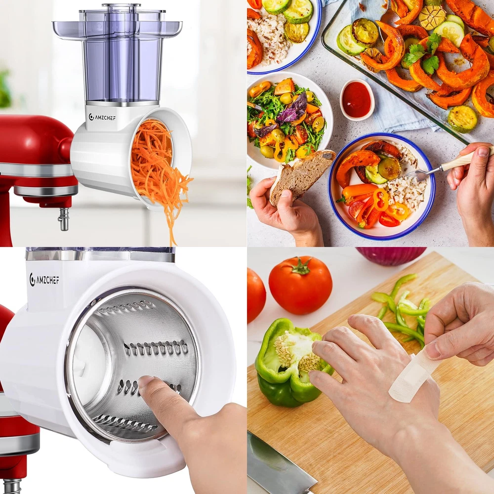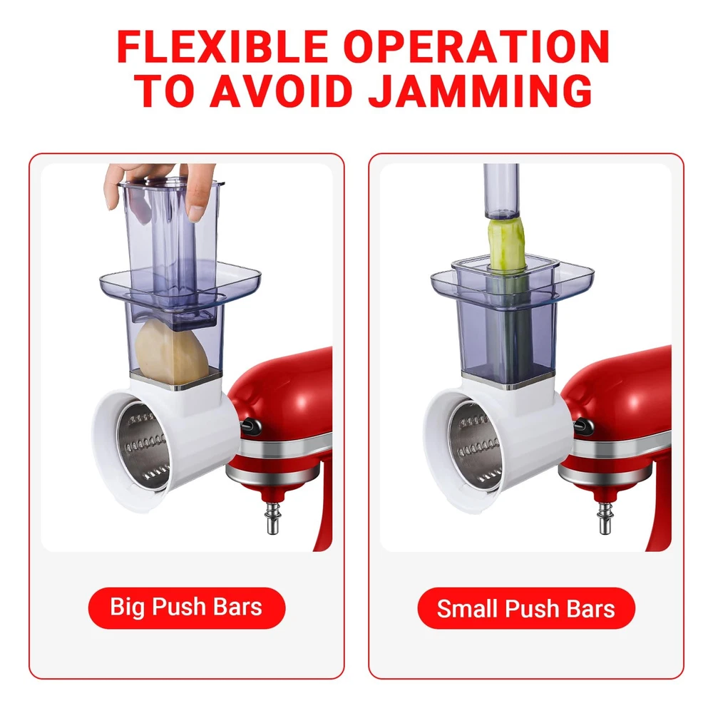 In the kitchen world, is committed to delivering an all - in - one cooking experience. Our Slicer/Shredder Attachments are the must - have kitchen helpers that seamlessly pair with your beloved kitchenaid mixer, hand mixer, or stand mixer. Whether you own a KitchenAid or a Kitchen Aid brand device, our attachments can unlock its full potential. When it's time to make a delicious salad, our attachments act like a pro vegetable chopper, effortlessly cutting all kinds of veggies into the perfect sizes to add great texture to your salad. It can also transform into an excellent cheese grater and cheese shredder, easily creating shredded cheese that adds a rich, creamy flavor to pizzas, pastas, and more. Need to deal with garlic? It becomes a super - efficient garlic press, sparing you the hassle of peeling and mincing garlic. For those who love making French fries, apple slices, and such, our product features an apple slicer and a French fry cutter, fulfilling your diverse food - preparation needs. The mandoline slicer function allows you to slice ingredients into even, thin pieces, enhancing the visual appeal of your dishes. Our Slicer/Shredder Attachments are not only highly functional but also a stylish addition to your kitchen. Just like other cool kitchen gadgets, they add a unique charm to your cooking space. Choose 's attachments and embark on a stress - free and enjoyable cooking journey. Make every cooking session a delight! [360° Blade & 2.8Inches Feed Chute for KitchenAid Attachments] As essential KitchenAid accessories and attachments, this features a 3.35IN stainless blade with 360° coverage and 2.8IN extra-large feed opening – processes whole veggies/cheese blocks effortlessly. Perfect for KitchenAid stand mixer users. [Pro-Grade Capacity for KitchenAid Setup] The 5.1IN tray and dual pushers make this KitchenAid cheese grater attachment ideal for bulk prep. Large discharge opening handles 2x more ingredients vs standard KitchenAid attachments for mixer. [SUS304 & Full Compatibility] Crafted with food-grade SUS304 stainless steel, this KitchenAid cheese grater attachment for stand mixer outperforms plastic competitors. 100% dishwasher-safe for all KitchenAid accessories and attachments. [4 Interchangeable Blades for Any Task] Slice cucumbers paper-thin, shred carrots for slaw, grate hard cheese – 4 blades tackle 30+ foods from salads to desserts. [Secure Locking for KitchenAid Ecosystem] Designed exclusively for KitchenAid stand mixer attachments, the safety lock prevents blade detachment during grating. Non-slip base ensures stability even at max speed.