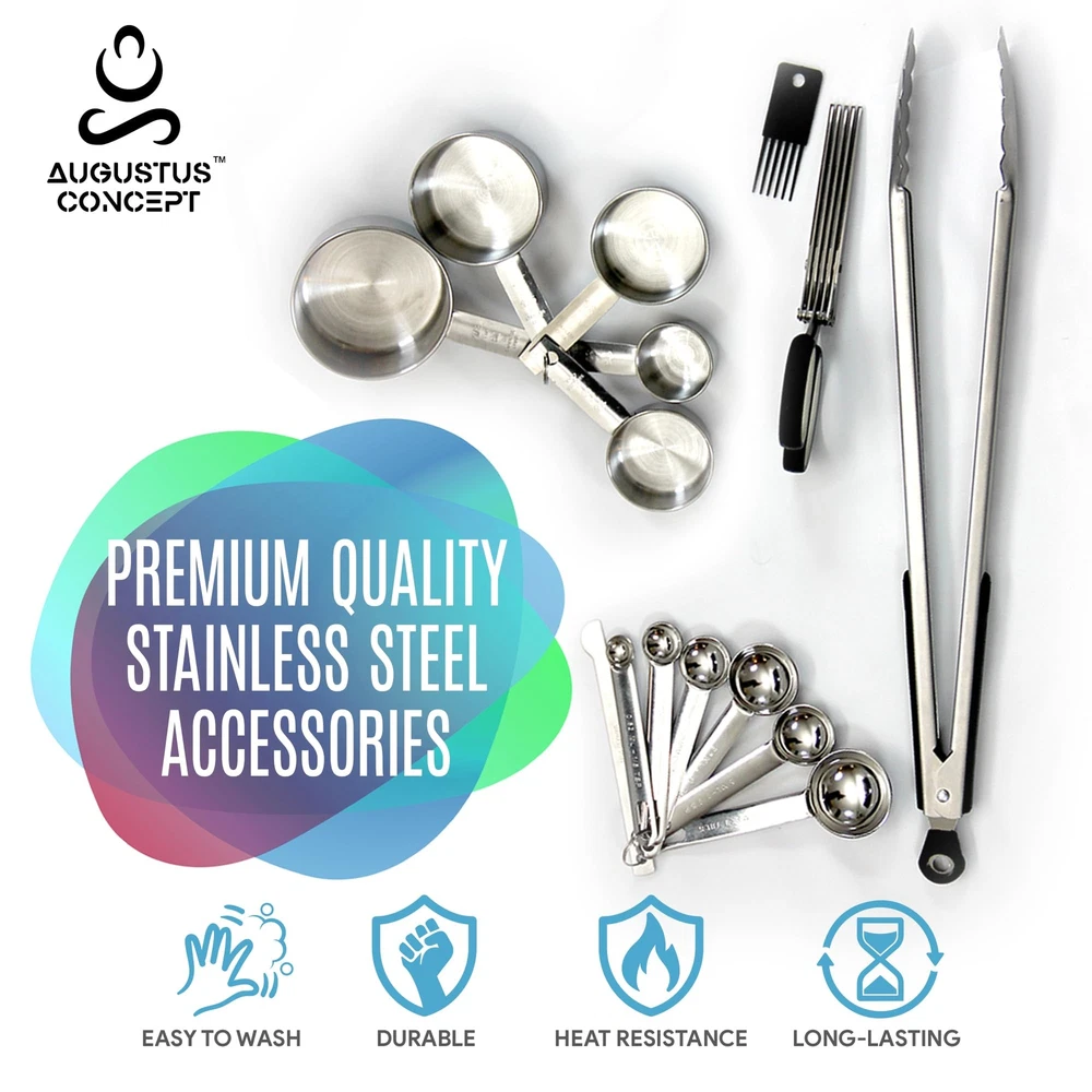 Description ’s kitchen utensils set is a distinct combination of wood and stainless steel cooking utensils set which are greatly designed for daily kitchen requirements. This 25 pcs set contains 9 different designs of wooden spoons and spatulas,1 whisk, 1 spatula/spoon holder bucket, 1 kitchen tong, 5 measuring cups, 7 measuring spoons, 1 kitchen scissors. The wooden cooking utensils are made from premium quality acacia wood and other accessories are made from durable stainless steel material. A decent combination that is hard to find in the market at the moment. A perfect home essentials for new home and kitchen must haves 2024. ’s all in one set is unique in the market which comes with 9 different styles of wooden spoons and wooden spatulas suitable for Nonstick Cookware Set. It additionally contains a stainless steel whisk, kitchen tongs, stainless steel measuring cups & spoons along with a herb scissors. The best kitchen essentials in the market at the moment. The premium quality acacia wood has been used to manufacture wooden spoons and wooden spatulas for Nonstick Cookware Set which can last longer and can maintain its quality. It has given a beautiful finishing touch with an exclusive shape and design. Acacia is one of the popular woods for manufacturing furniture and kitchen accessories. The quality of material is greatly recognized by everyone who loves to cook. Stainless steel set of accessories can widely satisfy daily kitchen needs like measuring food items for perfect baking and blending ingredients for preparing delicious bakery recipes. The handy kitchen shears can cut soft leafy vegetables quickly for garnishing. Wooden spatulas and wooden spoons are eco friendly and biodegradable. Stainless steel kitchen accessories are easy to clean, reusable and durable. The entire set can last longer and the total worth of each penny. A unique combo of kitchen utensils set available now. This set is a perfect blend of wooden kitchen utensils and stainless steel measuring cups and spoons,kitchen tongs and kitchen shears. The type of each utensil is carefully chosen considering the environment, re-usability and plastic-free alternative. At a budget-friendly price, this set is fulfilling most of the daily kitchen requirements with a great quality of material. It is surely a perfect kitchen gift set to celebrate a moment with your loved ones or with yourself too.