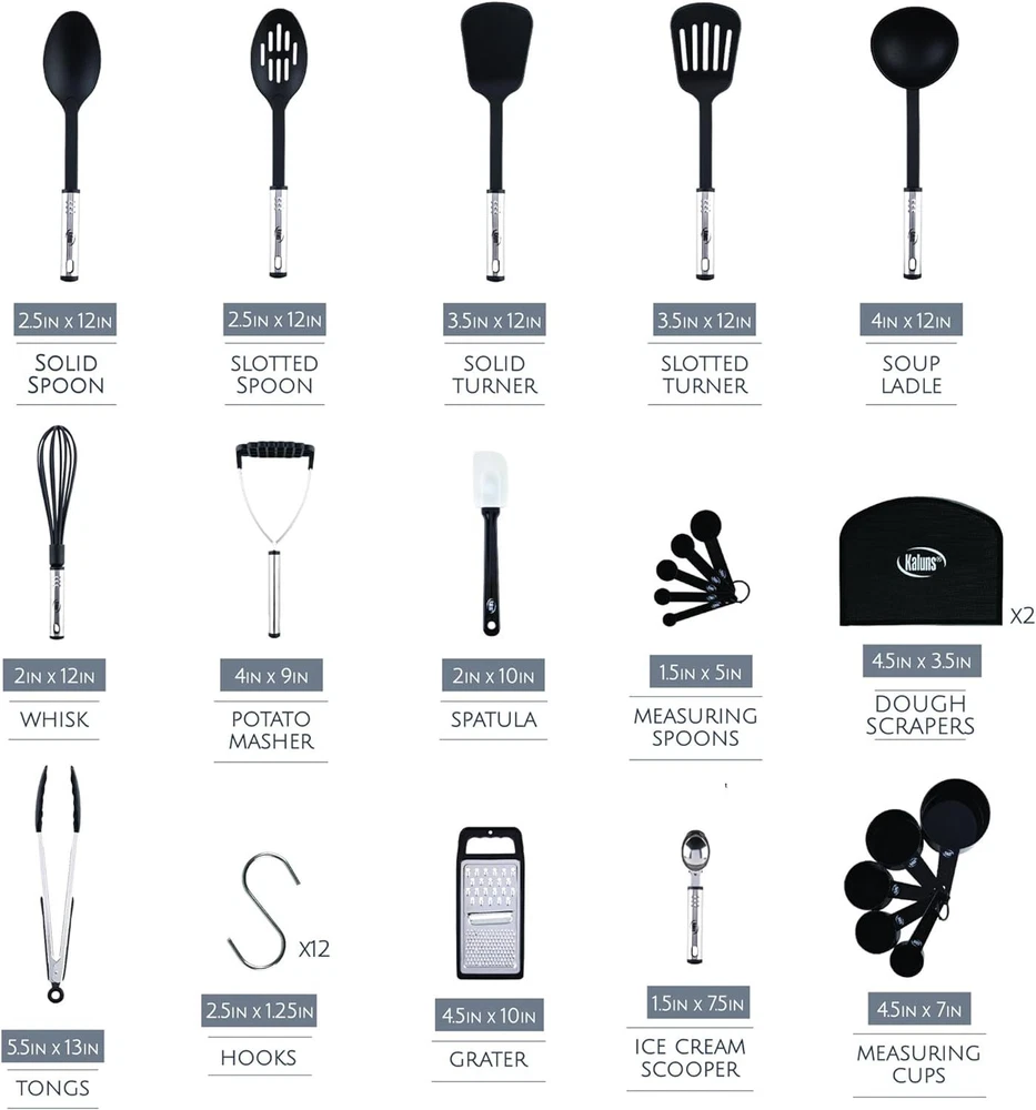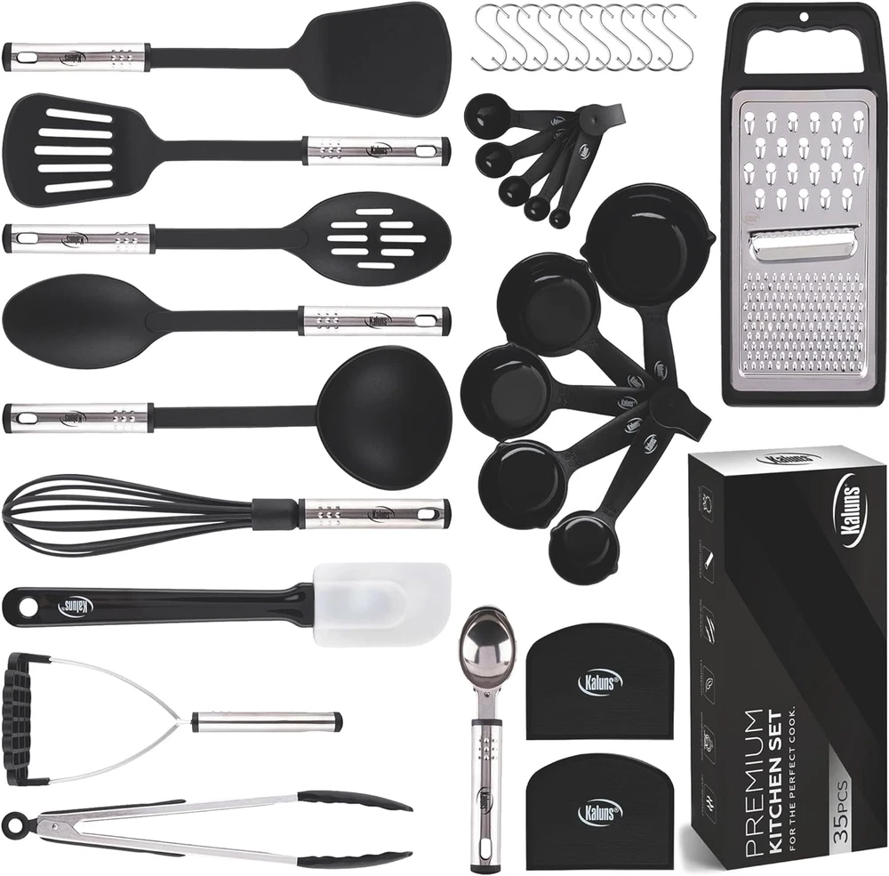 Kitchen Utensils Set 35 PCS Cooking Set, Nonstick and Heat Black Product Details Material: Nylon, Stainless Steel, Silicone Color: Black Brand: Kaluns Product Dimensions: 12.9"L x 6"W Item Weight: 1.14 Kilograms Is Dishwasher Safe: Yes Shape: Irregular Handle Material: Stainless Steel Material Type Free: Plastic Free Recommended Uses For Product: Serving, Cooking, Baking Manufacturer: kaluns Item Weight: 2.51 pounds Item model number: US24 Is Discontinued By Manufacturer: No KALUNS KITCHEN UTENSIL SET: Our utensil set have everything you need for a perfect cooking experience! Kaluns kitchen gadgets and accessories are made of a combination of nylon and stainless steel to ensure no scratching or sticking. COOKING UTENSILS SET INCLUDES: Soup Ladle, Solid Spoon, Slotted Spoon, Solid Turner, Slotted Turner, Potato Pusher, Whisk, Grater, Spatula, Tongs, Ice scream Scooper, Measuring Cups, Measuring Spoons, 2 Dough Scrapers, 12 Hanging Hooks And a Beautiful Gift Box. HIGH QUALITY KITCHEN TOOLS DESIGNED TO LAST: No more worries about melting or rusty kitchen utensils. Our high-quality kitchen gadgets are polished with a special oil to prevent it from getting rusty. They are dishwasher safe, light weight and non-stick. Heat resistant is up to 350 F/180℃. GREAT VALUE NYLON AND STAINLESS STEEL UTENSIL SET: Don't spend a fortune buying each utensil individually. Buy yourself a complete kitchen tool set. Our 35 peice high quality set has everyting you need included. It is specifically designed to help you with all your food preparations, such as whisking, peeling, cutting, stirring, mixing, basting, baking, grilling, frying and serving up that perfect dish. GREAT GIFT IDEA: The Kaluns Kitchen Utensils set come in a classy box ready to gift! Great for House Warming gifts new home, wedding gift, mothers day, holiday and anyone else on your gift list apartment must haves, college dorm room essentials.