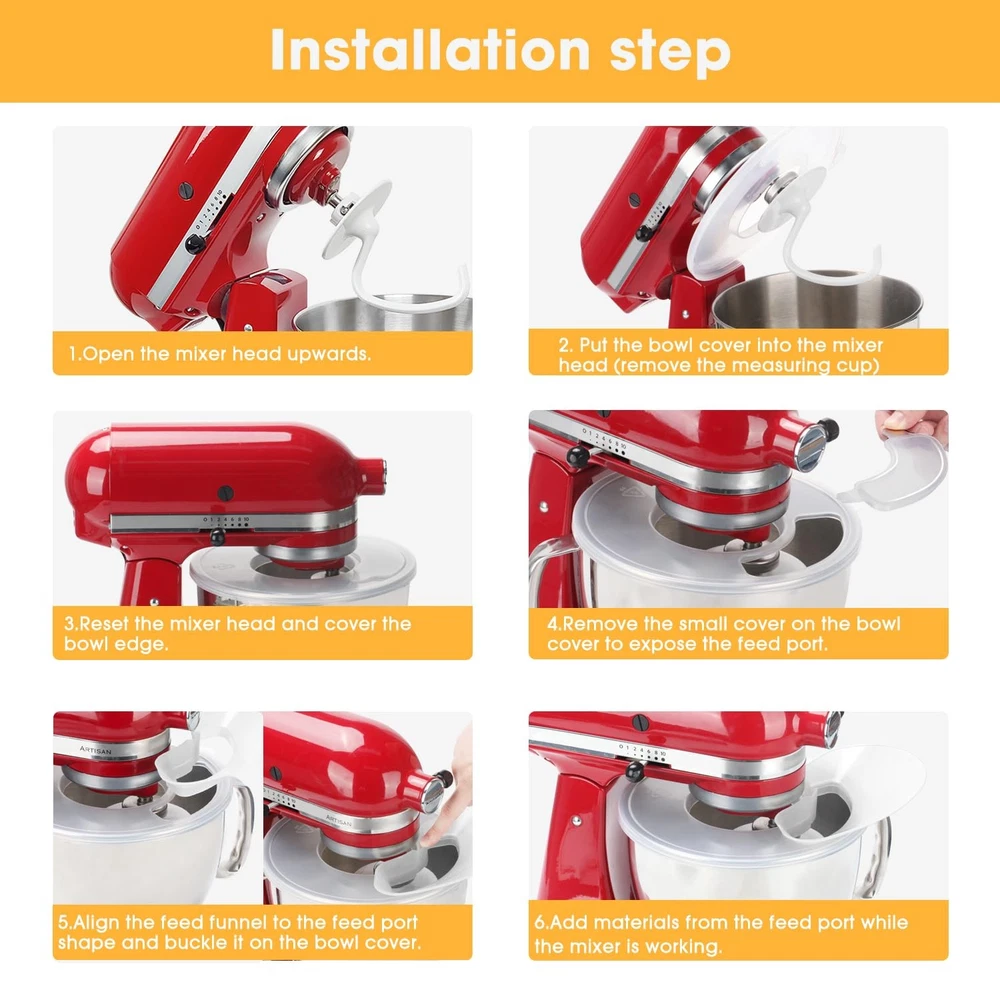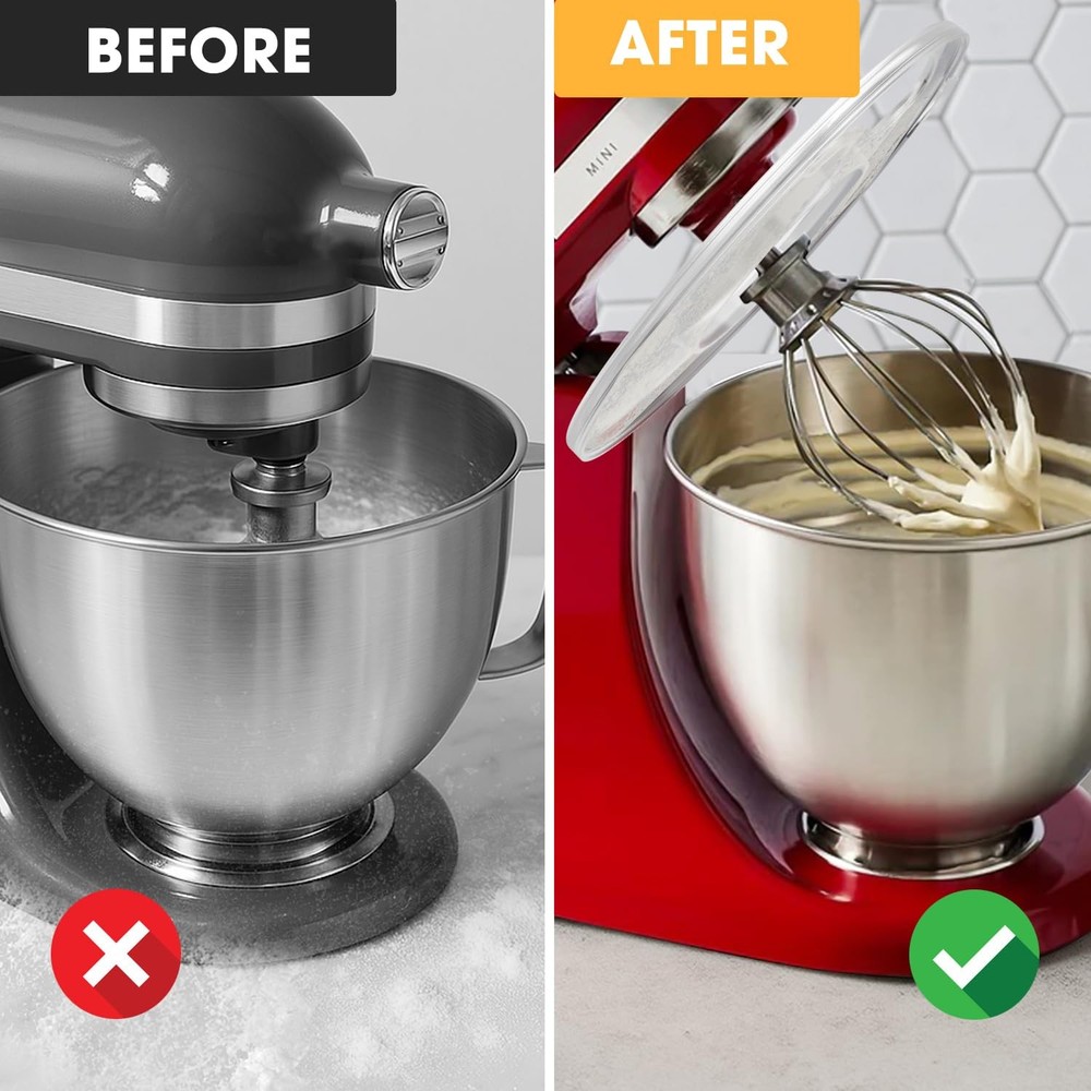 Upgrade Mixer Bowl Cover for KitchenAid 4.5-5 Qt Tilt-Head Stand Mixer, Splash Guard with Extra Pouring Window and Flip for KitchenAid Mixer [Wide Compatibility]: The mixer bowl covers are design for KitchenAid 4.5-5QT Tilt-Head Stand Mixers, compatible with models: K45SS, KSM75, KSM90, KSM95, KSM150PS, KSM152PS and KSM155GB and so on. Adopt a fully enclosed design with no dead ends in all directions, perfectly preventing spills and splashes. Providing you with an easy and convenient cooking experience. [Premium Material]: These mixer splash guards are made of great quality polypropylene, Chemical and heat resistance, Odorless, non-toxic. It can be easily and safe cleaned in the dishwasher or by hand washing. Convenient to install and remove and can be used easily without practice. It is also easy to clean and maintain, just rise and wipe with water and a soft cloth after use. [Innovative Design]: Features an extra pouring window and flip-top design with a large angle pouring chute that allows you to add a variety of ingredients with ease; the full wrap-around pouring shield and pouring chute dust cover perfectly retains the ingredients in the center of the mixing bowl, and the mixing will be more efficient and thorough, effectively preventing splashes and spills when mixing lightweight ingredients such as flour, and minimizing countertop messes. [Exclusive Appearance]: The transparent lid design allows you to observe the progress of the project in the bowl. The inner of the bowl lid is a small bowl marked with a scale of 150ML. When your mixing is over or paused, you can cover the bowl cover to achieve dust-proof and fresh-keeping effect. [After Sale Support]: We provide 30 days money back and 12 months warranty for every consumer, if you have any questions about the mixer splash lid, please feel free to contact us, we will be here to help you.