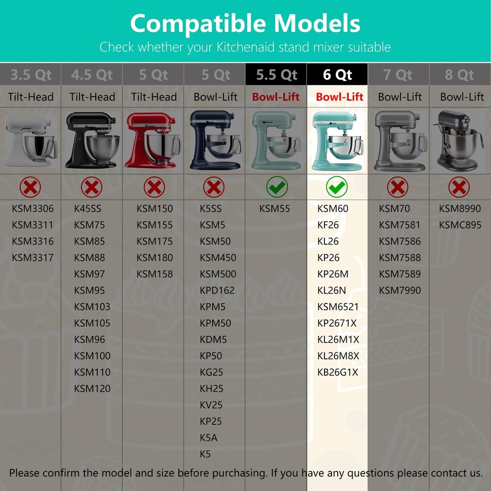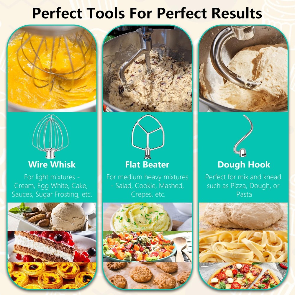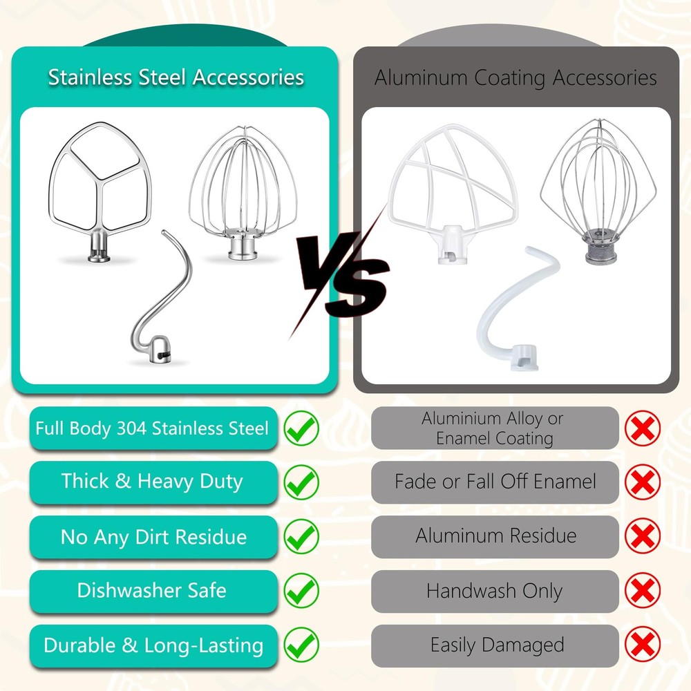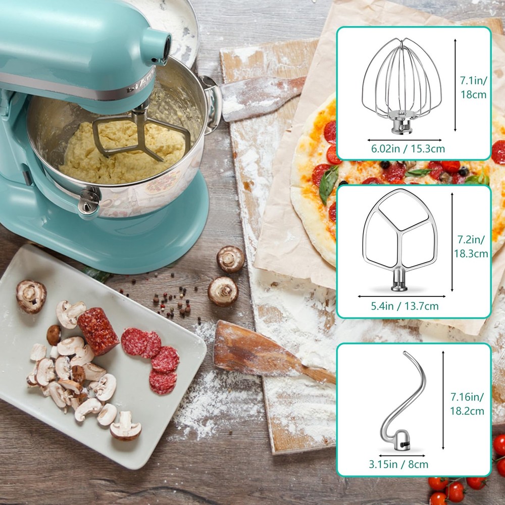 Stainless Steel Accessories Kit for Kitchen Aid 5.5-6QT Bowl Lift Stand Mixer, Includes Flat Beater Paddle, 6 Wire Whisk, Dough Hook, Fits for KP26, KL26, KB26, KSM60 Value Pack - Our stainless steel attachments set for Kitchen aid can perfectly replace kitchen aid 5.5-6Qt bowl-lift stand mixers attachments, including a 6 wire whisk, a flat beater and a dough hook, providing all the essential tools you need for a wide range of mixing and baking tasks. A cost-effective solution compared to choose individual pieces Long Lasting Stainless Steel - This accessories 5 piece accessory suit made from premium stainless steel for heavy-duty durability, not easy to deform or rust, with strong corrosion and rust resistance, very wear-resistant and durable, built to withstand frequent use in any kitchen. Dishwasher safe for easy cleaning and maintenance Perfect Fit - The stand mixer replacements kit designed for KitchenAid 5.5 and 6 quart bowl-lift stand mixers. Compatible with KitchenAid KSM60, KP26M, KL26N, KSM6521, KSM6521, KP2671X, KL26M1X, KL26M8X, KB26G1X Versatile Baking Helper - Easily tackle a variety of baking tasks with this set, from whipping cream and mixing batter to kneading dough, giving you professional results every time. Whether you're making delicate pastries or hearty bread, these stainless steel attachments offer superior mixing, whipping, and kneading, making your kitchen tasks quicker and easier Ideal Gift - This stainless steel accessories and attachments for KitchenAid is accessible to make all kinds of delicacies, suitable for baking lovers. It's the best gift for your wife, friends, parents, or relatives on birthdays, weddings, Christmas, etc. If you are not satisfied with stuff you get, to return the product or Spring & Washer - After 2016, the factory stopped putting the springs on the beater shaft to save costs. Our accessories kit for Kitchenaid stand mixer come with a spring and a washer to reduce wear, they can securely locking the mixing attachments onto the shaft, and extend the life of the mixer by reducing wear