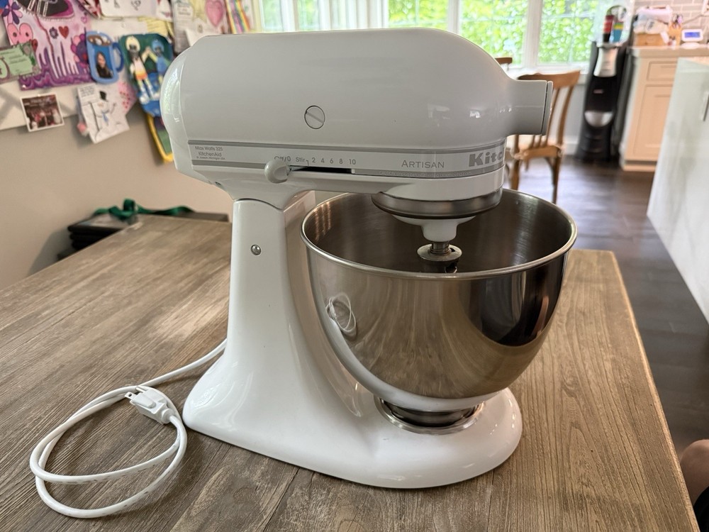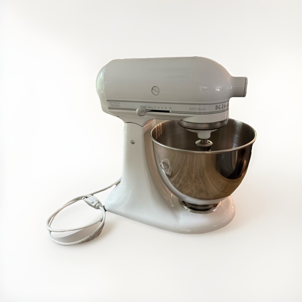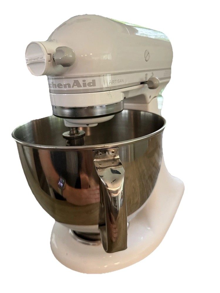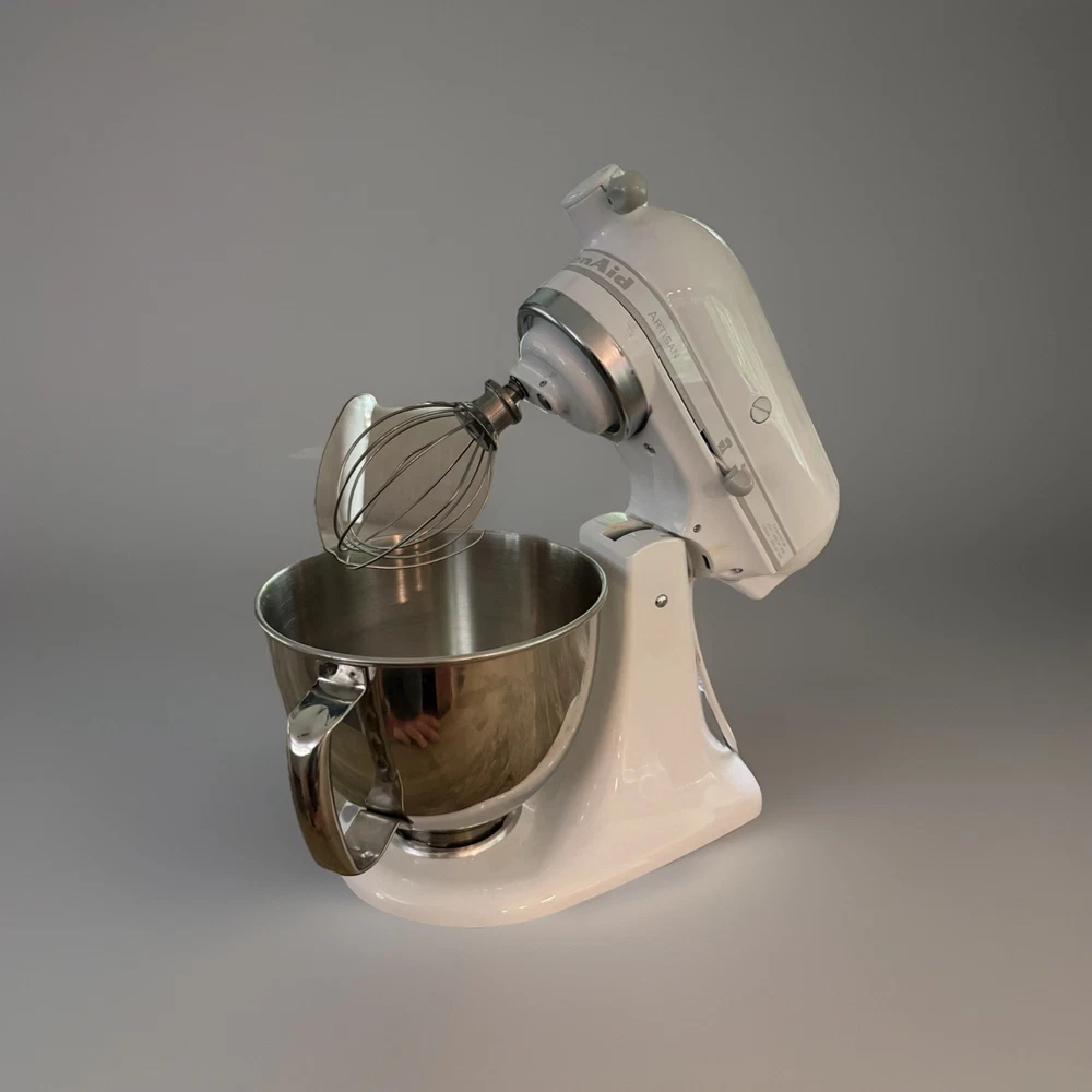 The KitchenAid 5 Quart Artisan Stand Mixer KSM150PSWH in White is a high-quality kitchen appliance designed for mixing and kneading tasks. With a durable steel construction and a glossy finish, this stand mixer is both stylish and reliable. It features 10 different speed settings, making it versatile for various recipes. The set includes a stand, whisk, and bowl.
