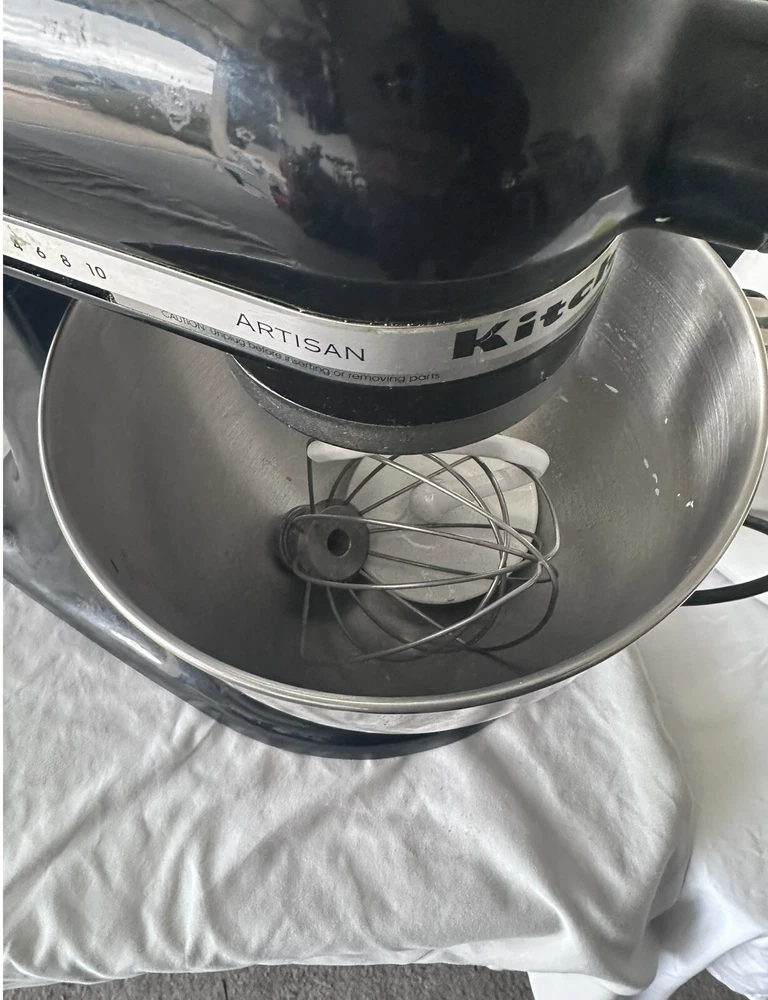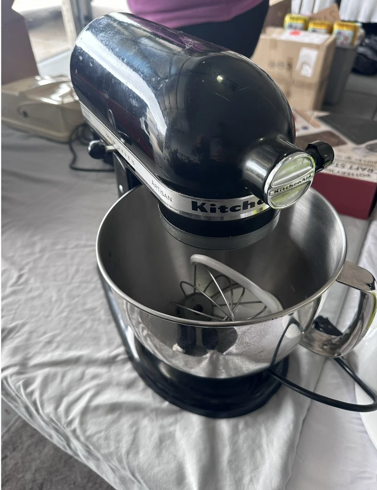 Introducing the KitchenAid Artisan Mini Stand Mixer in sleek black. This electric mixer boasts a 3.5 qt capacity and is made with durable cast iron material. It features button controls and 10 different speeds for versatile use. Included is a stand for easy display and storage. This glossy finished mixer is perfect for any home kitchen and is sure to impress. Whether you're an avid baker or just starting out, the KitchenAid Artisan Mini Stand Mixer is a must-have for any countertop. TESTED. GOOD WORKING CONDITION. ATTACHMENTS PICTURED INCLUDED