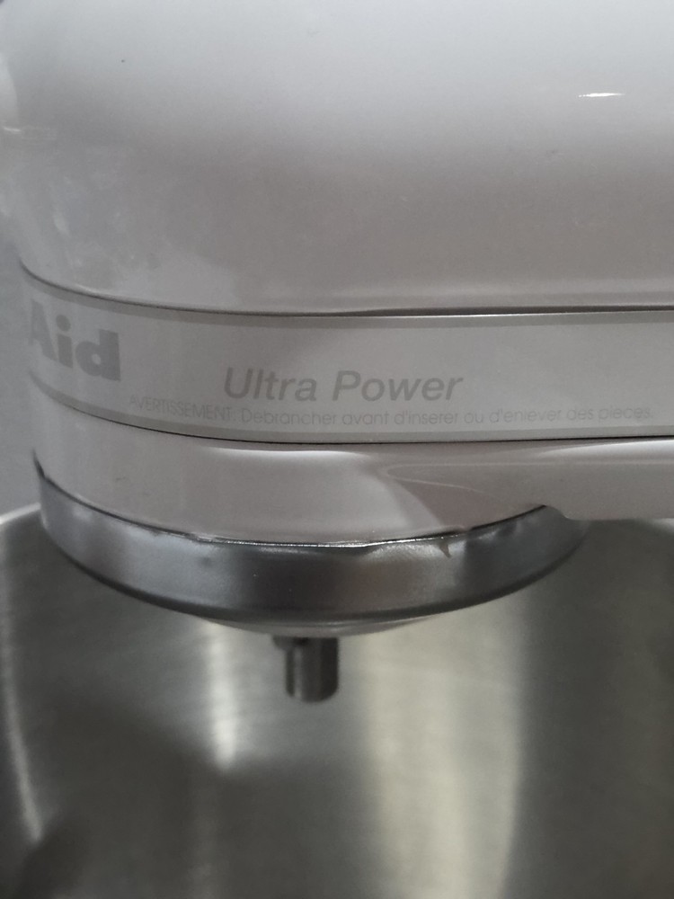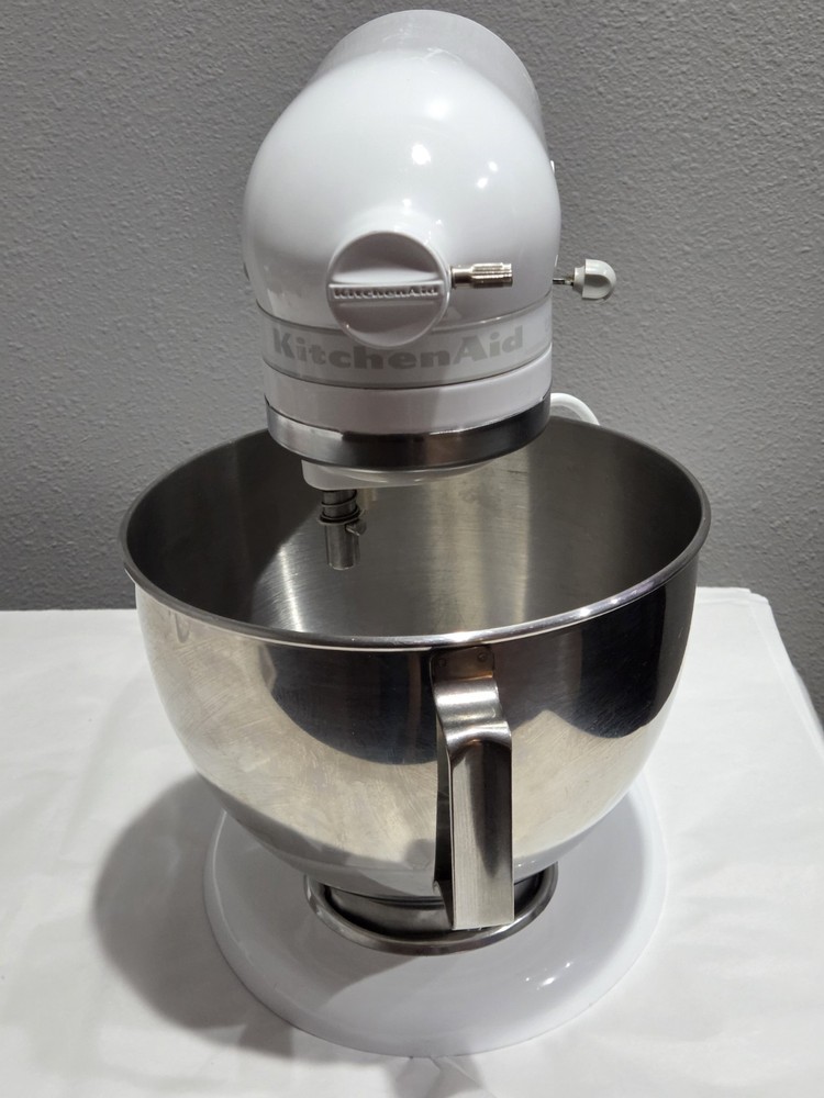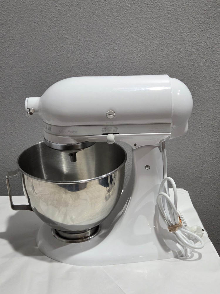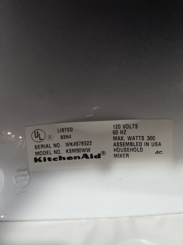 Very clean and working great. The KitchenAid KSM90WW is a powerful 300W standalone mixer in white, with a 4.5 qt capacity. It offers 10 speeds for various tasks like whipping, blending, and beating. Made of metal, it includes attachments like a whisk, hook, and beater. With variable speed control, easy cleaning, and a glossy finish, this multipurpose mixer is designed for tasks like making whipped cream, baking, and dough preparation.