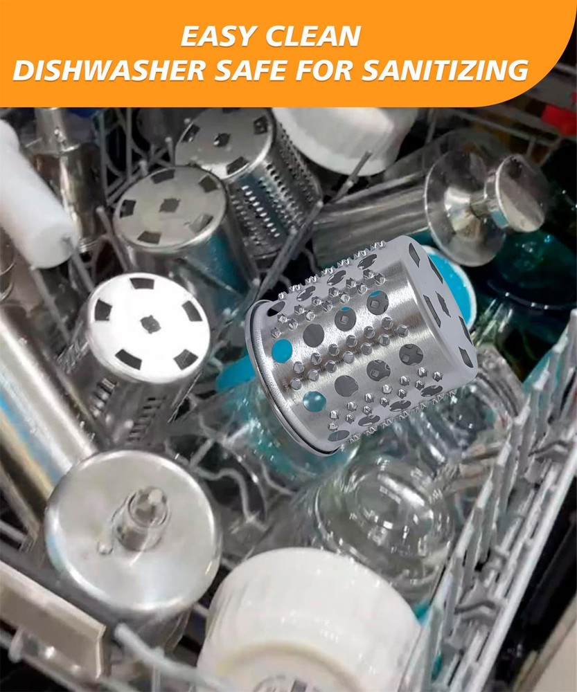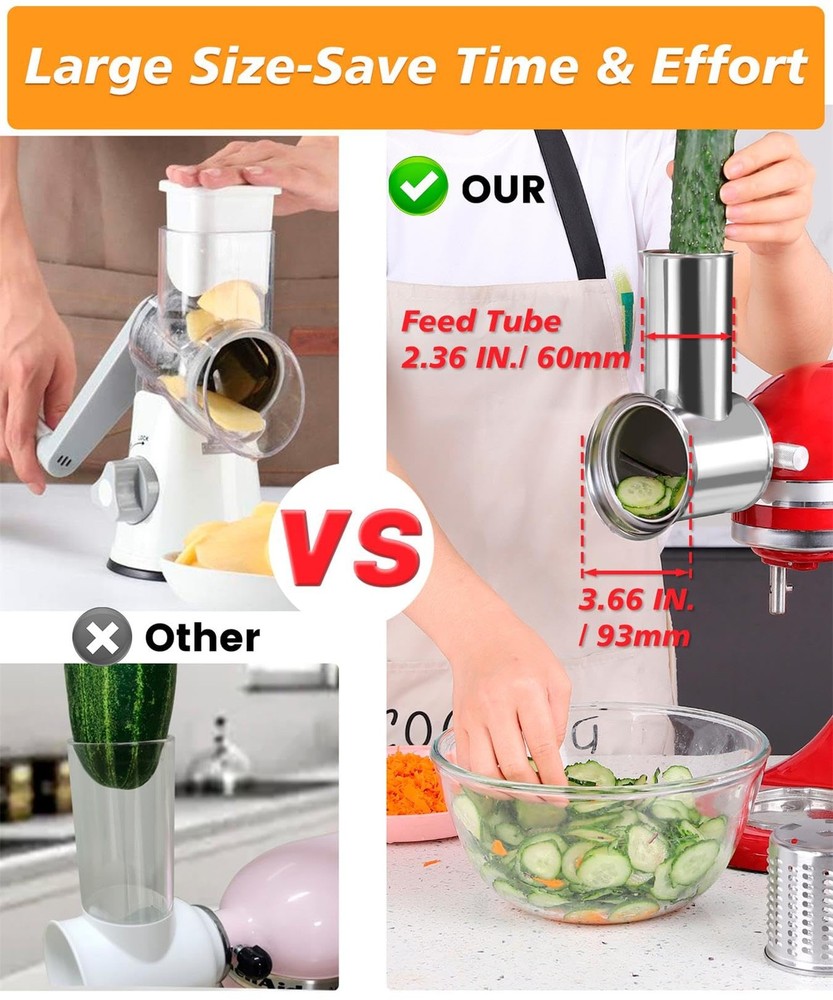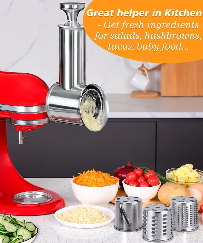 Worried about plastic cracking or discoloring? Then take the Stainless Steel Slicer Shredder Attachments, design to fit Kitchen aid stand mixers, turn mixer into a professional salad maker, cheese grater and food chopper,Easily add freshly sliced or shredded ingredients to all of your favorite salads, entrees, sides and more. What factors to consider before finally buy a kitchen salad process tool? Are all parts stainless steel? This mixer attachments are full stainless steel, excellent corrosion resistance and durability, to ensure long-term stability and safety. Are blades sharp enough? All blade made by full stainless steel, thick and big cutting blade, sharp enough for slicing shredding fast and easily,10 Times or more faster than slicing / shredding by hand or hand crank grater. Does not require much effort to operate. Are parts dishwasher safe for easy cleaning? All parts are mirror shinny finish for easy cleaning and maintenance. Dishwasher safe for easy sanitizing! Comfortable use? The food pusher has a Ergonomic Pot Lid knob on top, easy and comfortable to grasp, saving your hands from hurting by that thin food pusher without this knob. How many blades includes? Total 4 interchangeable cutting blades: ~2.5mm/ 0.1 inch slicing blade, Great for cucumber, zucchini, radish, mushroom... ~6mm/ 0.24 inch coarse shredding blade for onion, potato, cabbage, cucumber, cheese.. ~4mm/ 0.16 inch fine shredding blade for onion, cauliflower,carrots, peanut, cheese... ~Grinding powder blade for garlic, chili pepper, some soft baby food... Can it grate hard cheese? This attachment also use as a cheese grater to make your kitchen work more convenient. Which stand mixer to use? This kitchen food slicer shredder attachment Specially designed for KitchenAid Stand Mixer, all models. Also can fit Cuisinart mixers Only model SM-50, SM-50BC, SM-50R. Sales After Service: 24 months Warranty Against manufacturer defectives, Any problem on product use, feel free to our customer service for win-win solution. Fit Perfectly for Kitchenaid Mixers : Vegetable Cheese Grater Slicer Shredder Attachment design for Kitchen Aide stand mixers, to work as a versatile kitchen appliance that can help tackle even more culinary tasks on favorite salads, entrees, sides and more Strong Stainless Steel: Still worried about plastic cracking or discoloring? Then try this salad maker attachment, Thick stainless steel, strong & durable! Include the blades, all full stainless steel, lets say goodbye to those metal cutters with plastic surround, which easy bend or broken Comfortable to Use :Big food pusher with Ergonomic Pot Lid knob on top, easy and comfortable to grasp, friendly prevent your hands from hurting by that thin food pusher without this knob Large Size and Efficient : Food feeding tube diameter 60mm/ 2.36 inch,Cutting blades 81mm/ 3.19 inch wide, all large size for more efficient food processing, therefore this kitchenaid mixer attachment easy to feed a whole potato, carrot, cheese block... Save Time and Effort : For its scientific design and stainless steel texture, this cheese graters attachment works faster than slicing / shredding by hand or hand crank grater. From cheeses to fruits and veggies, it cuts your time on food prep. in half and more Multifunctional 4 Different Blades: This new design kitchen aide prep slicer shredder replacement with 4 Interchangeable Blades,to complete food preparation with easy slicing, chopping, and grating, perfect for grating cheese, radishes, cucumbers, carrots, potatoes, zucchini, peanuts, almonds and more for salads, pizza toppings, quesadillas, baby food, and more