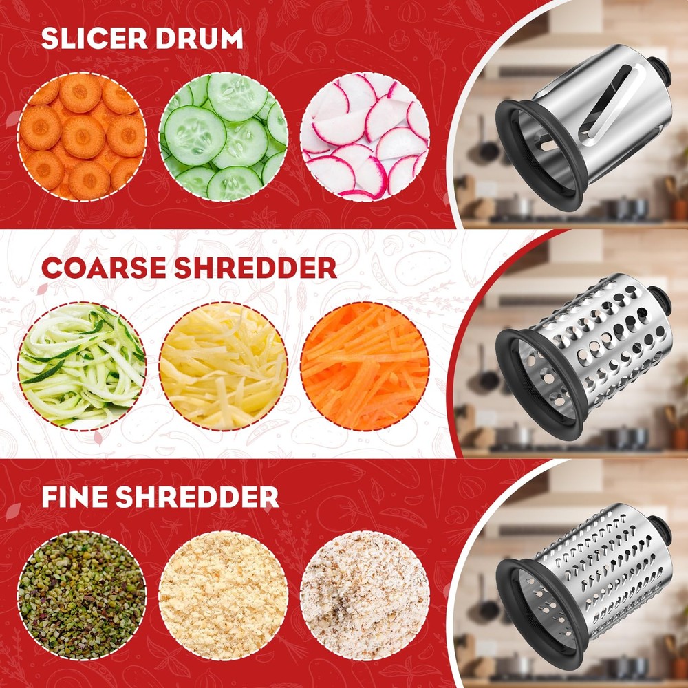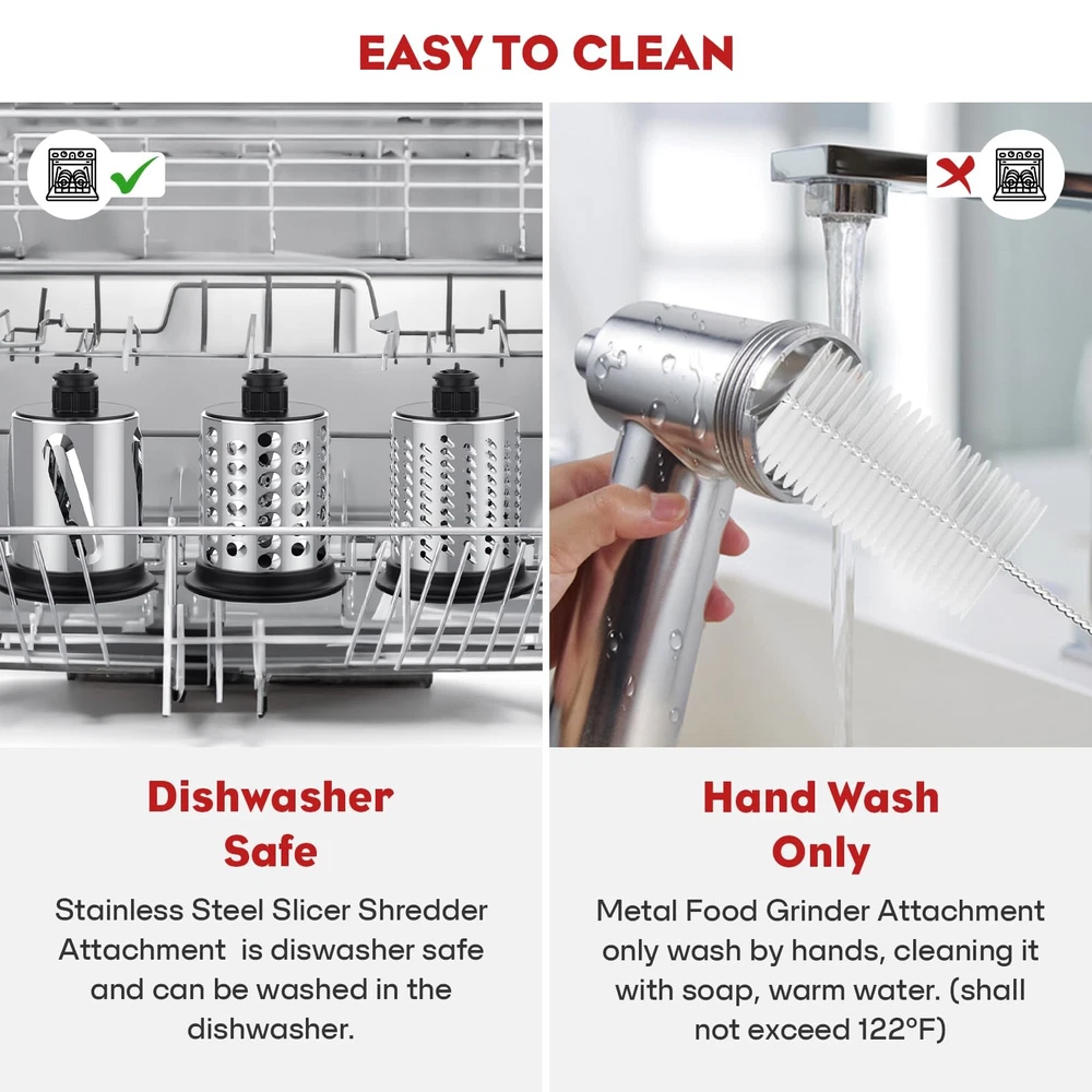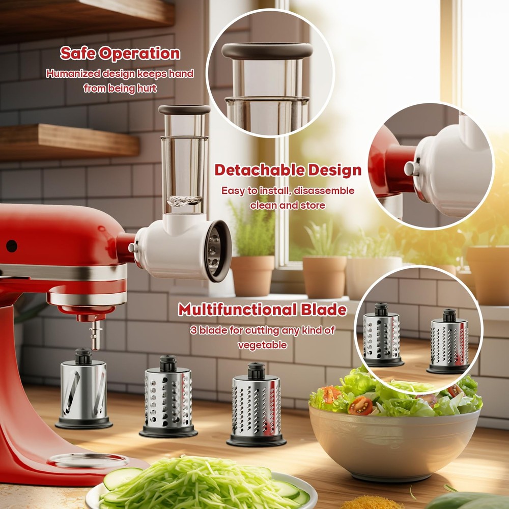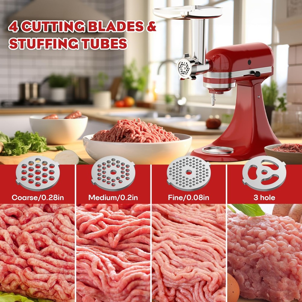 Meat Grinder & Slicer Shredder Attachments. For KitchenAid mixer accessories are tailored to perfectly fit both Kitchen Aid Stand Mixers and Cuisinart models SM-50, SM-50BC, SM-50R. 【Universal Compatibility Design】For Kitchenaid attachment are tailored to perfectly fit both Kitchen Aid Stand Mixers and Cuisinart models SM-50, SM-50BC, SM-50R. Designed specifically for KitchenAid, 's meat grinder attachment and slicer/shredder attachment for kitchenaid give you 2 fully functional mixer attachments in one order. 【Food-safe Materials】 meat grinder for kitchenaid mixer is made of high quality food safety grade aluminum alloy. kitchen aid cheese grater with BPA-FREE Materials, 360 degrees hole stainless steel blade, made of upgraded durable materials, which makes the blade stronger and not easily deformed. 【All-in-One Culinary Companion】This versatile stand mixer attachment kit includes a meat grinder, two grinding blades, four grinding plates, three sausage stuffer tubes, a cleaning brush, a removable food tray, and a food pusher. This kitchen aid mixer attachment for mixer can handle hard cheeses, raw meats, fruits, and more, providing flexibility for making a variety of sausages. 【Efficient Slicing and Shredding】The kitchen aid slicer shredder attachment for kitchenaid stand mixer boasts three durable stainless steel drum blades—5mm slicing, 6mm coarse shredding, and 3mm fine shredding—enabling you to process vegetables like cucumber, zucchini, cheese, carrots, mushrooms, nuts, and pizza toppings quickly, significantly reducing prep time. 【Easy to clean】Only the vegetable slicer attachment are dishwasher safe, it's suggested to clean other components manually using mild soap and warm water below 122°F. A dedicated cleaning brush is provided to clean any hard-to-reach areas. stands behind its products and offers support should there be any quality concerns.