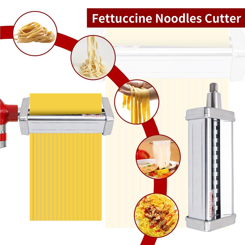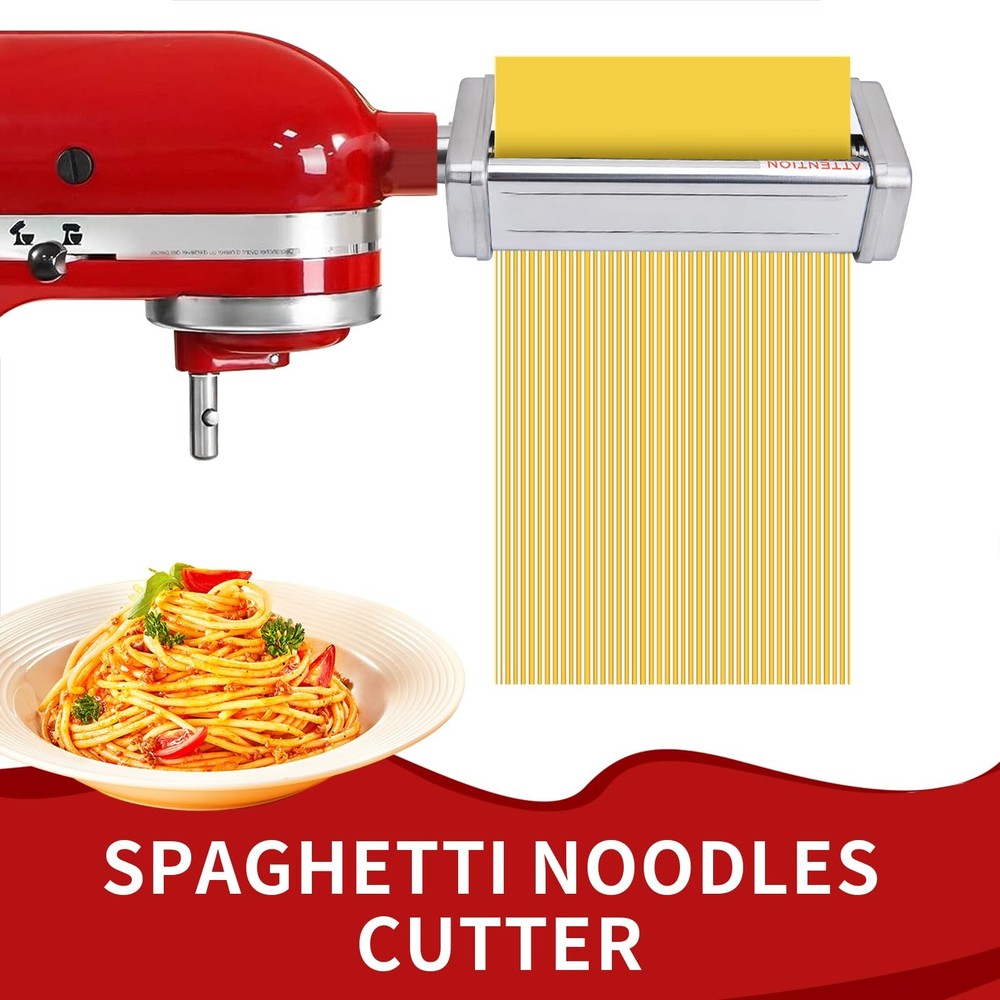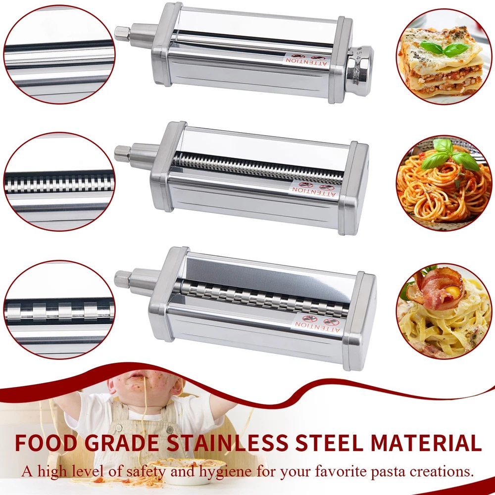 Pasta maker attachment are suitable for All KitchenAid stand mixers, made of 304 stainless steel, including pasta roller, spaghetti cutter and fettuccine cutter. You can enrich your own recipes: Ravioli, Melaleuca, Tortellini, Dumplings, Empanadas, Lasagna, Noodles and more delicious food. The food grade and sturdy stainless steel frame offers high stability and power for making pasta sheet, It's convenient for daily use! The pasta maker attachment set has an 8-gear adjustment knob from 0.4mm/0.016in to 2mm/0.08in to adjust the desired thinness of the pasta in order to change the texture and taste of your pasta. Special design, easy attach and operation, Homemade Fresh pasta noodles easily in minutes. This is a super convenient attachment and makes great pasta. Works great and comes with detailed instructions. Cleaning Tips: It can be washed by water, but don't soak in water long time, not dishwasher safe Cleaning Brush provided to easily remove bits of flour and pasta, you can also clean by dry soft cloth. The package includes: 3 Pieces Pasta maker attachments for KitchenAid stand mixers. Pasta Attachment for Kitchenaid Stand Mixer: This pasta attachment for kitchenaid mixer is specifically designed for all Kitchenaid stand mixer. This pasta attachment for kitchenaid stand mixer enables you to craft the healthiest and most delicious pasta directly in the comfort of your kitchen Food-Grade Pasta Maker Attachment: This food-grade pasta maker attachment for kitchenaid mixer is crafted from high-quality stainless steel, ensuring durability and efficiency. With low noise and superior performance compared to other 3-in-1 pasta maker attachments for kitchenaid stand mixers, it's the top choice for creating healthy, fresh pasta dishes Multi-Purpose Pasta Attachment for Kitchenaid Mixer: This multi-purpose pasta attachment for kitchenaid mixers includes a pasta roller, fettuccine cutter, and spaghetti cutter. Simply attach it to the power hub of any kitchenaid stand mixer to smoothly roll the dough and cut the pasta into spaghetti, fettuccine, and lasagna. It's the ideal choice for pasta maker attachment for kitchenaid pasta attachment Adjustable Pasta Maker Attachment: This adjustable pasta maker attachment rolls 5.5-inch sheets of dough with 8 thickness settings, ranging from 0.4 to 2 mm (0.016 to 0.08 in). The other two pasta cutters can cut pasta sheets into hearty fettuccine noodles, linguine, lasagna, and spaghetti, at widths of 1.6 or 6.3 mm (0.06 in or 0.25 in). It's a great pasta maker machine for your KitchenAid stand mixer, meeting various pasta making needs Easy to Use and Clean: Pasta maker attachment for kitchenaid mixer is easy to use and clean. Perfect for making angel hair pasta spaghetti, fettuccine, lasagna, dumpling skins and more, caters to all your pasta making needs. From now on, you can make fresh pasta and noodles much more often.(Clean tip: Not Dishwasher Safe! Clean the set with a brush or soft cloth by hand.) Worry-Free Shopping: Experience worry-free shopping with our pasta attachment for KitchenAid stand mixer. We provide excellent after-sales service, ensuring a hassle-free pasta-making experience. Add our pasta attachment for kitchenaid mixer to your kitchen tools and enjoy the satisfaction of homemade pasta