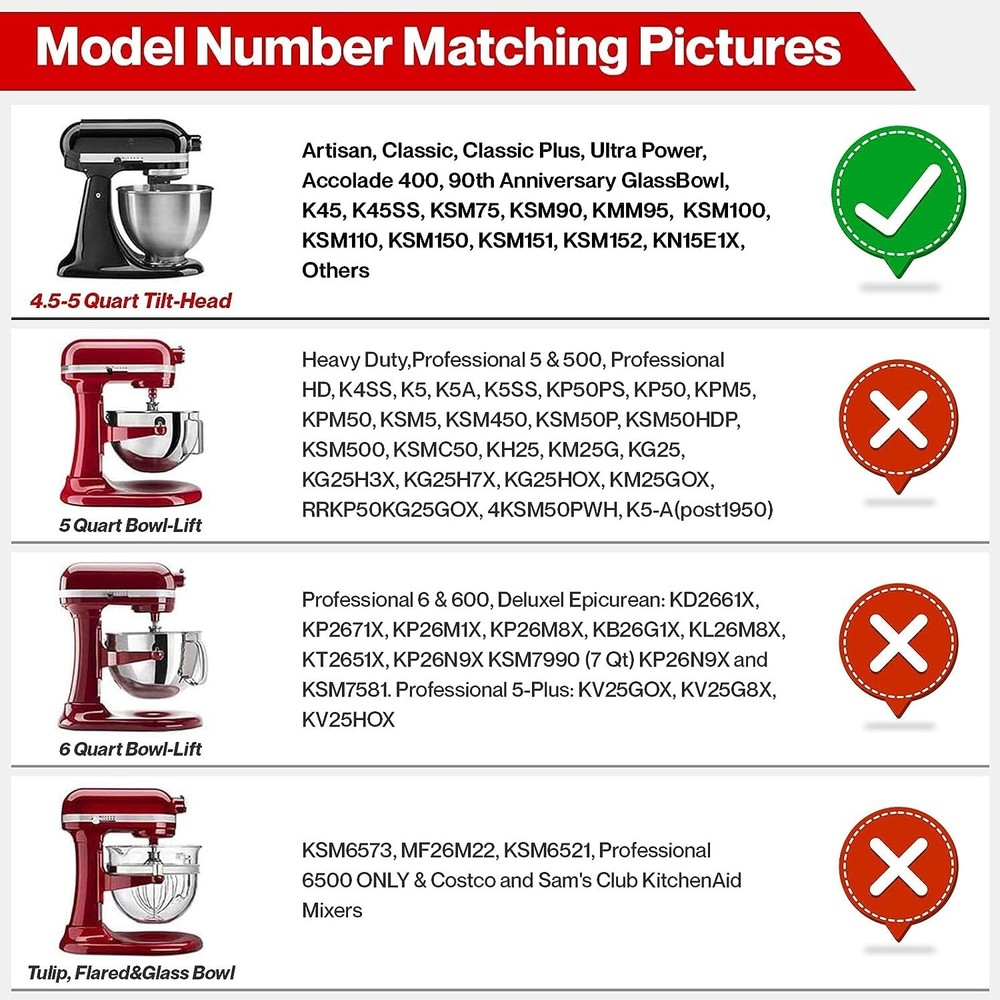 Flex Edge Beater 4.5-5 Quart Stand Mixer Tilt-Head Attachment For Kitchen-Aid Quantity: 1pc Flex Edge Beater Product Overview: Flex edge beater which provides great beating performance and more thorough mixing results with all kinds of liquids, powders, doughs and creams. Reduces mixing time and the need to scrape ingredients down the side of the bowl when you’re mixing because this beater features a flexible edge that thoroughly scrapes ingredients into the bowl. Compatibility: Suitable bowl size: 4.5 or 5 quart titl-head stand mixer bowls. Fits model: for Classic, Classic Plus, Ultra Power, Artisan, Artisan Design, K45, K45SS, KSM1, KSM15, KMS16, KSM100, KSM103, KSM110, KSM120, KSM150, KSM151, KSM152, KSM153, KSM155, KSM158, KSM160, KSM165, KSM4, KSM45, KSM75, KSM8, KSM80, KSM85, KSM9, KSM90, KSM95. Not compatible with some Costco and Sams Club KitcherAid Mixers. Not fit 6 quart, NOT for bowl-lift mixer. Not for 5 qt bowl-lift style mixer like the PRO 500 and the Professional Plus 5 Series stand-mixer. Main Mixing Jobs: 1. Ideal for light to medium-heavy mixing, such as biscuits, cookies, quick breads, cheesecakes, cake dough, waffle and pancakes, mashed potatoes, pie mix, creamed frostings, whipping eggs and much more. 2. But do not use with heavy mixes such as breads, coffee cakes, rolls and buns, which should turn to dough hook or that flat beater without silicone edge. Instructions: Note: replaces the flat beater from your stand mixer. 1.Secure mixing bowl and attach; 2.Raise bowl into locked position; 3.If needed,lower the mixing bowl and use the height adjustment screw to fine tune the blade-to-bowl contact; -Clockwise lowers the bowl(1/8 turn at a time to decrease contact). -Counterlockwise raises the bowl(1/8 turn at a time to increase contact). 4.Add ingredients on the left side,facing the machine,aiming for the center of the bowl; 5.Always add flour slowly on “Stir”; 6.If motor slows when adding flour,increase speed one level at a time. Material: Sturdy metal alloy frame & soft silicone edges. The metal inner-frame offers high stability and power for heavy mixing jobs while the soft silicone sides ensure mixing is done thoroughly without scratching your 4.5 and 5 quart mixing bowl. Time Saver: The flexible silicone edges make it possible to scrape the side of the bowl so you don't have to constantly stop and use a spatula to do so. Reduces mixing time by 50 percent. Cleaning: Dishwasher or hand wash Specifications: Item Name: Beater Blade Material: Metal + Coating + Silicone Features: Mixer Accessories, Durable, Flexible Edge Size: 15.6cm x 15.2cm / 6.14" x 6" (Approx.) Package Included: Flex Edge Beater 4.5-5 Quart Stand Mixer Tilt-Head Attachment For Kitchen-Aid