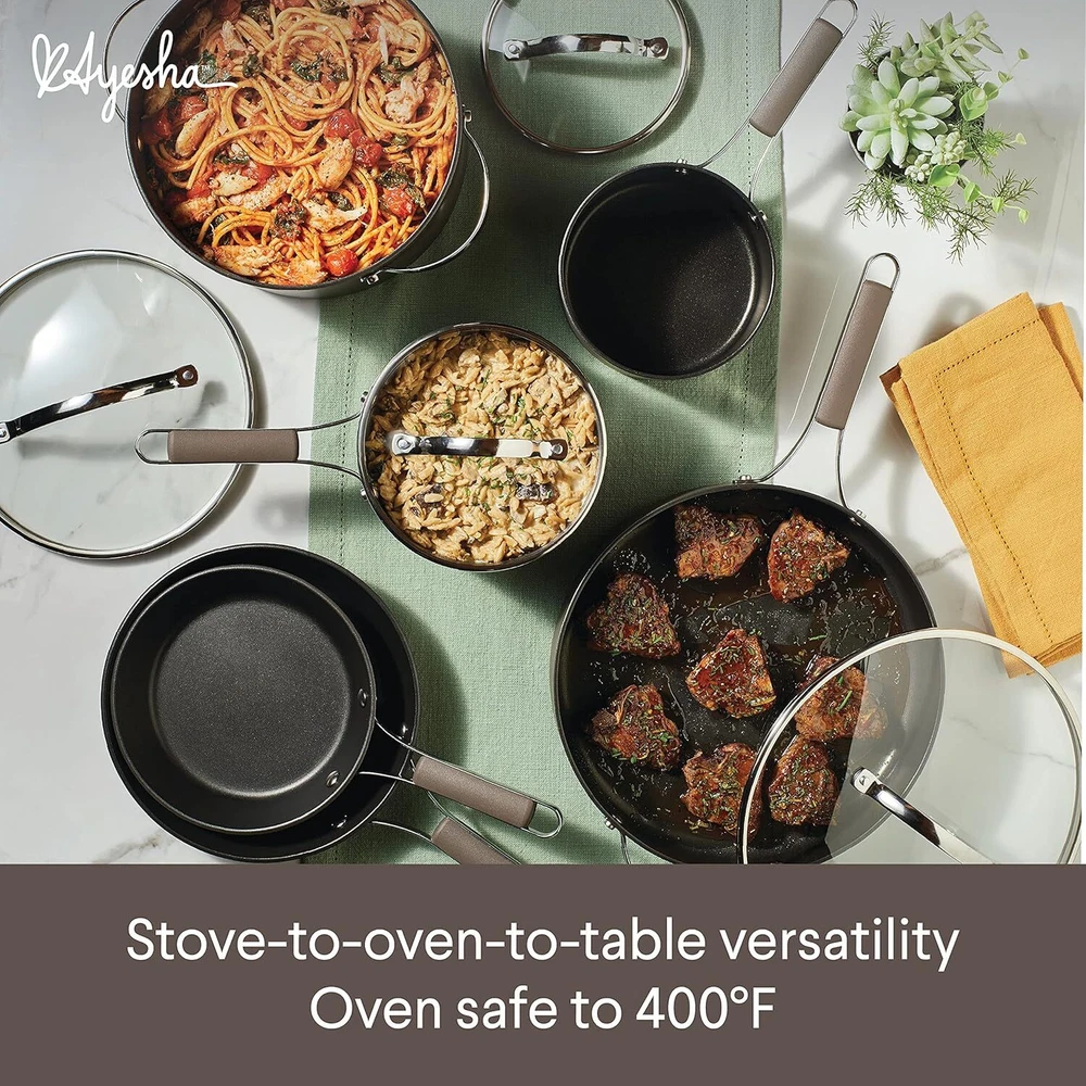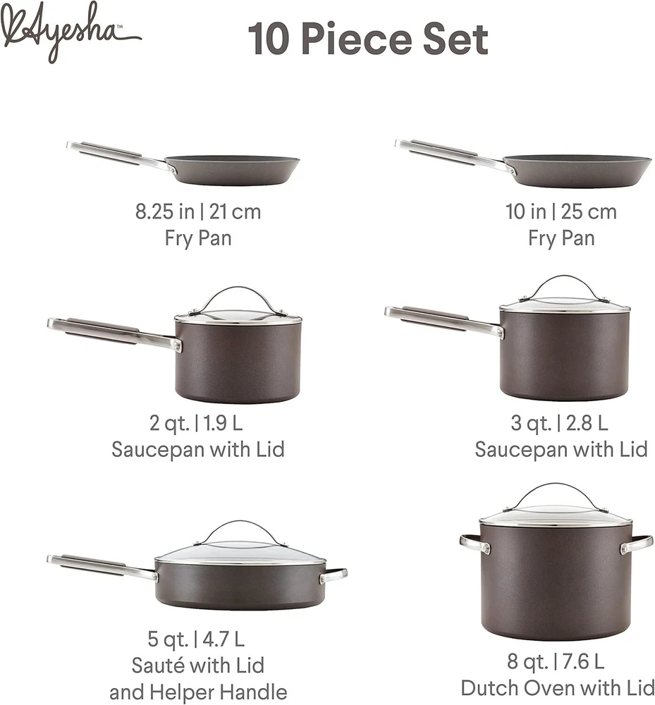 MADE TO LAST: Thicker gauge hard anodized aluminum cookware is 6X harder than regular aluminum cookware for extra durability CONVENIENCE & EASE: Pots and pans feature a premium, inside and out nonstick for effortless food release and easy cleanup OVEN TO TABLE: Stylish nonstick cookware from Ayesha Curry is crafted from hard anodized aluminum for fast, even heat with extra durability for busy, modern kitchens SET INCLUDES: 2-Quart Saucepan with Lid, 3-Quart Saucepan with Lid, 8-Quart Stockpot with Lid, 5-quart Saute Pan with Lid and Helper Handle, 8.25-Inch Frying Pan, 10-Inch Frying Pan On Dec 15, 2024 at 18:42:50 PST, seller added the following information: