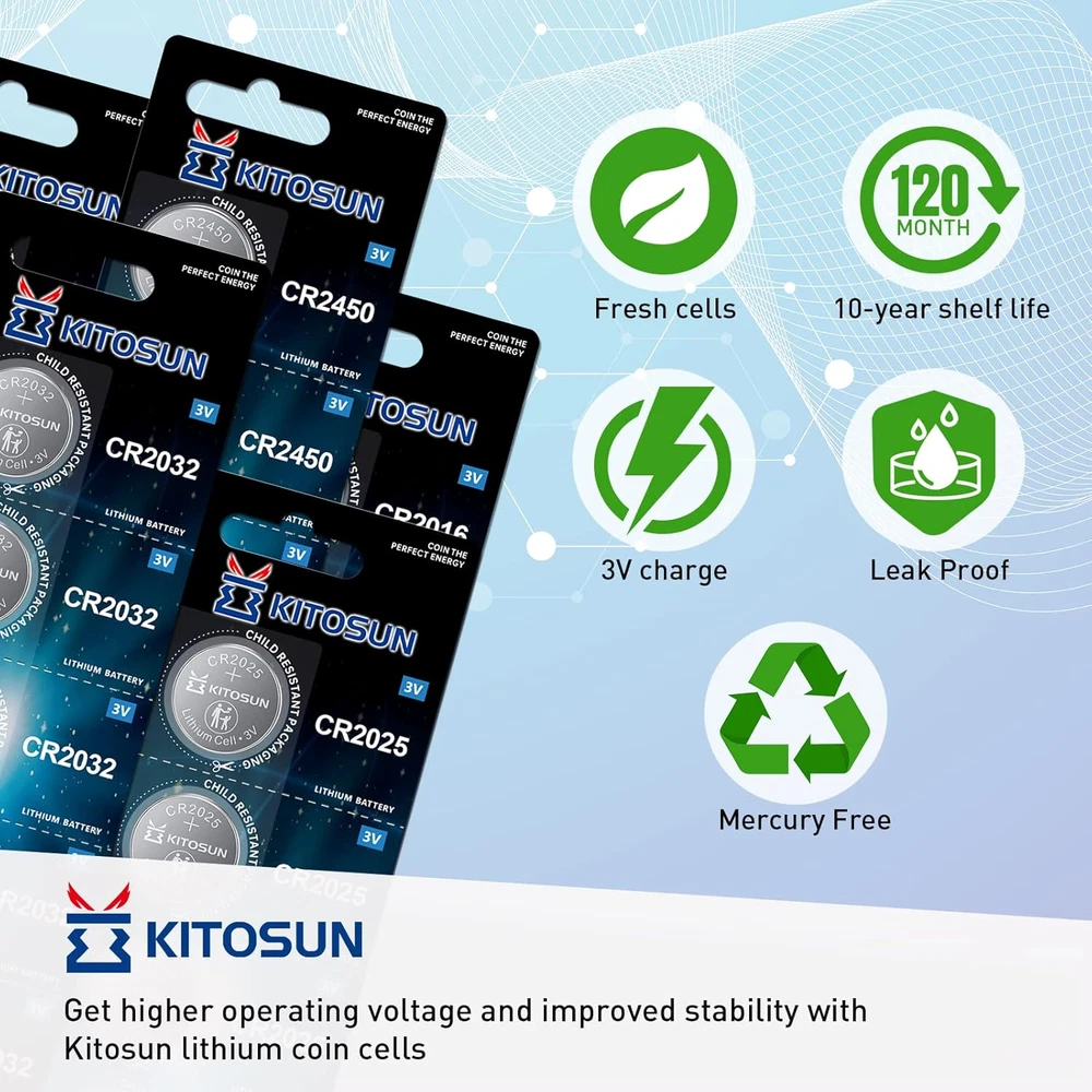 Kitosun CR2032 3V Lithium Coin Battery 5 Pack for Apple Airtag & Car Key Fob These high-performance Kitosun CR2032 batteries provide long-lasting power for various electronic devices. The batteries are engineered for reliability and compatibility with a wide range of devices like Apple Airtag, car key fobs, glucose monitors, and more. Features: High Capacity (245mAh): 10% more capacity than standard CR2032 batteries for longer-lasting power. Wide Compatibility: Works with devices like Apple Airtag, car key fobs, remote controls, glucose meters, thermometers, and LED tea light candles. Long Shelf Life: Up to 10 years of storage life, ensuring your batteries are ready when you need them. Child-Secure Packaging: Ensures safety with packaging that’s nearly impossible to open without scissors. Leak-Free and Rust-Proof: Advanced sealing technology prevents leakage, short-circuiting, and rust. Reliable Power Source: Powers both daily and essential home devices, such as remote controls, medical devices, and pet collars. Compatible with: Apple Airtag, CR2032, BR2032, DL2032, KCR2032, Energizer CR2032, and more. Thank you for viewing our Kitosun CR2032 3V Lithium Coin Battery 5 Pack for Apple Airtag & Car Key Fob.