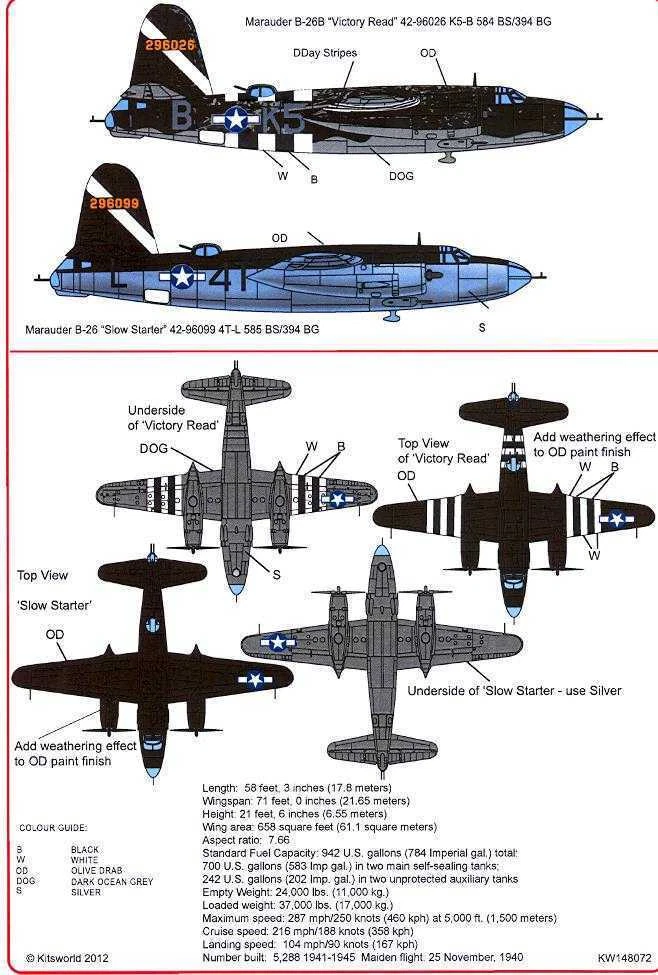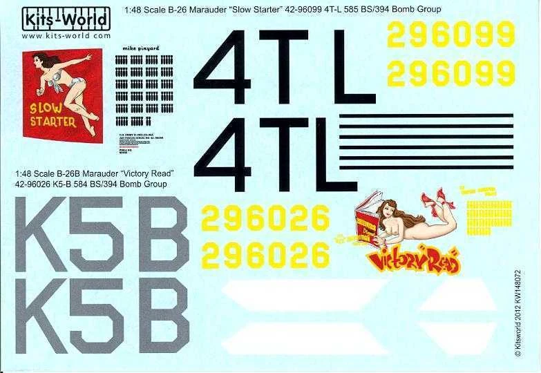 Dauntless Hobbies Item: Decal Set - Martin B-26 Marauder Company: Kits-World Stock Number: 48072 Scale: 1/48 Condition: NEW - MINT IN THE PACKAGE Offered for sale is a set of 1/48-scale decals for the American World War II Martin B-26 Marauder medium bomber, made by Kits World Decals. Markings are included for 2 DIFFERENT aircraft, including "Victory Read" from the 584th BS,394th BG, and "Slow Starter" from the 58tth BS, 394th BG. The set is NEW and MINT IN THE PACKAGE! The set includes a sheet of decals as shown in the photos, plus a full-color placement guide. The decals are brand new and in excellent condition. Please note that we always ship decals packed between two stiff sheets of cardboard to ensure safe delivery. PLEASE E-MAIL ME IF YOU HAVE ANY QUESTIONS, PRIOR TO MAKING YOUR PURCHASE. I WILL GLADLY COMBINE SHIPPING ON MULTIPLE PURCHASES! *PURCHASE TERMS* Please click on the shipping tab in the listing for the correct shipping amount for this item to your city or country. We ship WORLD WIDE to ANY country! California residents will pay California sales tax. INTERNATIONAL BUYERS...PLEASE NOTE! The U.S. Postal Service no longer offers surface mail shipping. All packages must be shipped air mail! *PURCHASE TERMS* I will gladly combine shipping on multiple purchases! I ship World-Wide to any country! California residents will pay California sales tax. INTERNATIONAL BUYERS...PLEASE NOTE! All packages must be shipped air mail! about the seller My ebay selling experience began in 1999 as a result of my long love affair with the hobby and art of plastic models. At ten years old I received my first plastic model, the Monogram Beer Wagon, from my father who owned a well-known toy store during my youth. From there, my enthusiasm led me to become an avid collector and to ultimately open Dauntless Hobbies with the goal of sharing my passion for plastic models. At Dauntless Hobbies, we strive to provide today's modeler with the finest kits and detail accessories at the best price with an emphasis on first rate service. Your total satisfaction is our primary goal, and we strive each and every day to make sure that you find the items you need and that you receive your order in great condition and in a timely manner. Dauntless Hobbies © 2016 Dauntless Hobbies