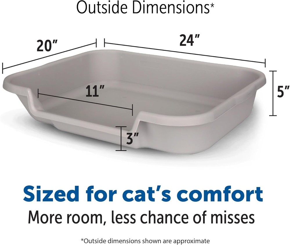 KittyGoHere Senior Cat Litter Box 1 Pack, Large Misty Gray Low Large, Product Details Item Weight: 2 pounds Manufacturer: Peck Rock Associates, Inc. Item model number: BOLYDOOM Item Package Dimensions L x W x H: 24 x 19.5 x 5 inches Item Dimensions LxWxH: 24 x 20 x 5 inches Item Weight: 2 Pounds Brand Name: NE14pets Target Audience Keyword: house-cats Model Name: litterpan Color: Gray Size: Large Material: Polypropylene (PP) Style: Standard Included Components: Cat Litter Pan Specific Uses for Product: Indoor Is Discontinued By Manufacturer : No Product Dimensions : 24 x 20 x 5 inches; 2 Pounds Item model number : BOLYDOOM Manufacturer : Peck Rock Associates, Inc. Brand: NE14pets Product Dimensions: 24"L x 20"W x 5"H With Lid: No RECOMMENDED BY VETERINARIANS FOR KITTIES WHO STRUGGLE WITH TRADITIONAL LITTER BOXES! SPECIALLY DESIGNED with senior cats, cats with arthritis, and cats fearful of enclosed spaces in mind. LOW ENTRANCE cat litter pan (just 3 inches high) makes it easy for your cat to enter and exit without jumping. OPEN TOP ENTRY LITTER BOX provides a clear view of surroundings and eliminates the need to struggle with doors and openings. MORE ROOM than standard boxes allows your cat to properly position itself in the litter box, ensuring less chance of them missing. MULTIPLE LITTER BOX SIZES available: small for cats and kittens up to 6 pounds, large for cats up to 20 pounds, and jumbo for extra-large or multiple cat households. MADE IN THE USA of durable material that is long-lasting, easy to clean, and maintain.