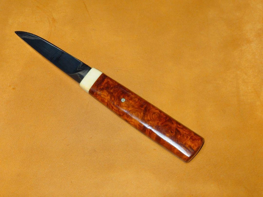 Product description This is a knife that I once received directly from Mr. Kiyoshi Kato, whom I had a chance to meet. There is only No. 1 blank paper and it cuts well. There is a KATO stamp on the base. Mr. Kiyoshi Kato says that in recent years, it has been difficult to obtain quince bulbs this red. He said. It's a masterpiece. ●Main specifications Blade length: 5.6cm Blade thickness: 3mm Handle length: 8cm Steel material: Shirogami No. 1 Handle material: Quince Accessories: Leather sheath ★Kiyoshi Kato Born in Tokyo in 1944 to a family of swordsmiths, he began training as a swordsmith at the age of 20. Although he was a swordsmith, he also showed an understanding of Western knives, and began making knives in 1977. The knives that Mr. Kato makes have the shape of Western knives, but they are made using the techniques of swordsmiths such as forge welding, forging, and folding, making them unique to Mr. Kato. The same inscription of Yoshiaki Fujiwara as his predecessor is engraved on cutlery and other cutlery such as knives. In 2000, he moved his workshop from Meguro, Tokyo to Hokuto City, Yamanashi Prefecture. ★Karinchu is a burr that is collected from a part of the root of the quince tree, a broad-leaved tree belonging to the leguminous family. It is popular as a material for high-end crafts. 【Features】 The wood grain is beautiful and creates intricate intersecting patterns. Particularly, the part with a mixture of dark and light parts is called ``Kohaku'' and is extremely valuable. ★The condition of the product is slightly scratched and dirty. For "remote delivery areas", additional fees will be chargeThese charges are normally collected by the delivering freight(shipping) company or when you pick the item up. -do not confuse them for additional shipping charges. We do not mark merchandise values below value or mark items as "gifts". -US and International government regulations prohibit such behavior.d. Import duties,taxes and charges are not included in the item price or shipping charges. These charges are the buyer's responsibility.