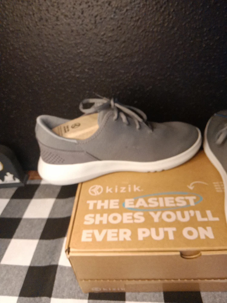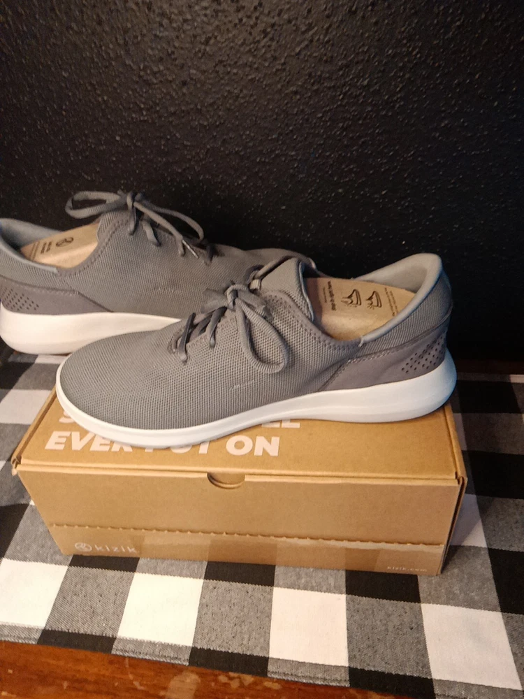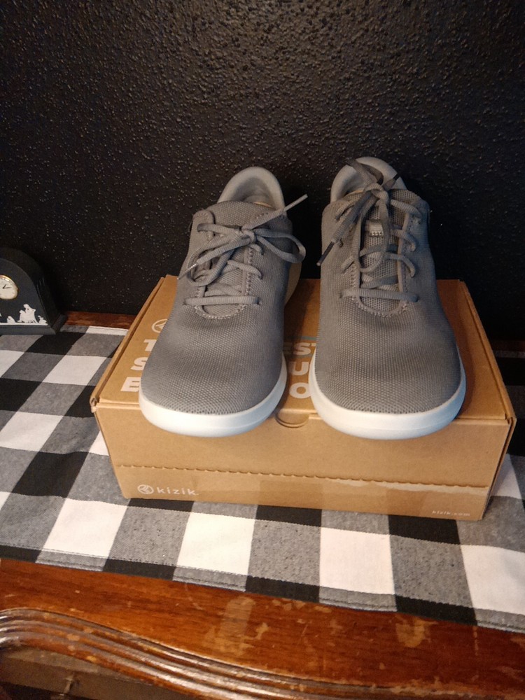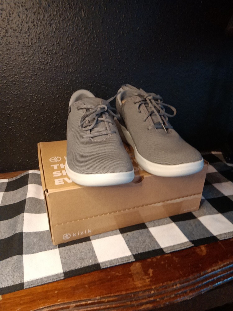 Kizik Madrid Gray Lace Up Comfort Shoes are designed for both men and women, with a size 9 for men and size 10.5 for women. These casual shoes offer easy slip-on functionality with lace-up detailing. The color is gray, providing a versatile option for everyday wear.