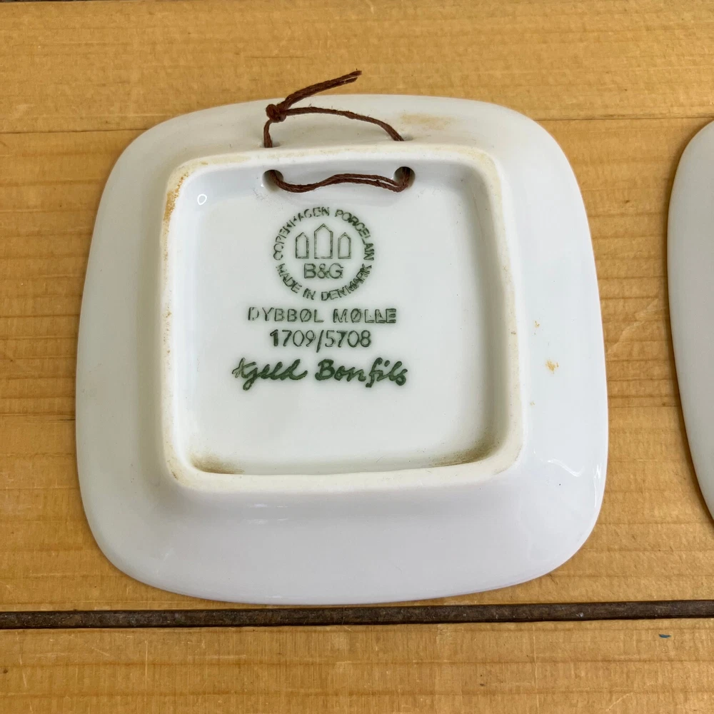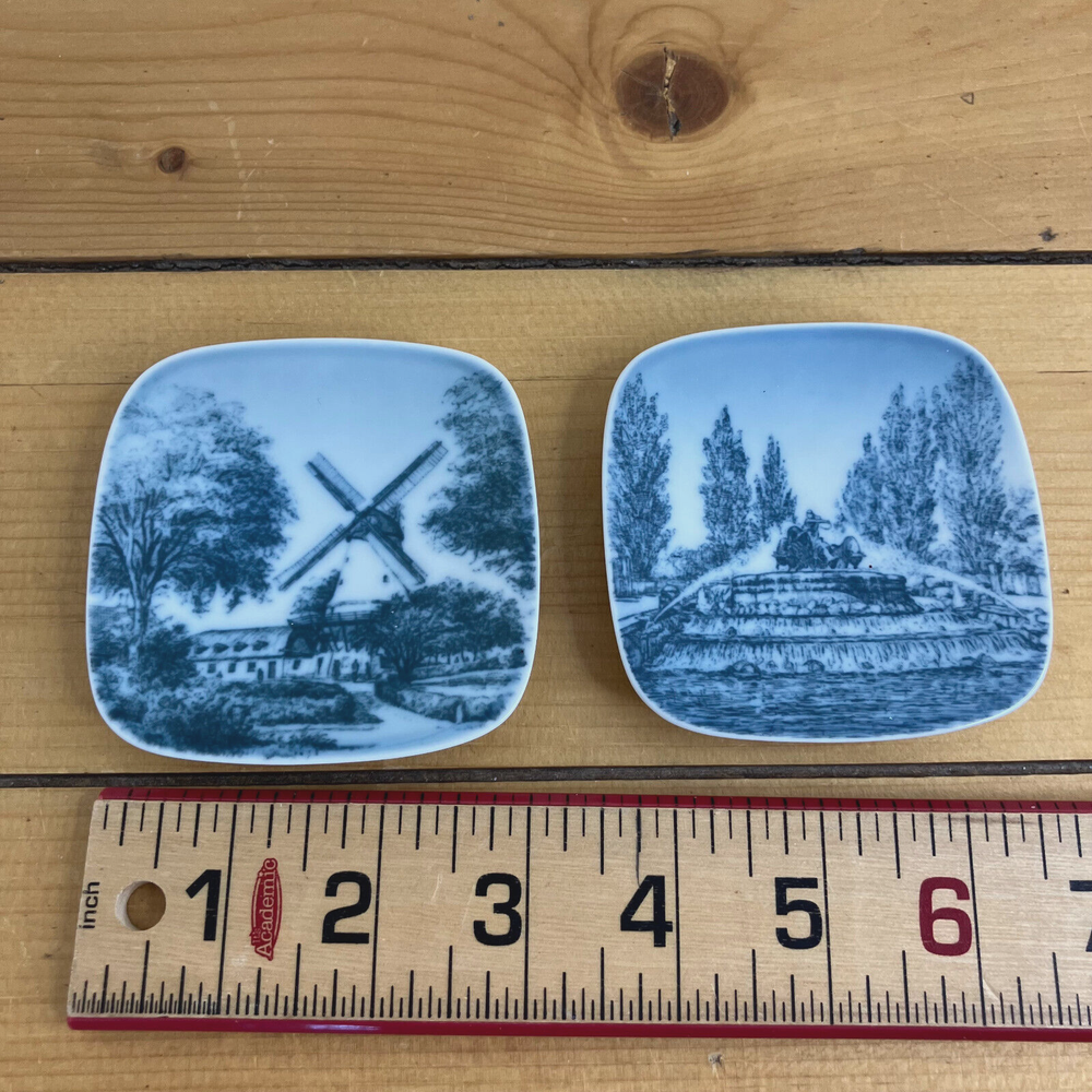 Vintage set of 2 Bing & Grondahl Coppenhagen Kjeld Bonfils mini collector plates have different countryside designs. Windmill design is numbered 1709/5708 on the back and says "Dybbol Molle". The other design number is 9714/708 and says "Gefion-Springvandet". Both are approx. 3 1/8" square. Pre-owned condition: backs have a few small marks from display. The pictures show the actual items that you will receive. Ships from Alberta, Canada. Tax applies to purchases.