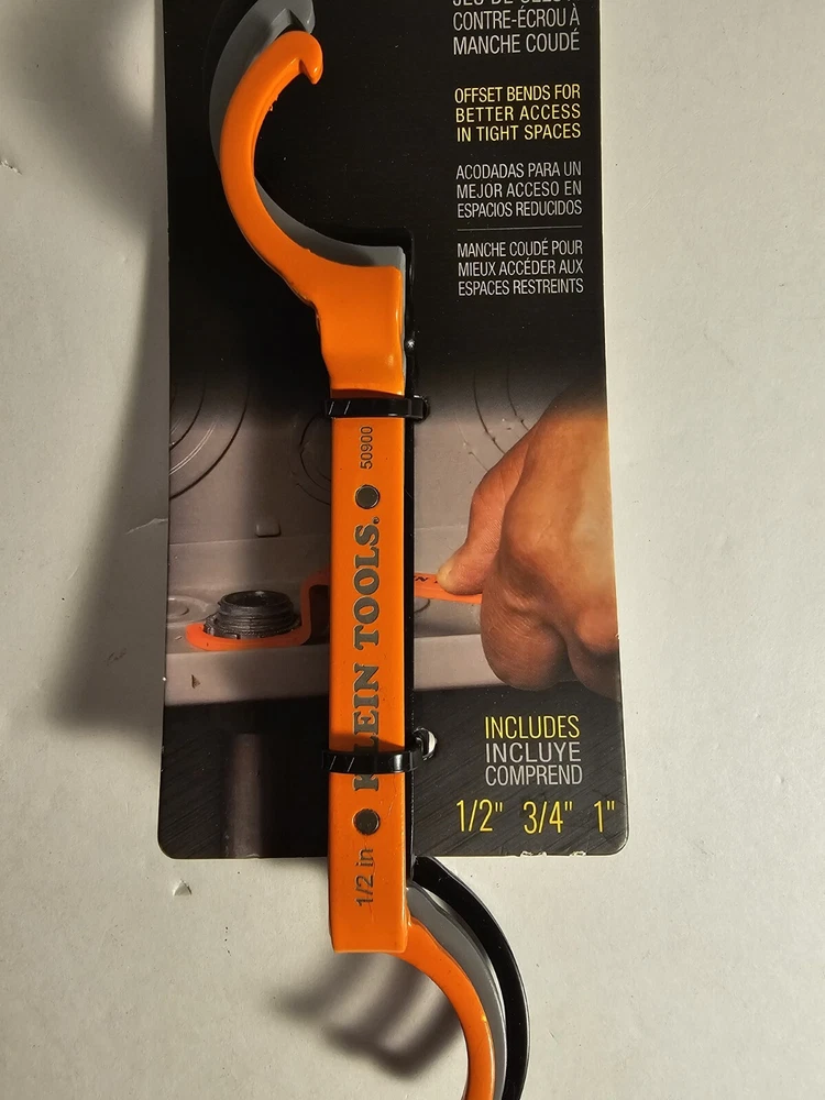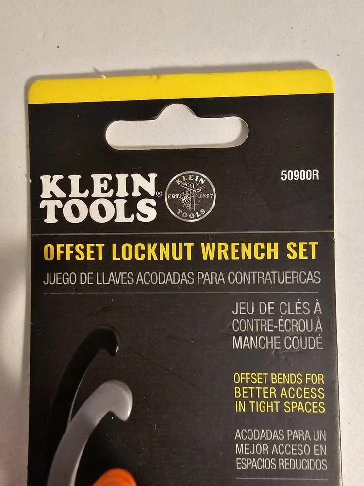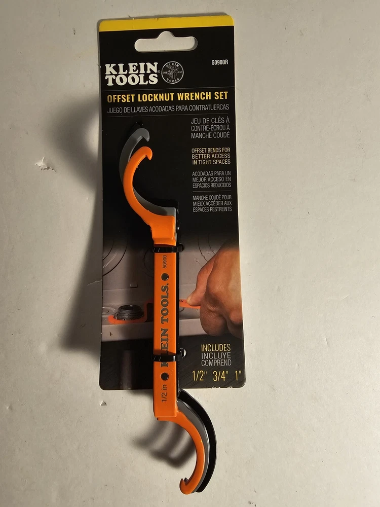 The Klein Tools 50900R Conduit Lockout Wrench Set is the perfect tool for tightening and loosening locknuts in electrical tools. This 3-piece set is made by Klein Tools, a trusted brand in the industry. The package dimensions are 8.5x2.6x1.69 inches and the weight is only 0.22 pounds, making it easy to use and transport. The wrench set comes in a multi-color design and is suitable for various electrical tools.