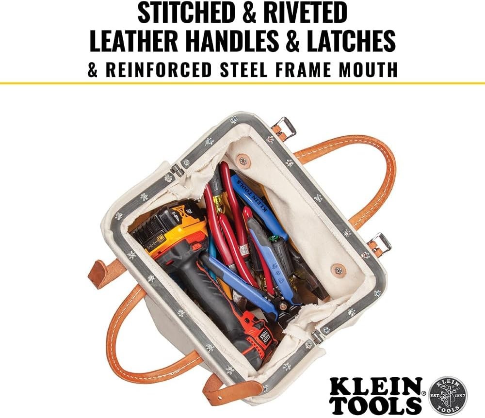 Heavy-duty No. 8 natural canvas tool bag Rivet-reinforced for durability Steel-frame mouth with hinge for rugged use Stitched and riveted leather handles for comfort and strength Two retaining straps with buckles provide secure closure Moisture resistant vinyl bottom with non-scratch feet to protect against wear Retro-fit bags with shoulder strap kit (Cat. No. 5102S). Kit includes leather strap with pad and snap hooks, rings and fasteners for attaching rings to bags On Mar 10, 2026 at 01:02:58 PDT, seller added the following information: