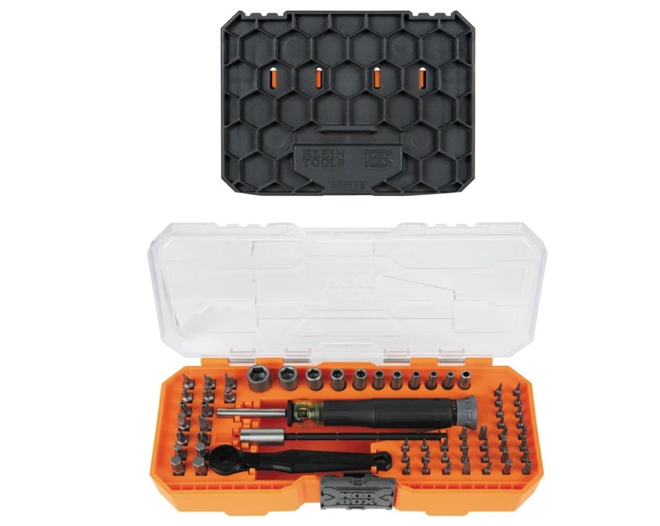 NEW Klein Tools 80177 MODbox Ratcheting Driver Set, 65 Piece VERSATILE PRECISION SET: Precision Ratchet and Driver System includes a micro-ratchet and adjustable screwdriver, 33 precision bits, 16 standard bits, 11 nut drivers, and a precision bit holder for diverse jobs LOW-PROFILE MICRO-RATCHET: Designed to maximize access in hard-to-reach applications ADJUSTABLE BIT HOLDERS: Magnetic 3.5 mm precision and standard 1/4-Inch bit holders are adjustable to equip you for any job MODULAR CASE STORAGE: Ratchet, screwdriver handle and 60 bits conveniently fit in the compact case. Case connects to other compatible Klein cases for effortless organization When you receive your order and have any queries or concerns about the product, feel free to message us. We guarantee 100% resolution for you. Our commitment is to provide high-quality products and exceptional customer service, ensuring your trust and satisfaction.