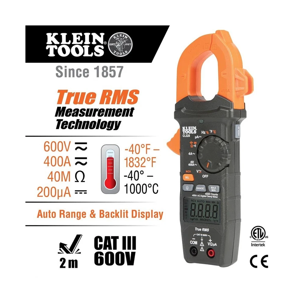 Klein Tools CL320KIT HVAC Kit for HVAC Testing; Digital Clamp Meter, Non-Contact Voltage Tester, and Infrared/Probe Thermometer Description Klein Tools HVAC Electrical Test Kit features Cat. No. CL320 Auto-Ranging, TRMS (True Root Mean Square), 400A HVAC Clamp Meter; Cat. No. IR07 Dual IR and Probe Thermometer, for both surface and air temperature measurements; and Cat. No. NCVT3P Dual Range Non-Contact Voltage Tester With Flashlight, for detection of AC voltage from 12 to 1000V with visual and audible indicators. Included is a convenient carrying pouch, test leads with CAT III/CAT IV safety caps, thermocouple, and all batteries. Features: HVAC PROFESSIONAL KIT: Includes HVAC Digital Clamp Meter, Dual IR/Probe Thermometer, and Dual Range Non-Contact Voltage Tester with Flashlight VERSATILE CLAMP METER: CL320 measures AC current and NCVT via clamp; AC/DC voltage, resistance, continuity, frequency/duty cycle, DC microamps, diode test and capacitance via test-leads; temperature via thermocouple TEMPERATURE MEASUREMENT: Dual IR Probe and Thermometer (Cat. No. IR07) measures temperature from -40 to 572F (-40 to 300C) with infrared thermometer and includes a temperature probe for air vents and ducts DIFFERENTIAL TEMPERATURE: Calculate differential temperature (T1-T2) using both IR and probe temperatures, with a hands-free hanging hook for the temperature probe VERSATILE VOLTAGE DETECTION: Dual-range Non-Contact Voltage Tester (Cat. No. NCVT3P) detects voltage from 12 to 1000V AC or 70 to 1000V AC with visual and audible indicators BRIGHT FLASHLIGHT: Integrated flashlight illuminates the work area and can be used independently of the voltage detection function NOTE ON USAGE: IR07 Thermometer is not intended for medical or animal use, and it is designed for professional HVAC applications Product Details: Brand: Klein Tools Power Source: Battery Powered Style: Test Kit Color: Black, Orange Item Weight: 1.58 Pounds Is Discontinued By Manufacturer : No Product Dimensions : 1 x 1 x 1 inches; 1.58 Pounds Item model number : CL320KIT Department : Unisex-Adult Date First Available : March 19, 2021 Manufacturer : Klein Tools Country of Origin : China Best Sellers Rank: #12,083 in Industrial & Scientific (See Top 100 in Industrial & Scientific) #11 in Clamp Meters #11 in Clamp Meters Handling We will ship all orders within 3 / 5 business day of payment. Delivery We Do Not Ship Outside of the Continental US. Return Policy All items qualify for returns within 30 days of receipt. Buyer is responsible for return shipping on any item that is not damaged. Feedback We take our reputation seriously, we buy and sell online, so we understand the value of trust. If you are unsatisfied with your order, please contact us and we will work with you to resolve it to your satisfaction.