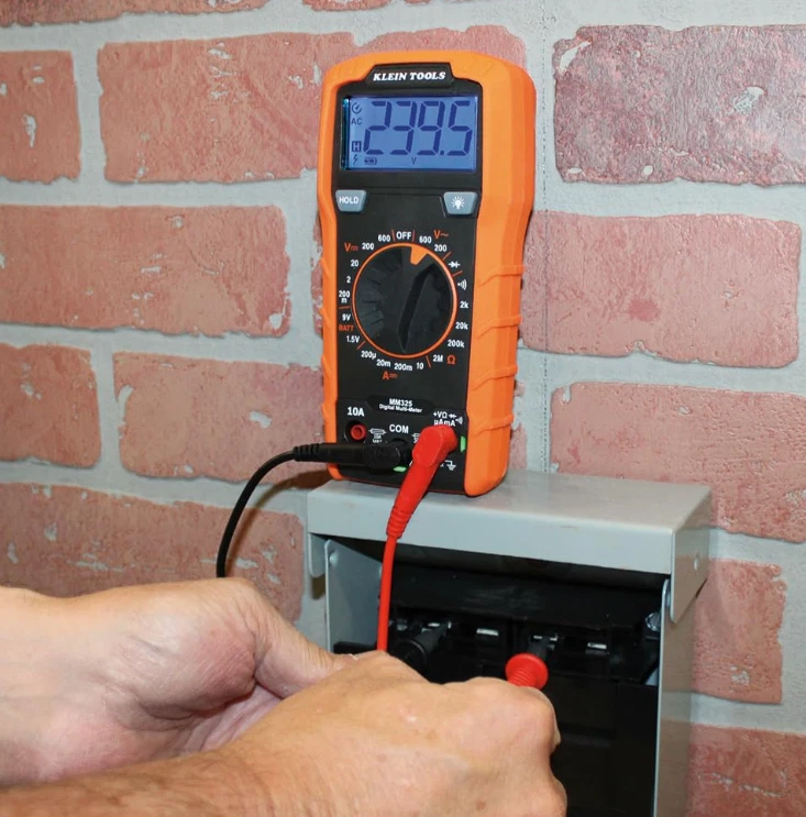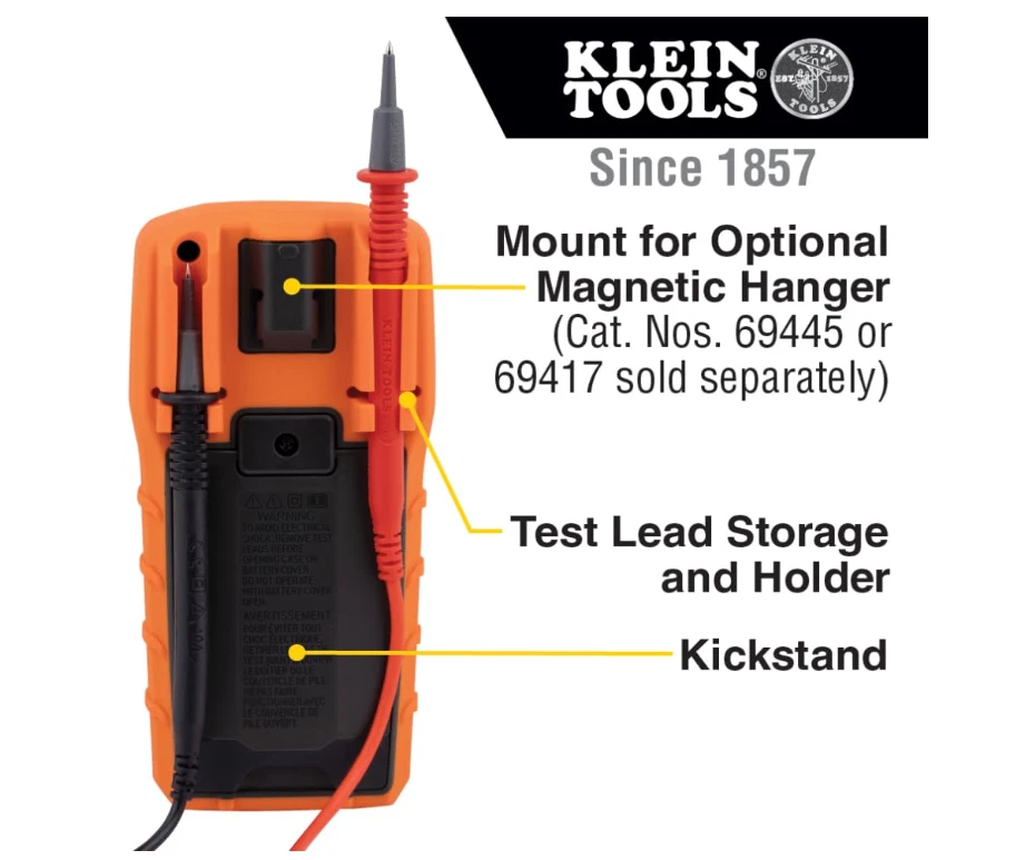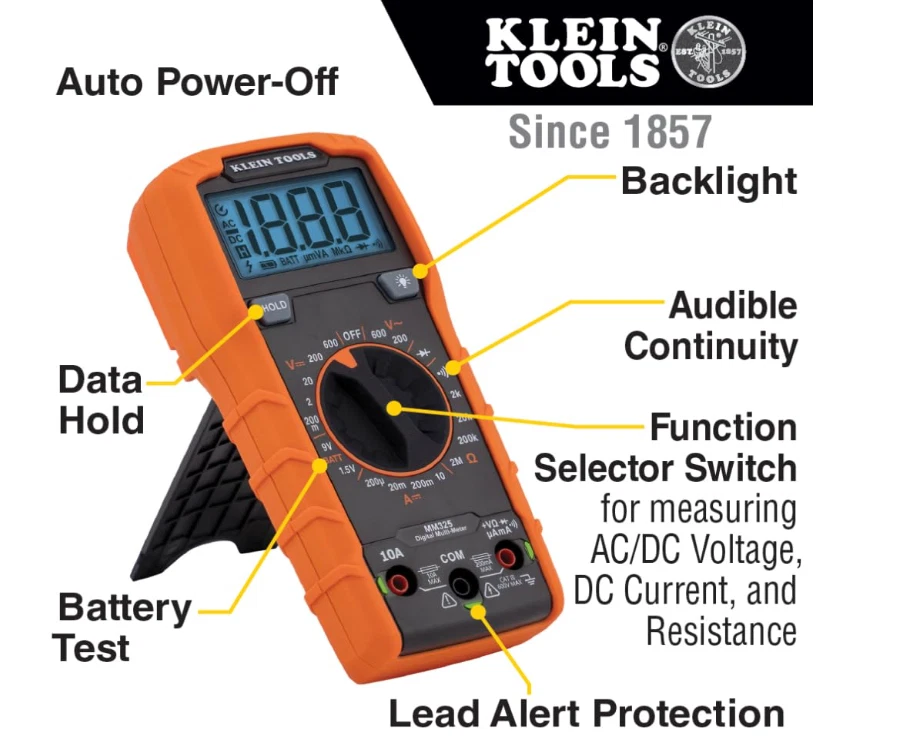 Klein Tools MM325 Multimeter: Digital 600V Voltage Tester for Batteries, Current, Resistance, Diodes VERSATILE FUNCTIONALITY: Measures AC/DC voltage up to 600V, 10A DC current, 2MΩ resistance; additional features include continuity, diode test and battery test LEAD-ALERT PROTECTION: LEDs on the meter illuminate to indicate proper test lead placement, enhancing accuracy and safety during measurements BACKLIT DISPLAY: LCD shows clear readings in low-light conditions for enhanced visibility BATTERY TEST: Battery test mode can be used for checking if batteries are working CONVENIENT FEATURES: Test lead holders on the back of the meter, kickstand and optional magnetic hanger (Cat. Nos. 69445 or 69417) for hands-free operation DURABLE CONSTRUCTION: Built to withstand a 6.6-Foot (2 m) drop, for use in basic and controlled electromagnetic environments such as residential, business and light-industrial locations When you receive your order and have any queries or concerns about the product, feel free to message us. We guarantee 100% resolution for you. Our commitment is to provide high-quality products and exceptional customer service, ensuring your trust and satisfaction.