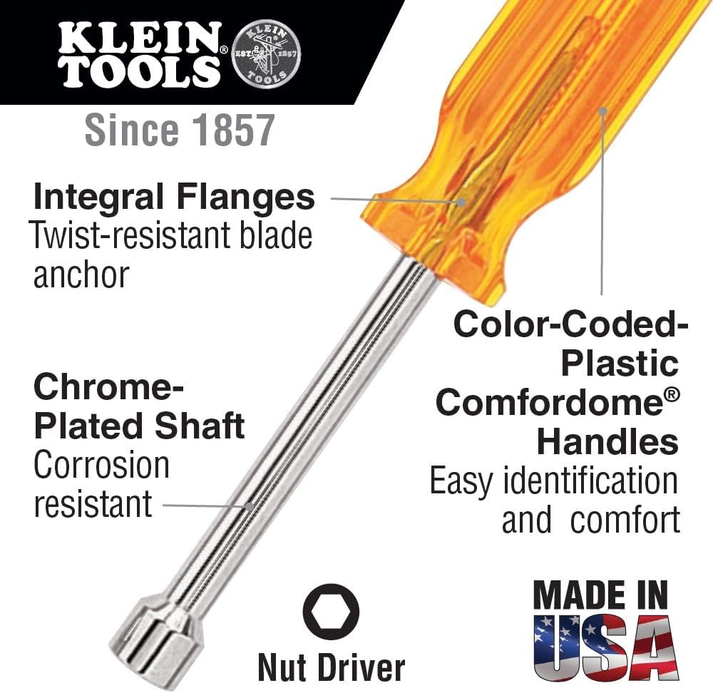 Klein Tools S86 1/4-Inch Nut Driver with 6-Inch Hollow Shaft 1/4-Inch, Red Product Details Color: Red Brand: Klein Tools Material: Steel & Plastic Grip Item Length: 9.63 Inches Item Weight: 2.4 Ounces Item Package Quantity: 1 Head Style: Box End Finish Type: Powder Coated Operation Mode: Mechanical Is Racheting: Yes Is Non Sparking: Yes End Style: hang hole Manufacturer: Klein Tools Wrench Length Style: standard Part Number: S86 Item Weight: 2.4 ounces Item model number: S86 Is Discontinued By Manufacturer: No Size: 1/4-Inch Style: Non-Magnetic Finish: Powder Coated Measurement System: Inch Included Components: Tools & Accessories Batteries Included?: No Batteries Required?: No Color: Red Brand: Klein Tools Material: Steel & Plastic Grip Item Length: 9.63 Inches Item Weight: 2.4 Ounces Nut Driver reaches into deep recesses Fits over extra-long bolts and studs Smooth Comfordome handles fit the palm of the hand comfortably and are color-coded for easy identification Hollow shafts facilitate work on stacked circuit boards or other long bolt applications Made in USA Chrome-plated shaft helps prevent corrosion Internal flanges provide solid, twist-resistant shaft anchor Product Description Get to those deeply recessed bolts and studs with Klein's 6'' (152 mm) nut driver. The hollow shaft fits over extra-long bolts and studs. The smooth Comfordome handle fits comfortably in the palm of the hand. The red handle helps to identify this tool quickly. For more than 160 years, Klein Tools has manufactured premium-quality, professional-grade hand tools that deliver the performance, durability and precision needed to get the job done right. Our family of engineers, workers and craftsman continue to put six generations of expertise into every tool we create by using only the highest quality materials, superior workmanship, and keeping manufacturing as close to home as we can. Klein isn't just the name of our company, it's also our family name. And since we're an American company that's family-owned and family-run, you know you can count on us to be here tomorrow. Klein Tools doesn't just make great products, we make great products that stand up to the demands of the professionals who use them every day ... Since 1857. From the Manufacturer Klein S86 1/4-Inch Individual Nut Driver-6-Inch-Shank. The Klein S86 1/4-Inch Individual Nut Driver-6-Inch-Shank reaches into deep recesses and fits over extra-long bolts and studs. The Klein S86 1/4-Inch Individual Nut Driver-6-Inch-Shank also features Smooth Comfordome handles that fit the palm of the hand comfortably, handles that are color-coded for easy identification, hollow shafts that facilitate work on stacked circuit boards or other long bolt applications, chrome-plated shaft that helps prevent corrosion, internal flanges that provide solid, twist-resistant shaft anchor, and applicable ASME/ANSI specifications.