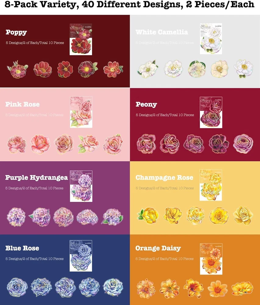 Knaid 80 Pieces Large Size Flower Stickers with Gold Holographic Multicolored Product Details Brand: Knaid Color: Multicolored Item dimensions L x W x H: 5.4 x 3.3 x 0.6 inches Recommended Uses For Product: Scrapbook, Journal, Mixed Media Art, Collages, Decoupage, Photo Albums, Paper Crafts, Handmade Cards, Home Decor, Wall Decals Theme: Flower Cartoon Character: Flower Special Feature: Waterproof Number of Pieces: 80 Style: Vibrant Colors Embellishment: Glitter Age Range (Description): Adult Reusability: Single Use Item Form: Sticker Pattern: Floral Indoor/Outdoor Usage: Indoor Finish Type: Polished Water Resistance Level: Waterproof Number of Items: 80 Target Audience: Adult Product Dimensions: 5.4 x 3.3 x 0.6 inches Item Weight: 3.2 ounces Manufacturer: Knaid Country of Origin: China Item model number: KDPP076 Recommended Uses For Product: Scrapbook, Journal, Mixed Media Art, Collages, Decoupage, Photo Albums, Paper Crafts, Handmade Cards, Home Decor, Wall Decals Scrapbook, Journal, Mixed Media Art, Collages, Decoupage, Photo Albums, Paper Crafts, Handmade Cards, Home Decor, Wall DecalsScrapbook, Journal, Mixed Media Art, Collages, Decoupage, Photo Albums, Paper Crafts, Handmade Cards, Home Decor, Wall Decals See more Surface RecommendationMaterial: Paper, Window, WallPolyethylene Terephthalate ShapeUnit Count: Irregular80.0 Count 80 large floral stickers with gold holographic outlines for gorgeous decor Vibrant colors with fine metallic detailing create a stunning rainbow effect Approximately 3 inches wide for big, bold floral impact Ideal for scrapbooking, journals, paper crafts, gift tags, party favors, and more Thoughtful gift for craft enthusiasts, journal lovers, and floral decor fans