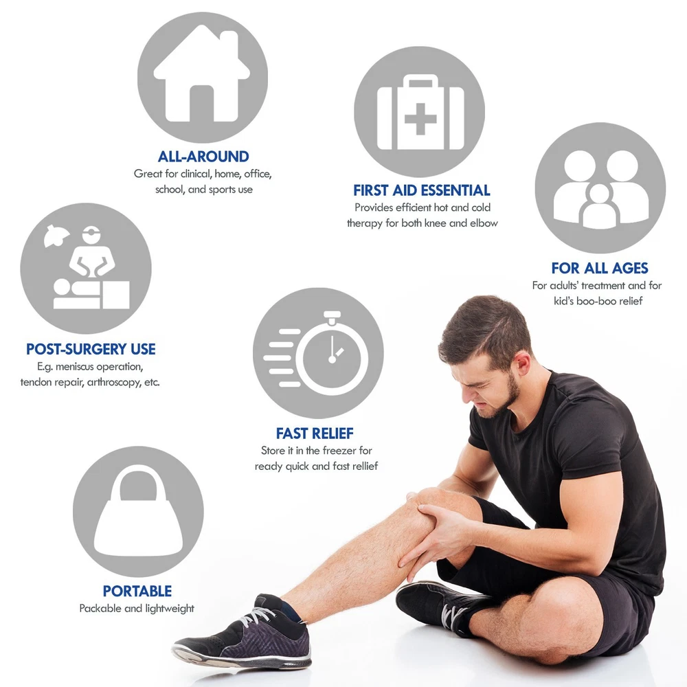 Knee & Elbow Wrap with Gel Ice Pack by An effective all-around solution for your knees and elbows: comfort, circulation, compression, mobility, support and pain relief! FEATURES ✓ Help support full natural movement, circulation and compression on your knee or elbow. ✓ Designed as an adjustable one-size-fits-all wrap that has opposite straps with strong fastener closures to help secure and tighten it in place comfortably. ✓ Front circular opening promotes proper motion and help reduce pressure on the patella / joint. ✓ Includes an inside pocket to insert the included flexible gel ice pack — perfect for hot or cold therapy on your limbs! ✓ Useful for pain relief and recovery from meniscus tear, ACL, tendonitis, tennis elbow, arthritis, runner's knee, swelling, surgery, muscle strain, and more. CONTENTS - 1 piece of adjustable latex-free wrap made of stretchable neoprene (65%), nylon (20%) and polyester (15%) that is 32.5" long and 10.5" wide - 1 non-toxic reusable gel ice pack contained in leak-proof nylon (7.3" x 8.5") which can be used for both hot and cold therapy. ADDITIONAL NOTES - To clean the wrap, handwash it gently in cold water with mild detergent and dry it flat. Do NOT iron. - For gel ice pack, limit application to only 20min at a time and repeat every 2 hours as needed. - Gel will become too hard in sub-zero freezers; let it thaw a bit before use. OUR GUARANTEE ✓ PREMIUM products, SECURE checkout and OUTSTANDING customer service. Please get in touch with us for any inquiries or concerns. ✓ 1-Year Warranty (FREE No-Hassle Replacement!) Gain the best support for your knee& elbow — buy this wrap NOW before our SALE expires! 2-IN-1 FEATURE KNEE & ELBOW WRAP WITH HOT & COLD THERAPY GEL ICE PACK: A one-size-fits-all wrap for your knee or elbow that will help promote full natural movement, circulation, compression, and recovery. Plus, with the inclusion of a non-toxic reusable gel ice pack (7. 3" x 8. 5") which you can insert in the wrap's inner pocket, the wrap will transform into an effective hot or cold pack that's suitable for pain relief.