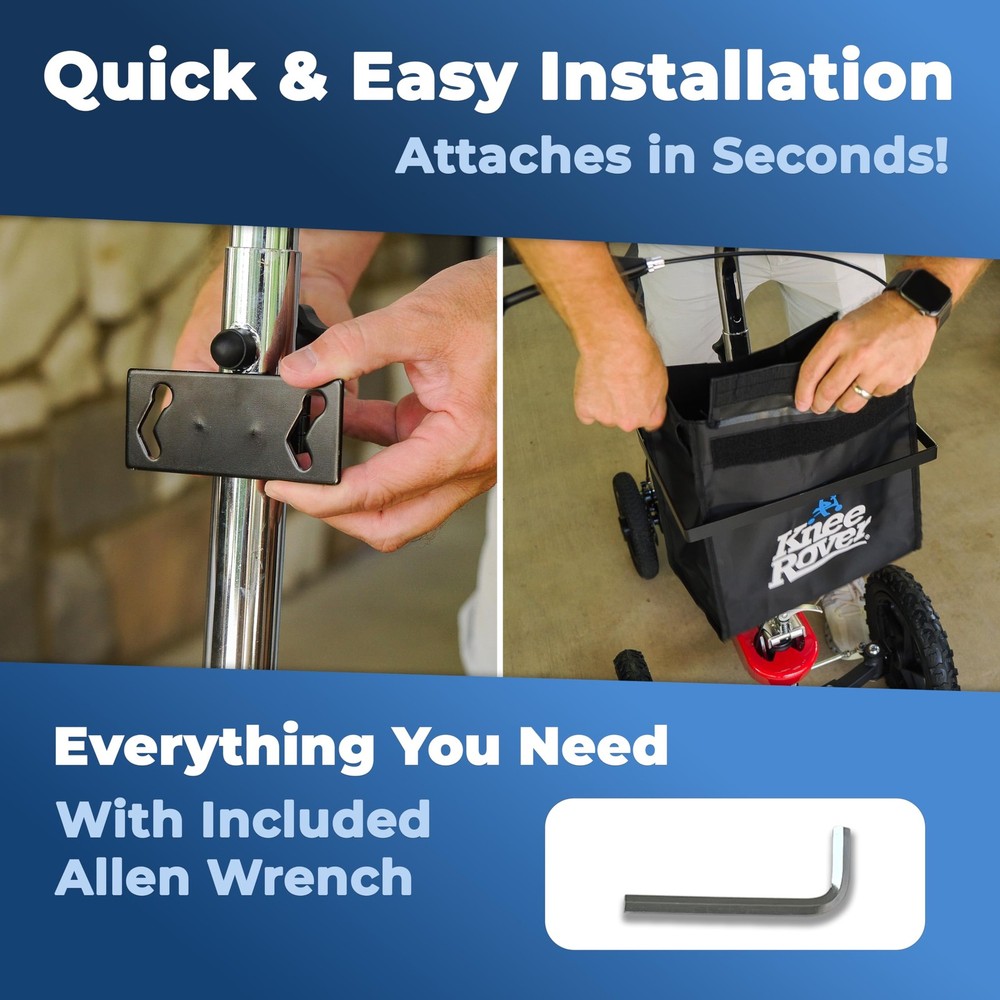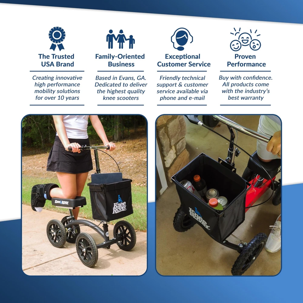 KneeRover Deluxe Knee Scooter Basket Accessory with Large Capacity - Knee Rover THE PROVEN USA BRAND: KneeRover has been creating innovative, high performance mobility solutions for over 10 years, including the original All Terrain and Pediatric knee scooters. We are a family-oriented business based in Evans, Georgia USA - dedicated to delivering the highest quality knee scooters and providing exceptional customer service (available via phone and email). All our products come with a 100% satisfaction guarantee and the best warranty in the industry. SPACIOUS AND INSTALLS IN SECONDS: Extra-large KneeRover knee scooter basket is 11” x 8” x 11” and has room for all your important belongings. The included clamp attaches to your knee scooter’s steering column in seconds. Easy to detach and reattach for portability. FITS MOST KNEE SCOOTER MODELS: Included Universal mounting kit fits most knee scooter walker models, including all Knee Rover models that don’t include a basket (Economy, GO, PRO, QUAD, and FUSION models). HOLDS UP TO 15 POUNDS: Heavy duty basket is reinforced to support up to 15 lbs and can hold all your everyday items while you navigate. The KneeRover knee walker basket also has a durable weather-resistant construction. CONVENIENT STORAGE: The KneeRover Deluxe Basket Accessory is the largest Knee Rover basket available. The collapsible design allows for easy access to the knee scooter folding mechanism when needing to transport or store your knee scooter crutch alternative. Shipping We offer FREE shipping on all orders! We ship within Three business days of payment, usually sooner. We use a selection of shipping services such as UPS, FedEx, USPS etc. We only ship to the lower 48 states, no APO/FPO addresses or PO Boxes allowed. Local pickups and combined shipping options are not provided at this time. Return You can return a product for up to 30 days from the date you purchased it. Any product you return must be in the same condition you received it and in the original packaging. Please keep the receipt. Payment We accept payment by any of the following methods: PayPal Please pay as soon as possible after winning an auction, as that will allow us to post your item to you sooner! Feedback Customer satisfaction is very important to us. If you have any problem with your order, please contact us and we will do our best to make you satisfied. Contact Us If you have any queries, please contact us via ebay. We usually respond within 24 hours on weekdays. Please visit our eBay store to check out other items for sale! Thank you for shopping at our store.