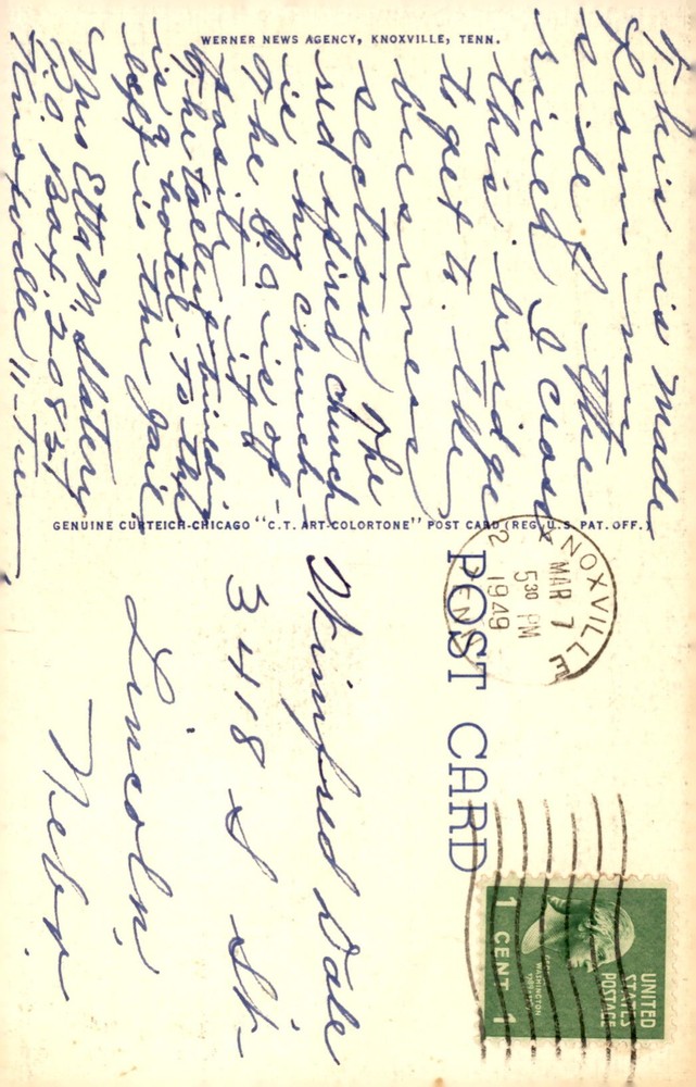 View of Knoxville's skyline at night, captured from the Werner News Agency. The postcard shows the city's illuminated buildings, with a bridge leading to the residential area.