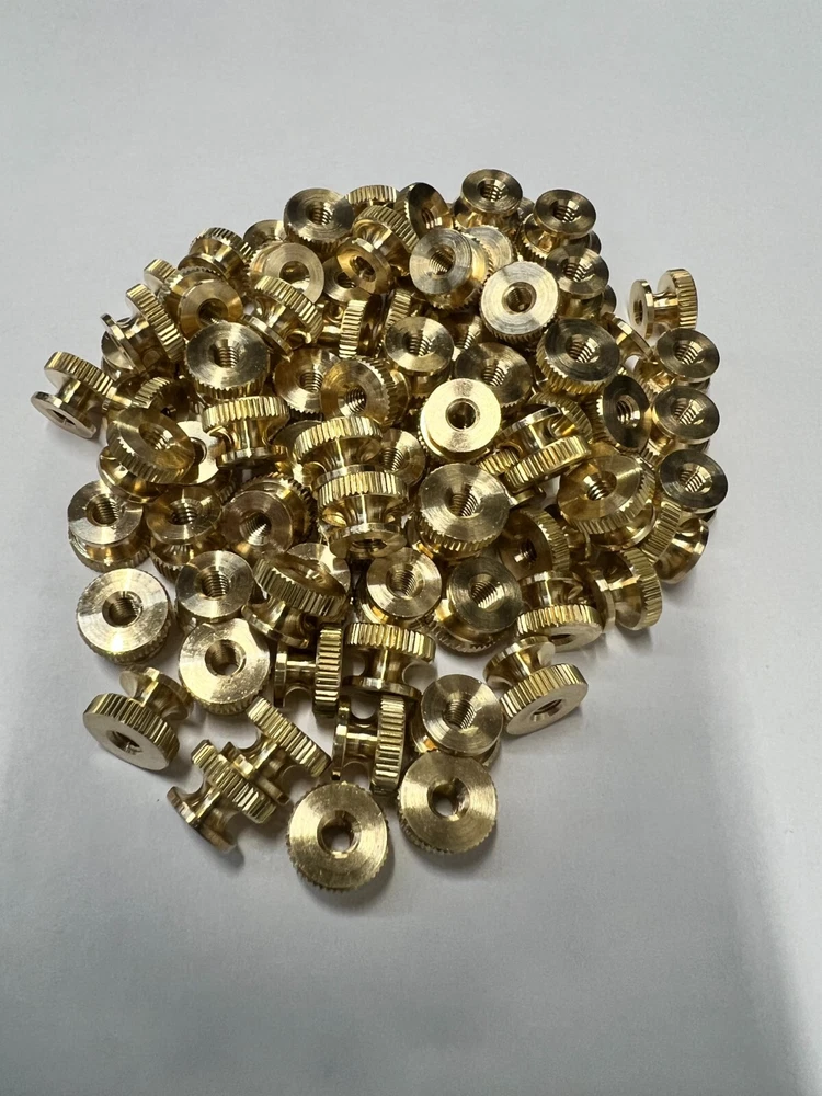 This pack of 100 Knurled Thumb Nuts by Sperry Automatics Co is a must-have for any industrial workspace. These brass nuts have a 8-32 thread size and are 9/32" in length, making them perfect for a range of applications. The knurled head design allows for easy gripping and tightening by hand, without the need for additional tools. These thumb nuts are great for securing components in place and can be used in a variety of machinery. OAL = .281 Knurled OD Diameter = .437 Shoulder Diameter = .375 Thread Size = 8-32 2B Qty = 100 MADE IN USA 7213B