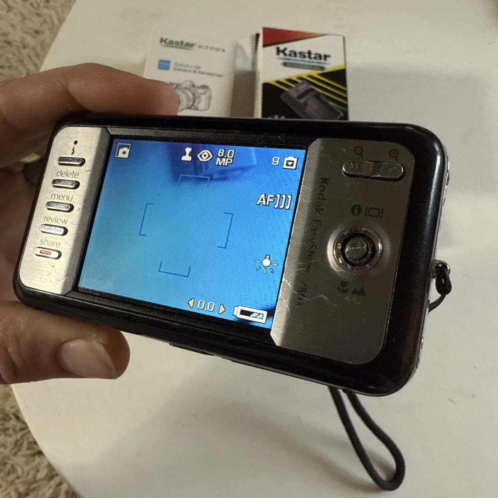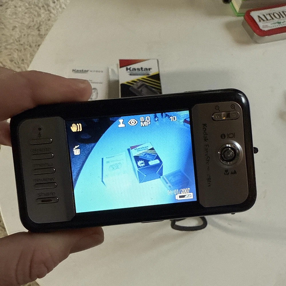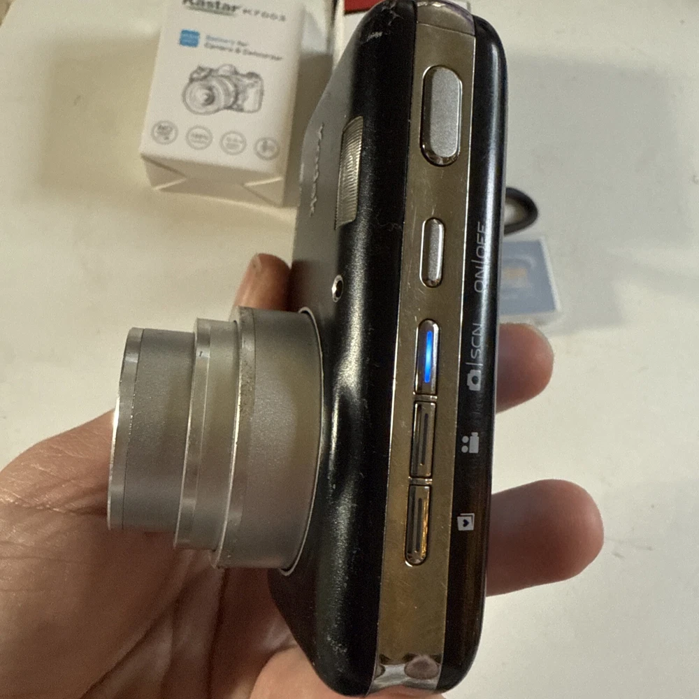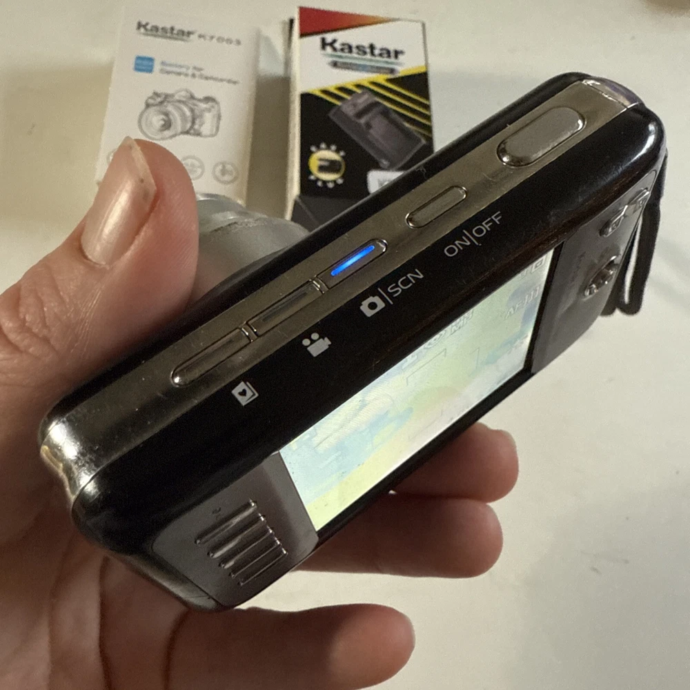 I got this in a camera lot. I ordered an aftermarket battery and charger for it . It turned right on when installing new battery I did not test original battery that came with it, but it is included in the lot . When turned on, it makes kind of a ticking sound. It’s not constant. It kind of goes on and off. I was able to take a photo and scroll through the menu . Screen has a blue color to it. I’m nervous selling this as used working that it’s going to be returned so I am selling it for parts or repair . Camera, one gigabyte, memory card, aftermarket, battery, and charger and original battery included in lot .